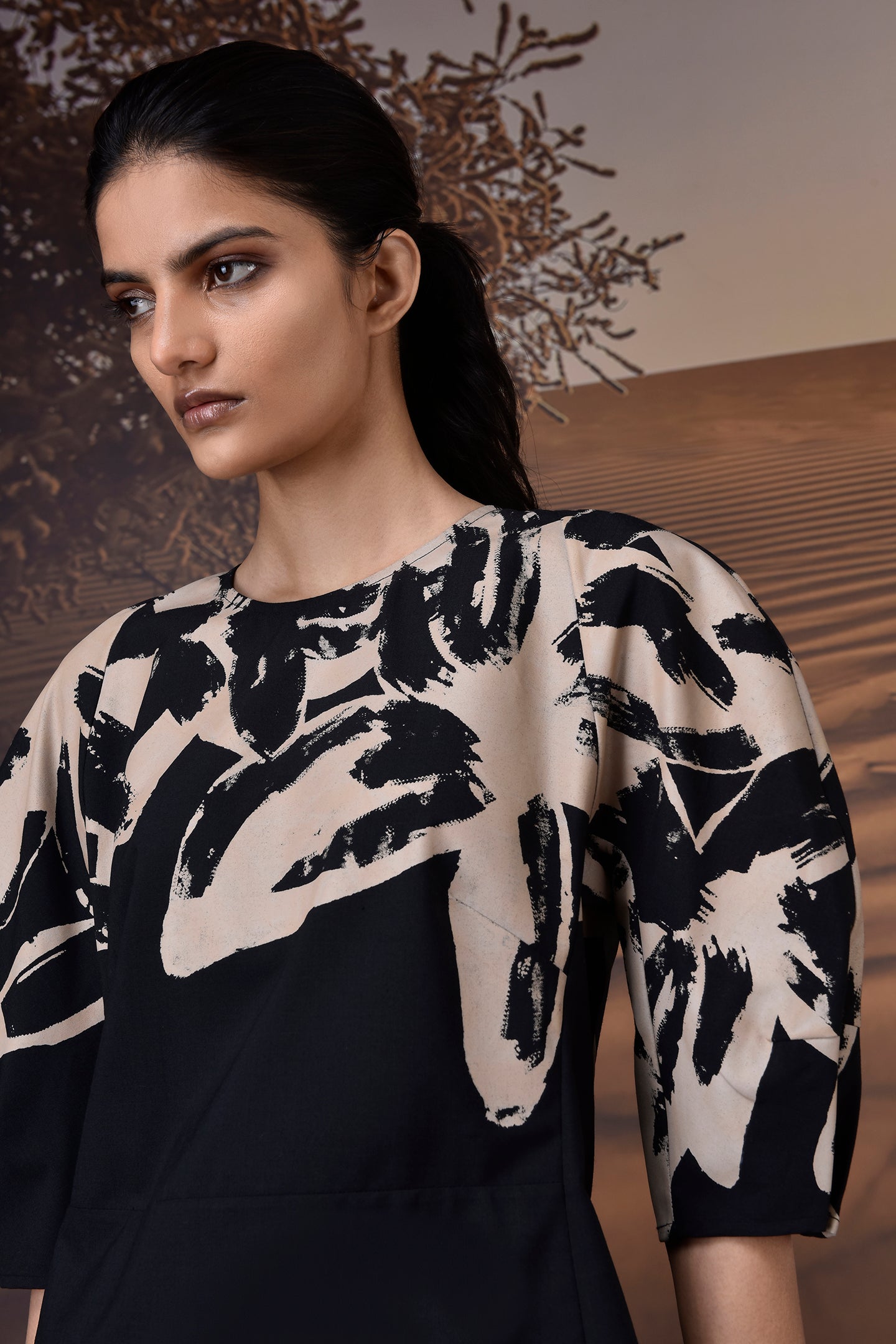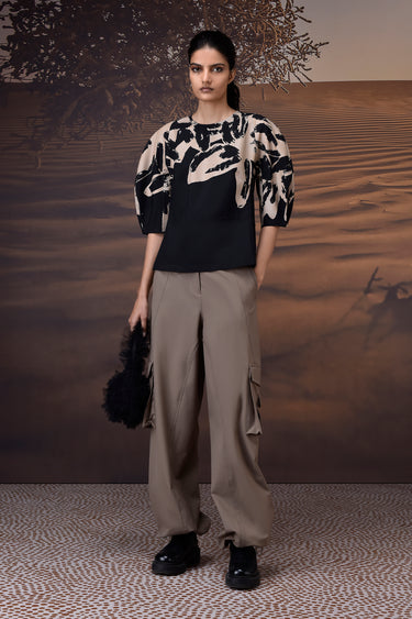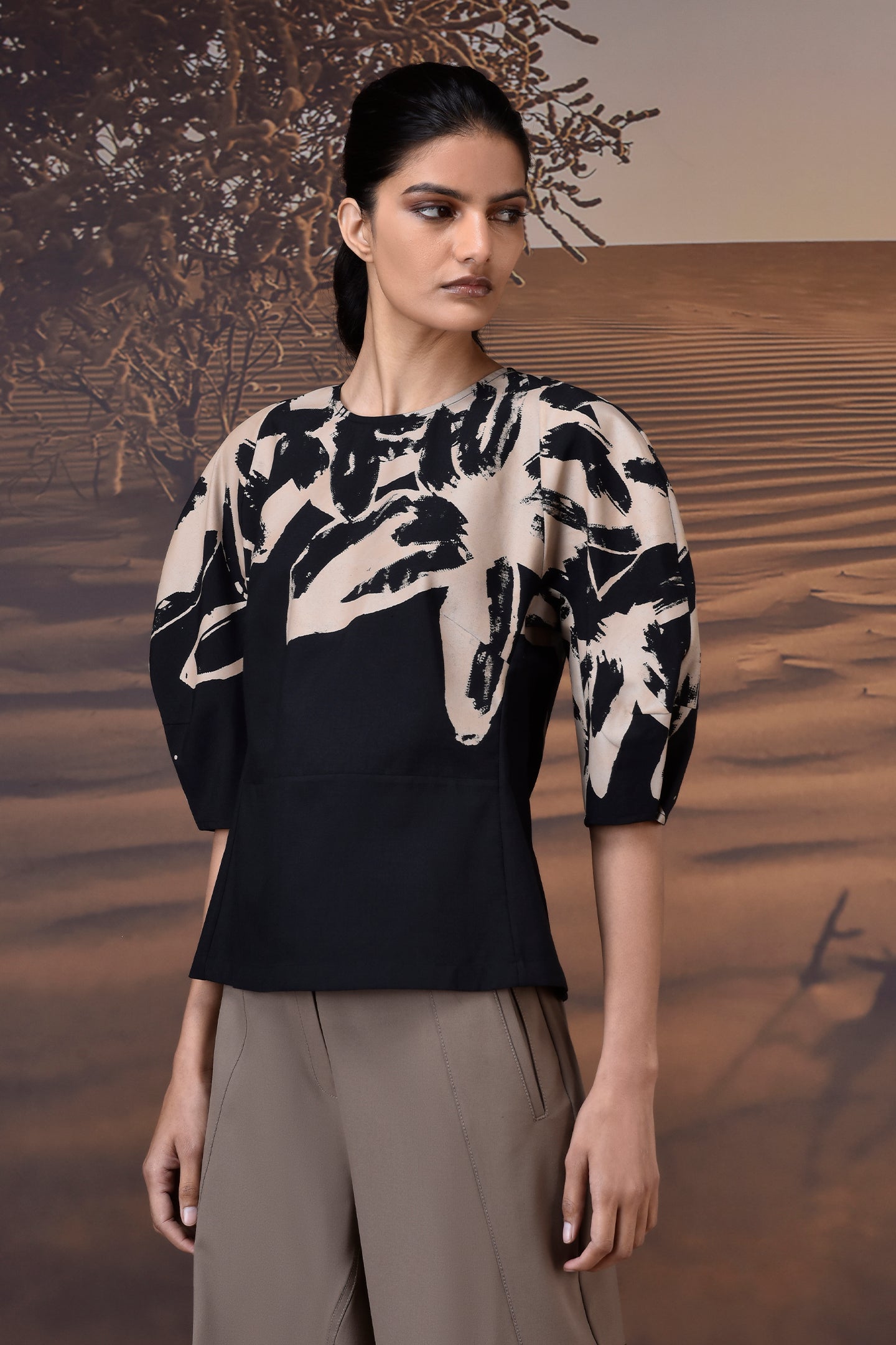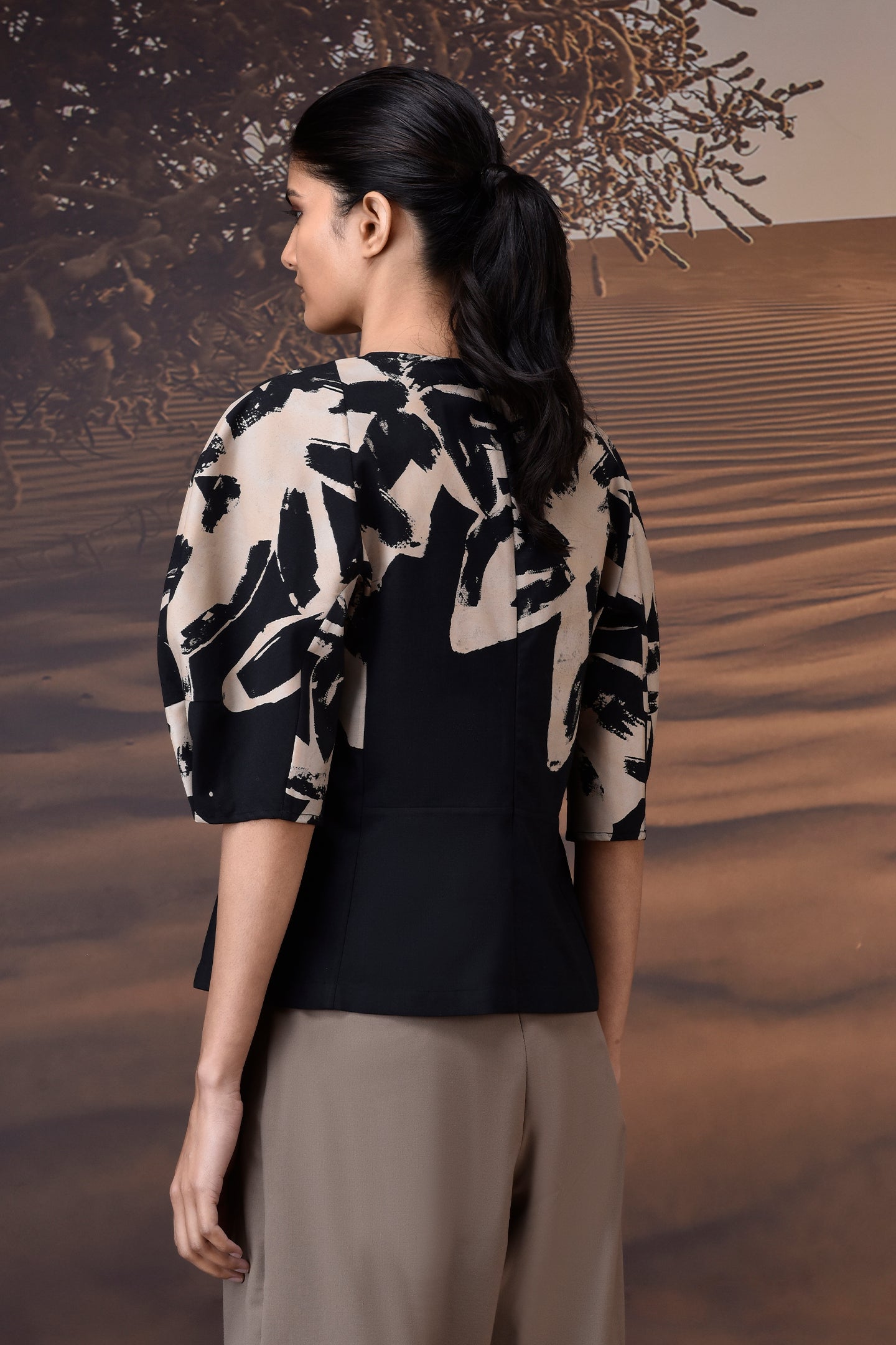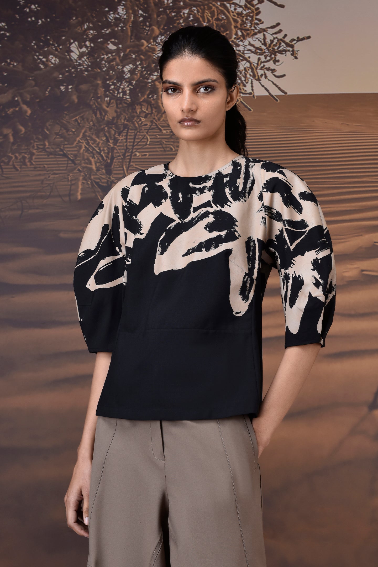 This sculptural black top is crafted in a refined poly wool blend, detailed with expressive brushstroke patterns in soft beige tones. Structured with bold volume sleeves and clean panel lines, it brings sharp contrast and quiet drama to your everyday wardrobe.