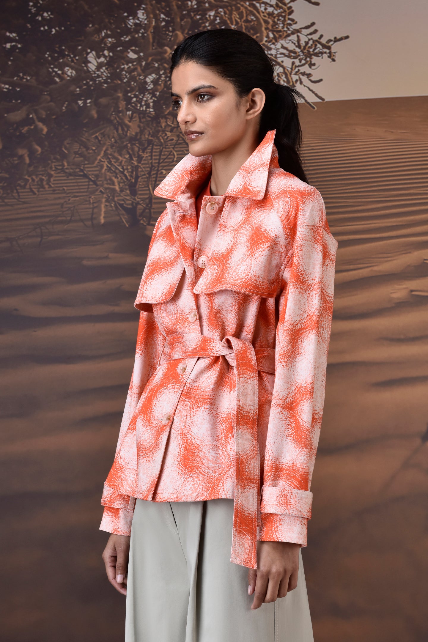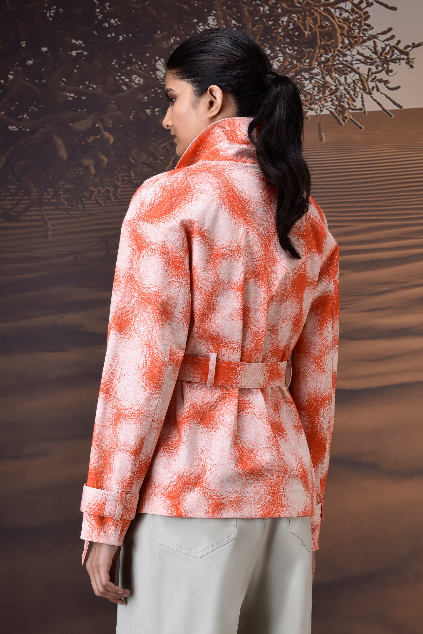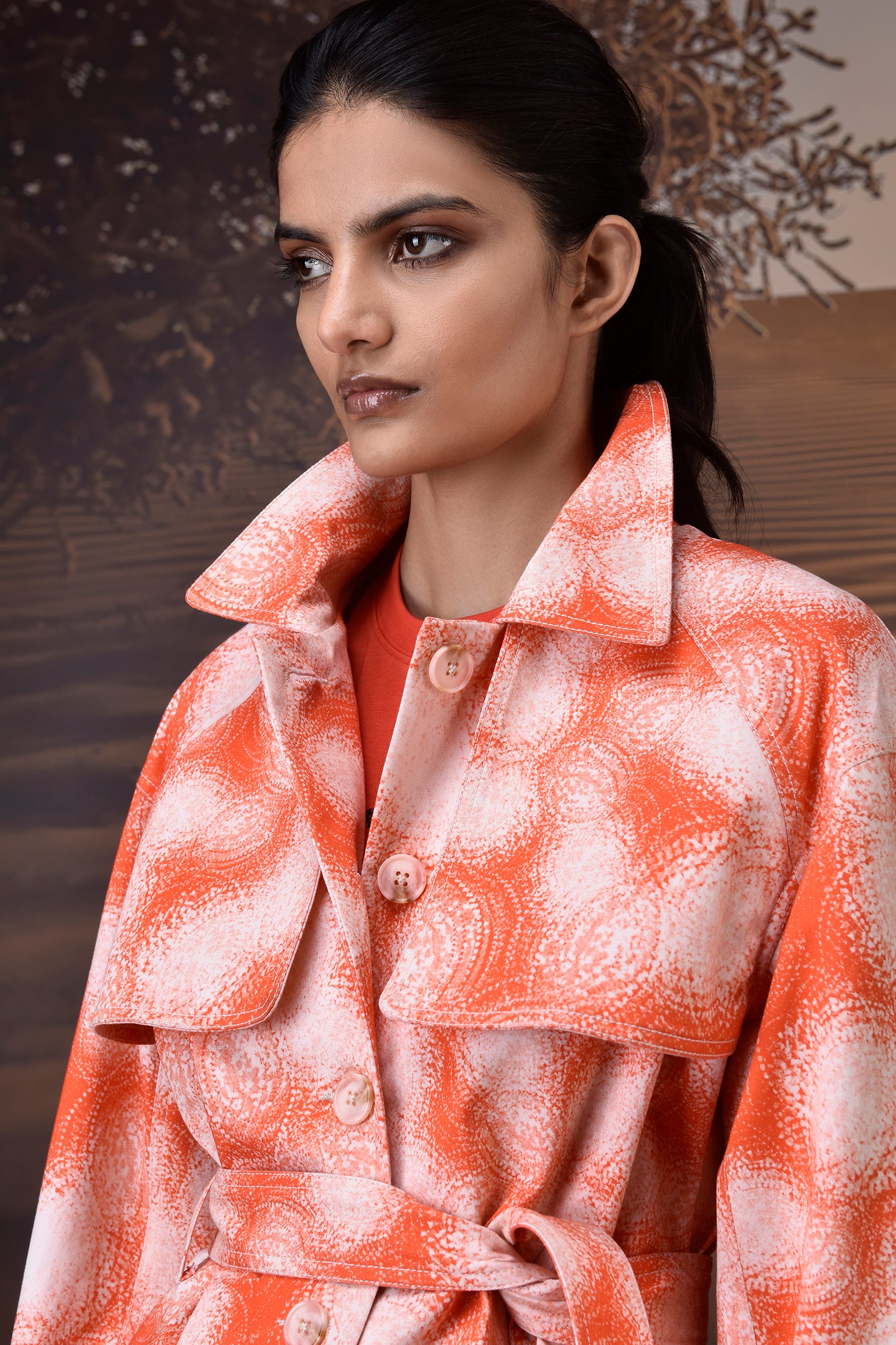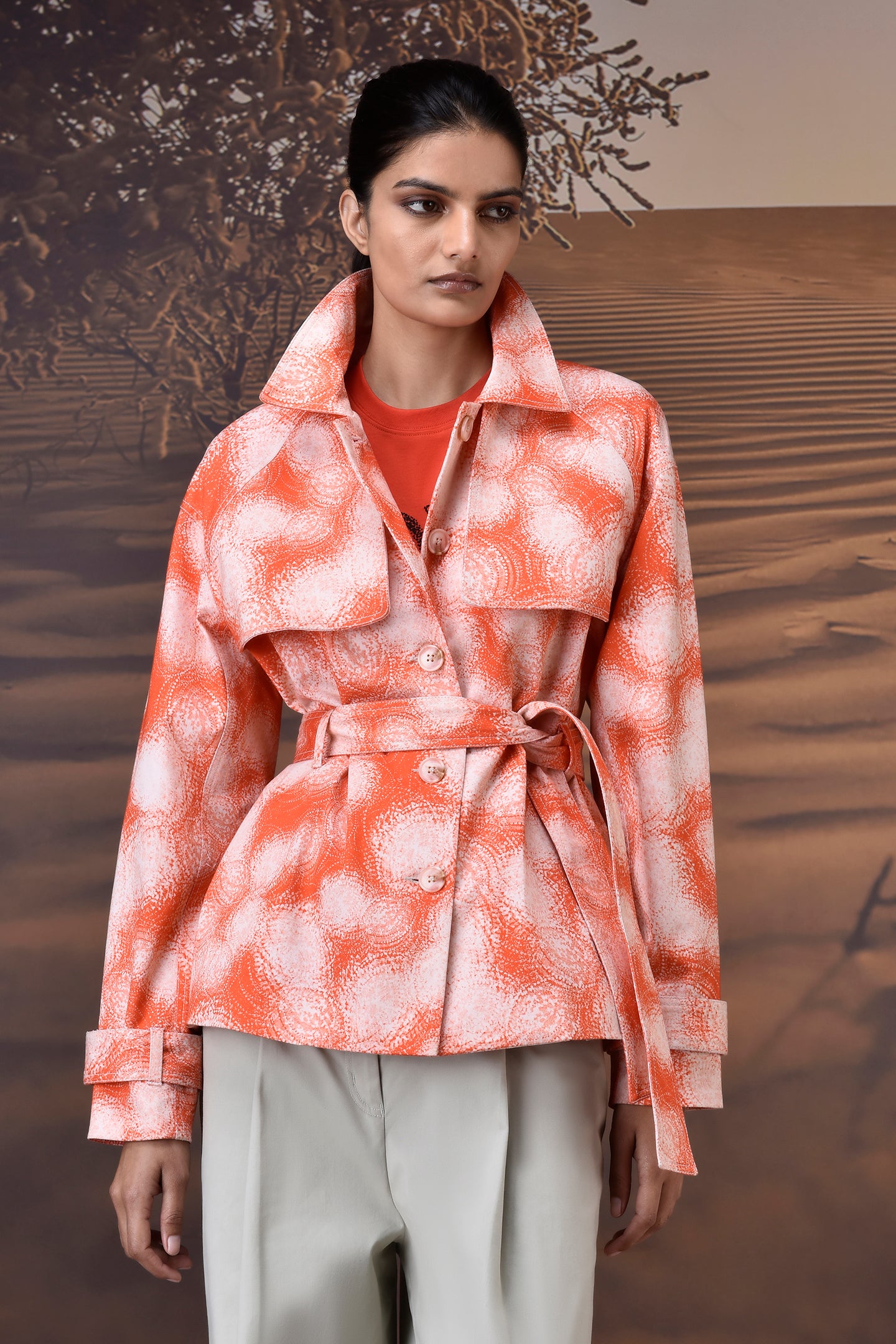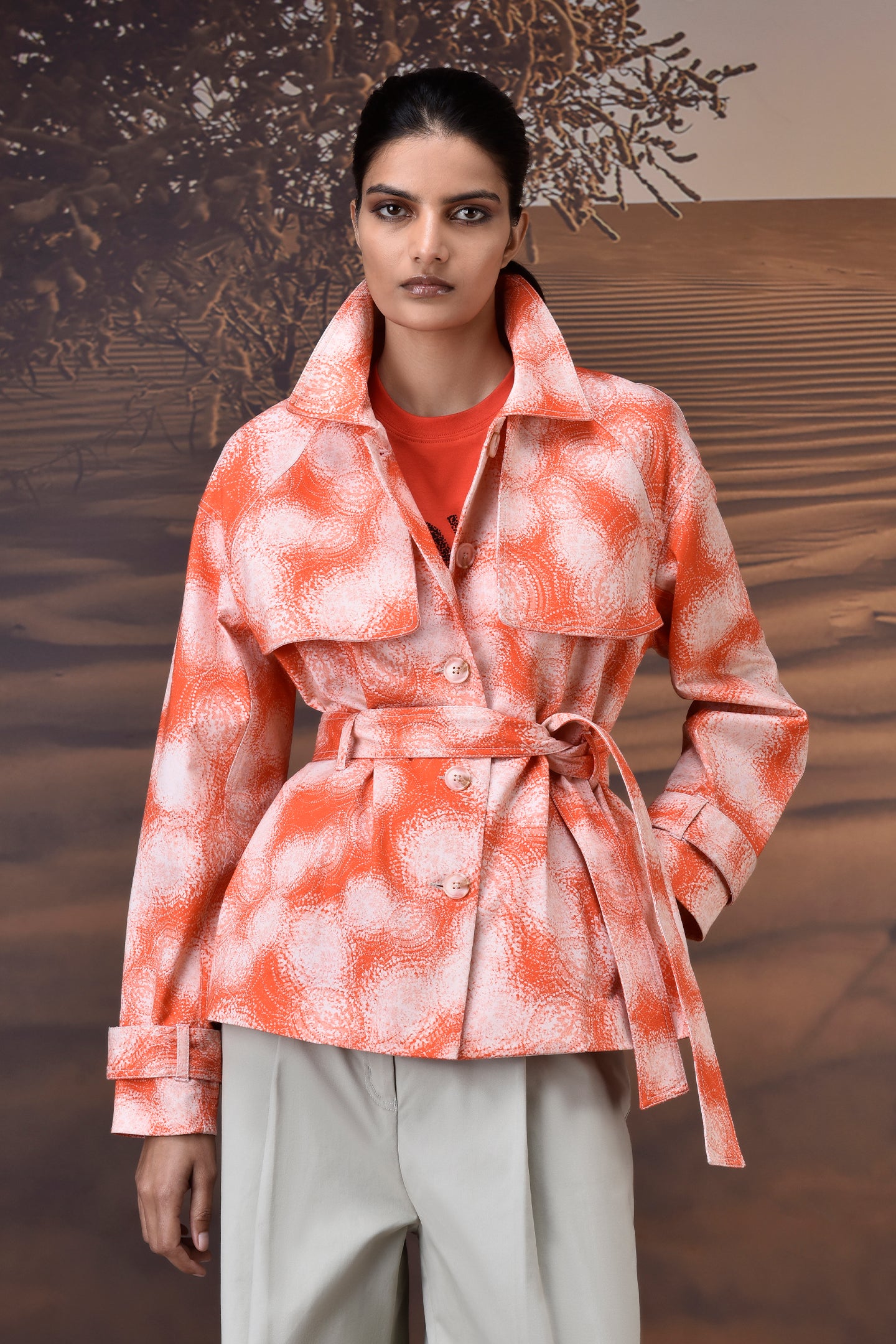 Tailored from heavy cotton twill, this Coquelicot jacket redefines utility chic with an artistic twist. The all-over abstract circle print in contrasting tones brings a bold graphic appeal, while the structured silhouette ensures a polished finish. Featuring a classic shirt collar, button-down front, and a matching fabric belt, it offers both style and versatility. The storm flap detail adds a subtle nod to trench-coat heritage, making it a standout piece for transitional dressing.