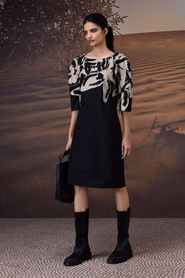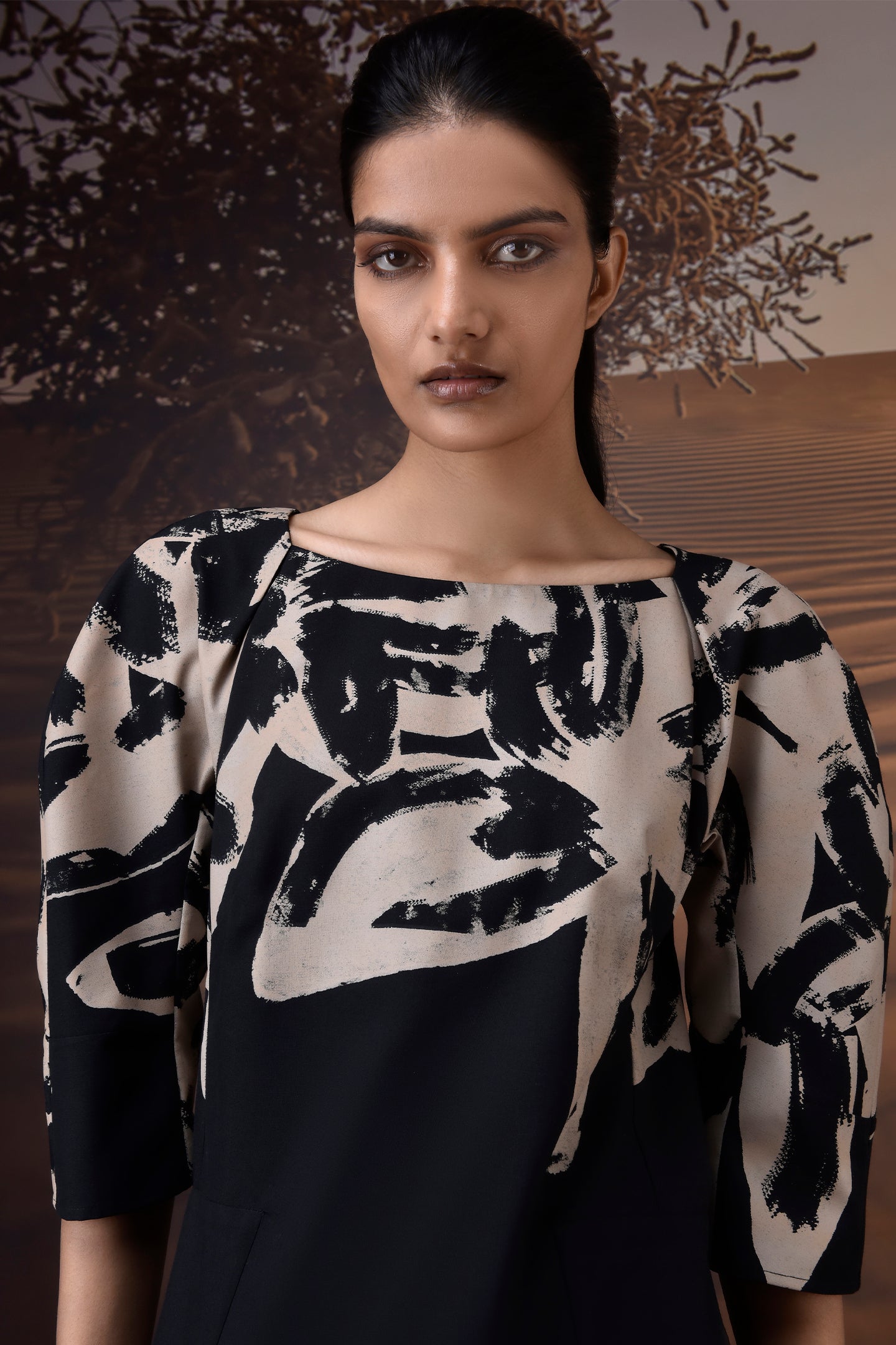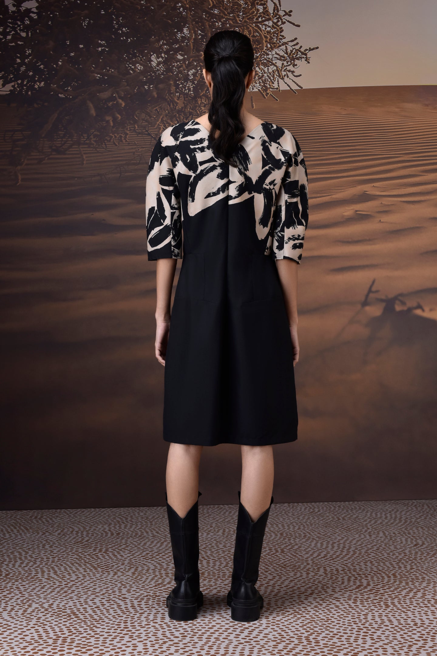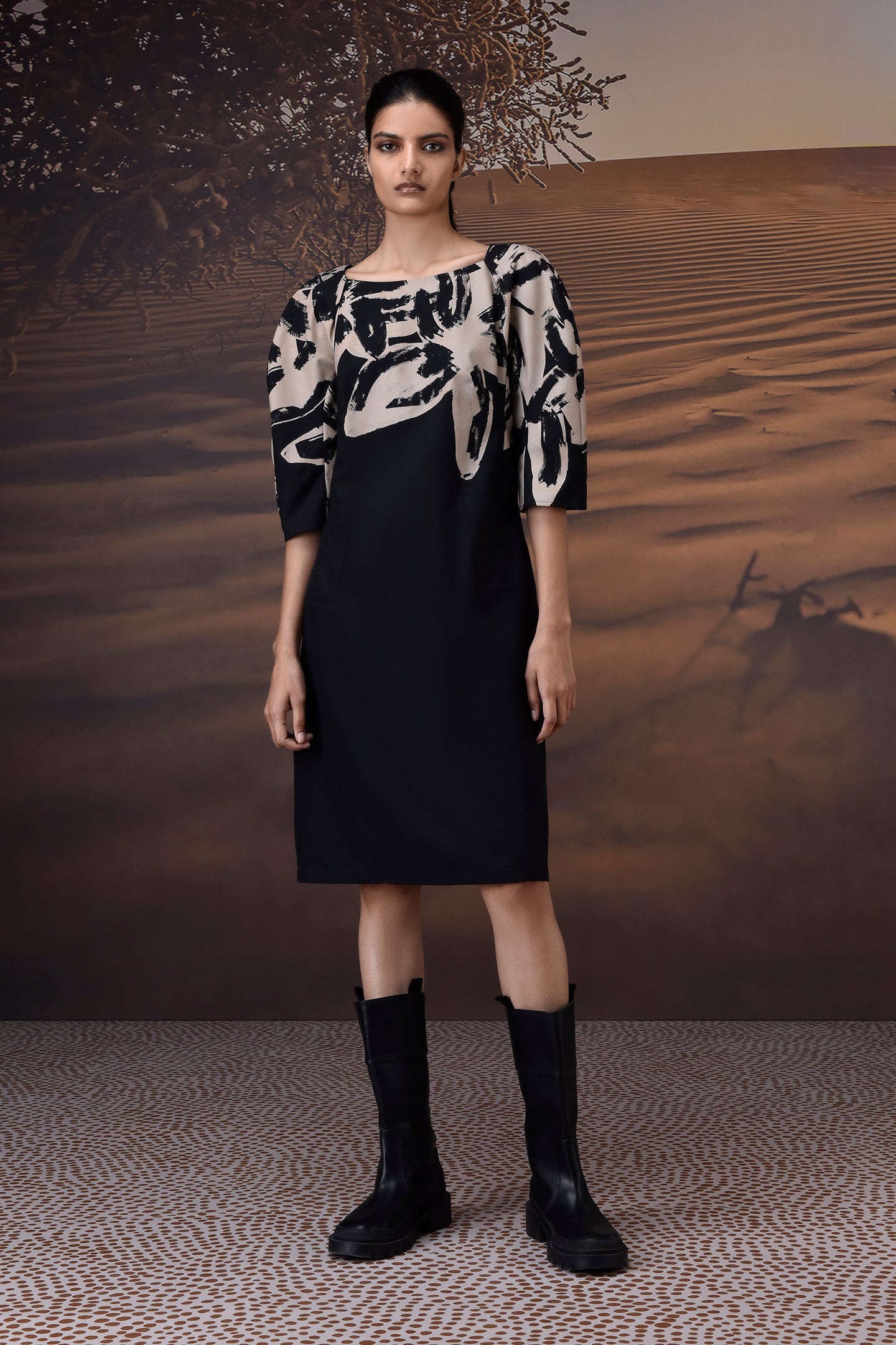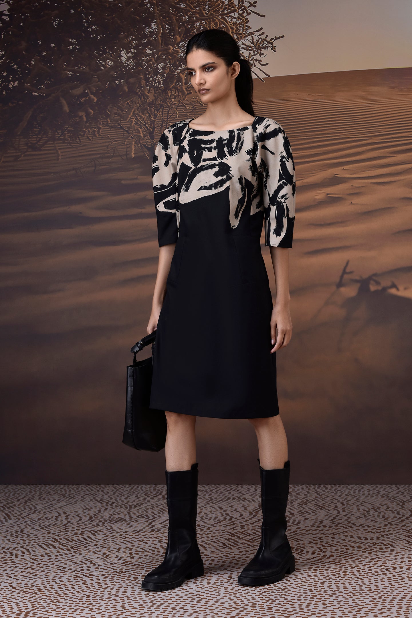 Crafted in smooth, structured poly wool, this striking black dress features an expressive brushstroke print in beige that runs across the shoulders and sleeves. With a clean silhouette and modern volume sleeves, it’s an elevated staple that delivers quiet impact.