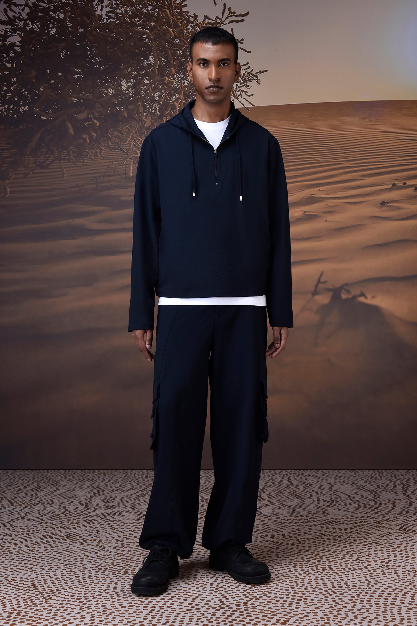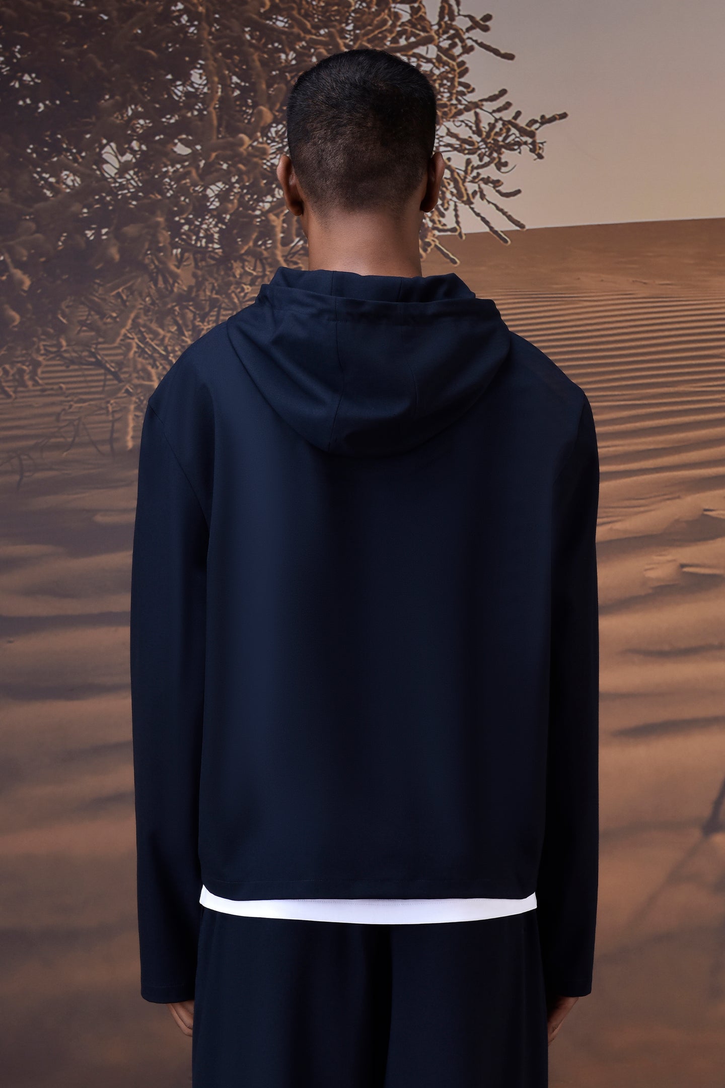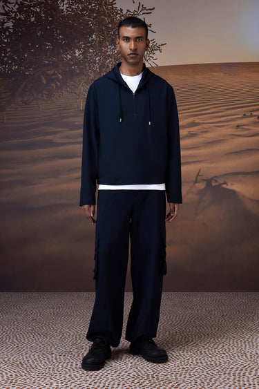 Cut from a smooth poly viscose lycra blend, this navy hoodie blends minimalism with comfort in a silhouette that works beyond loungewear. The fabric offers a clean drape with gentle stretch, allowing ease of movement without losing structure. A half-zip neckline with metal-tipped drawcords adds subtle detailing, while the straight hem layers effortlessly over tees or under outerwear.