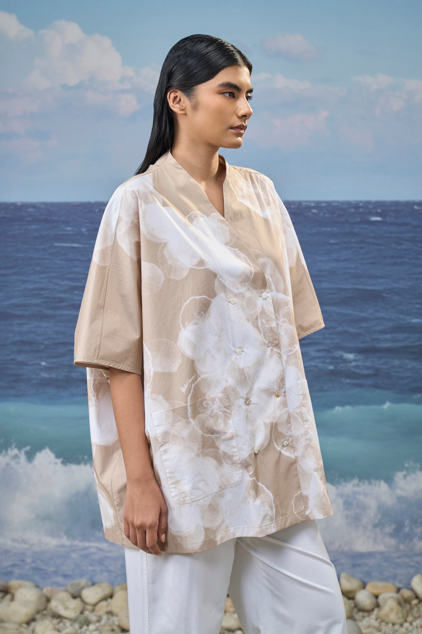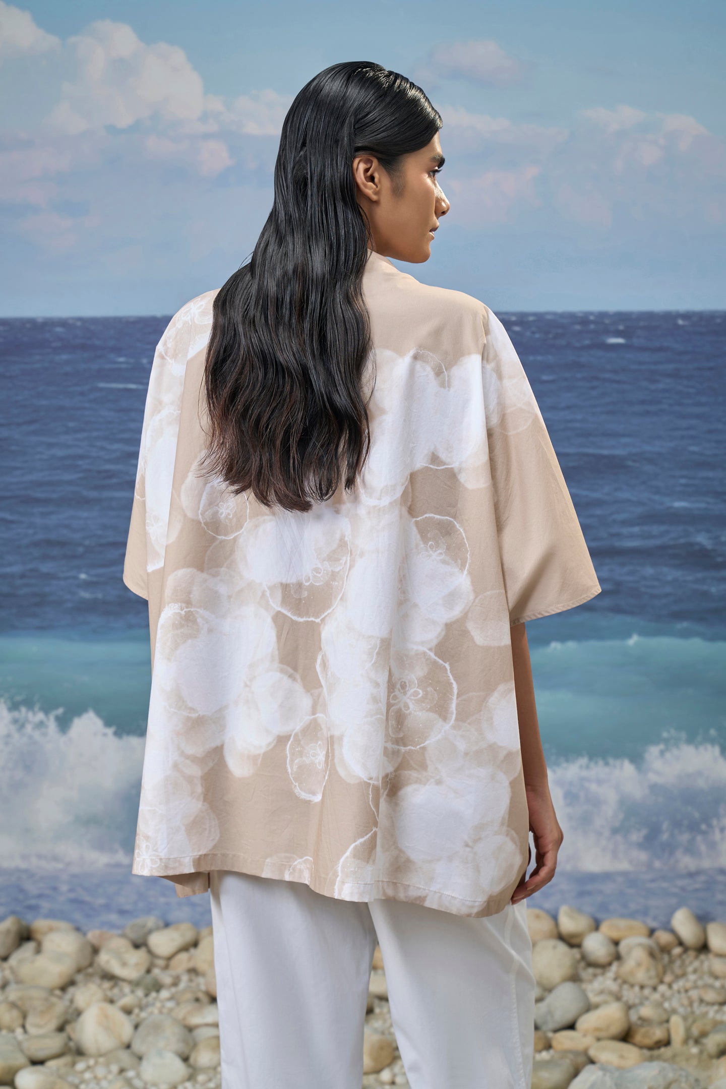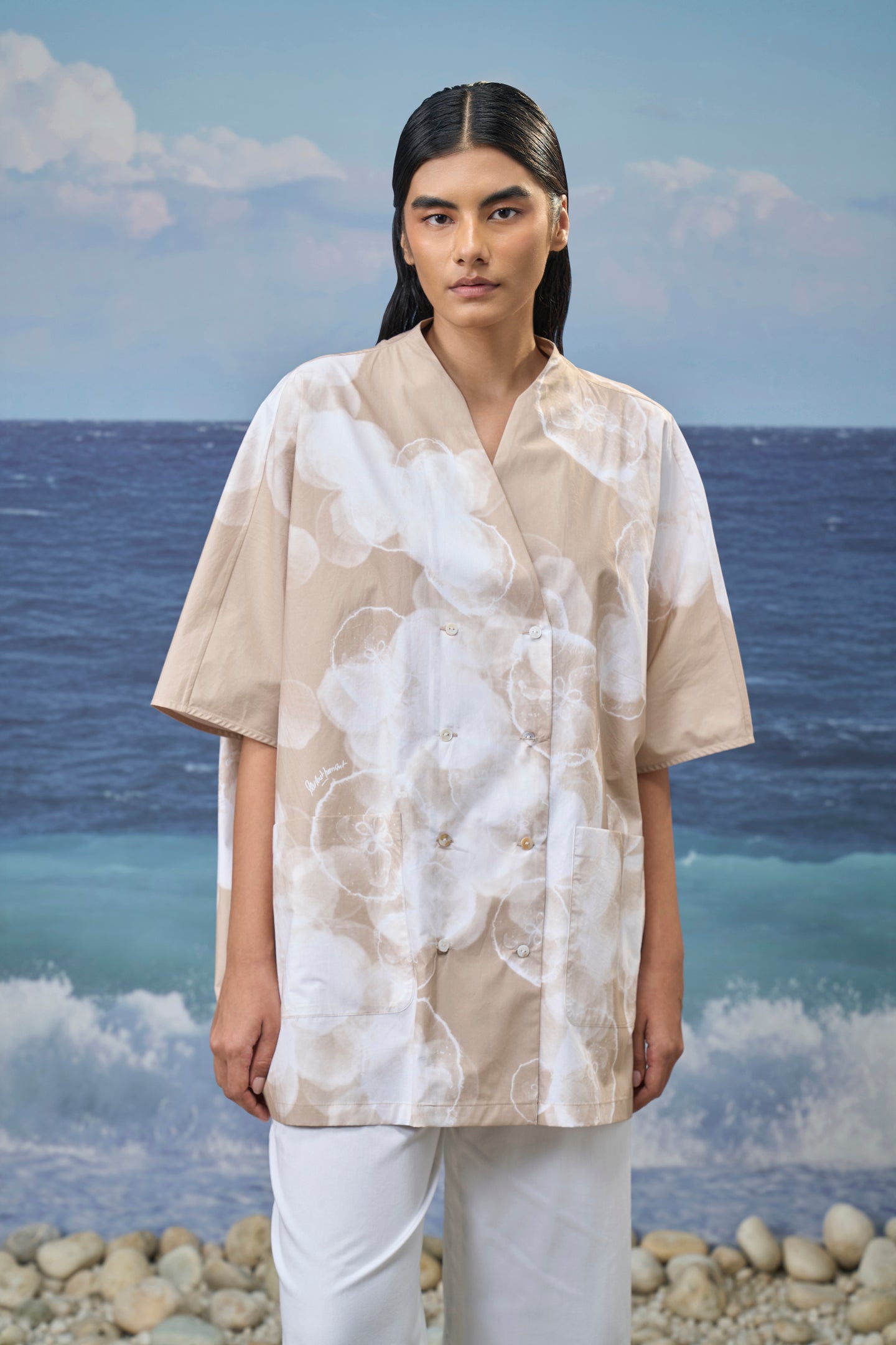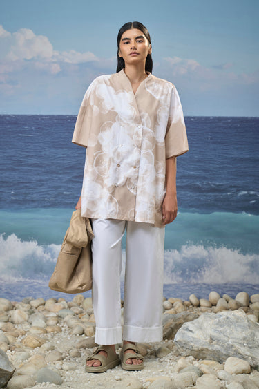 Crafted in premium viscose nylon, this free-size shirt offers a smooth, fluid drape with a lightweight feel. The V-neckline brings a clean, relaxed frame to the silhouette, while the abstract cloud print adds soft visual depth to the design. Cut with elbow-length sleeves and an oversized shape, the shirt falls effortlessly through the body for easy movement and comfort. The balanced proportions create a relaxed yet polished look suited to modern, everyday dressing.