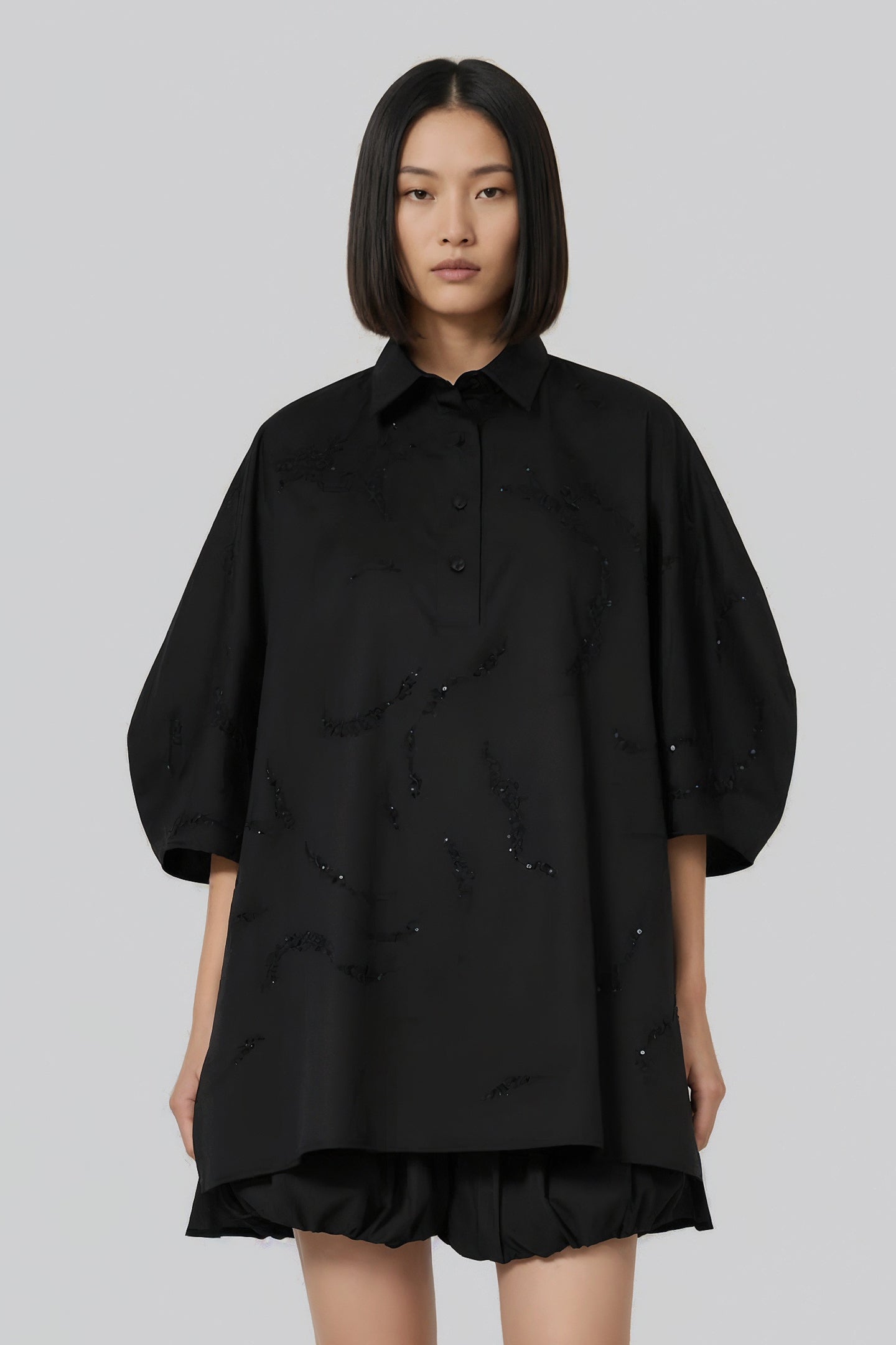 Cut from 100% Giza Cotton Poplin, this shirt redefines ease with structure. The fabric’s crisp handle and subtle sheen lend a sculpted yet fluid drape that flatters every form. Designed in an oversized, free-size silhouette, it embodies effortless sophistication while retaining tailored precision.