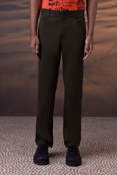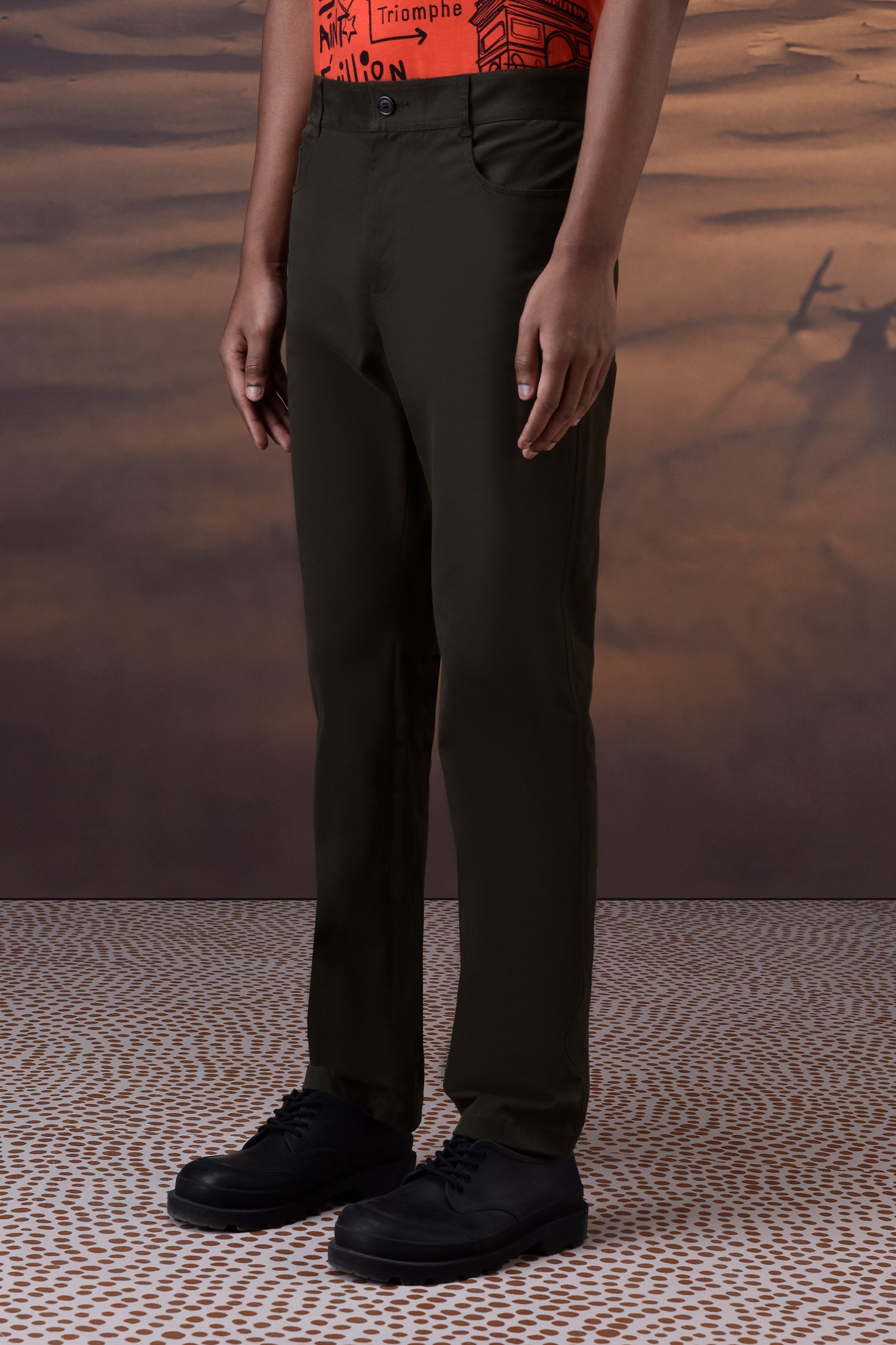 Designed for modern versatility, these military green trousers are crafted from sturdy cotton twill—delivering both structure and comfort. The classic twill weave brings subtle texture and durability, while the deep green tone offers a nod to utilitarian roots with a contemporary edge. Featuring a regular fit, straight leg, and streamlined pocket detailing—including minimalist back embroidery—these trousers merge understated style with everyday functionality.