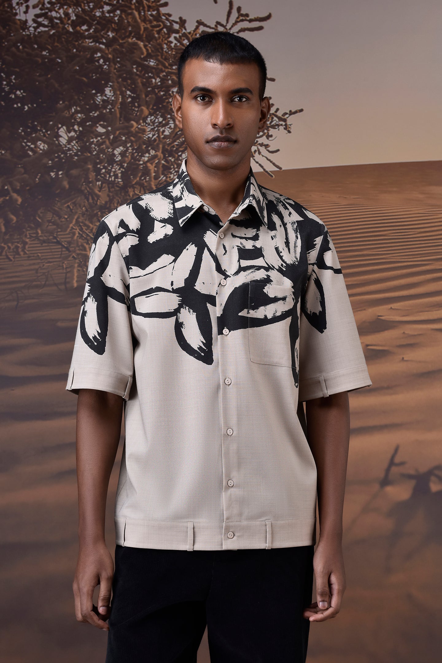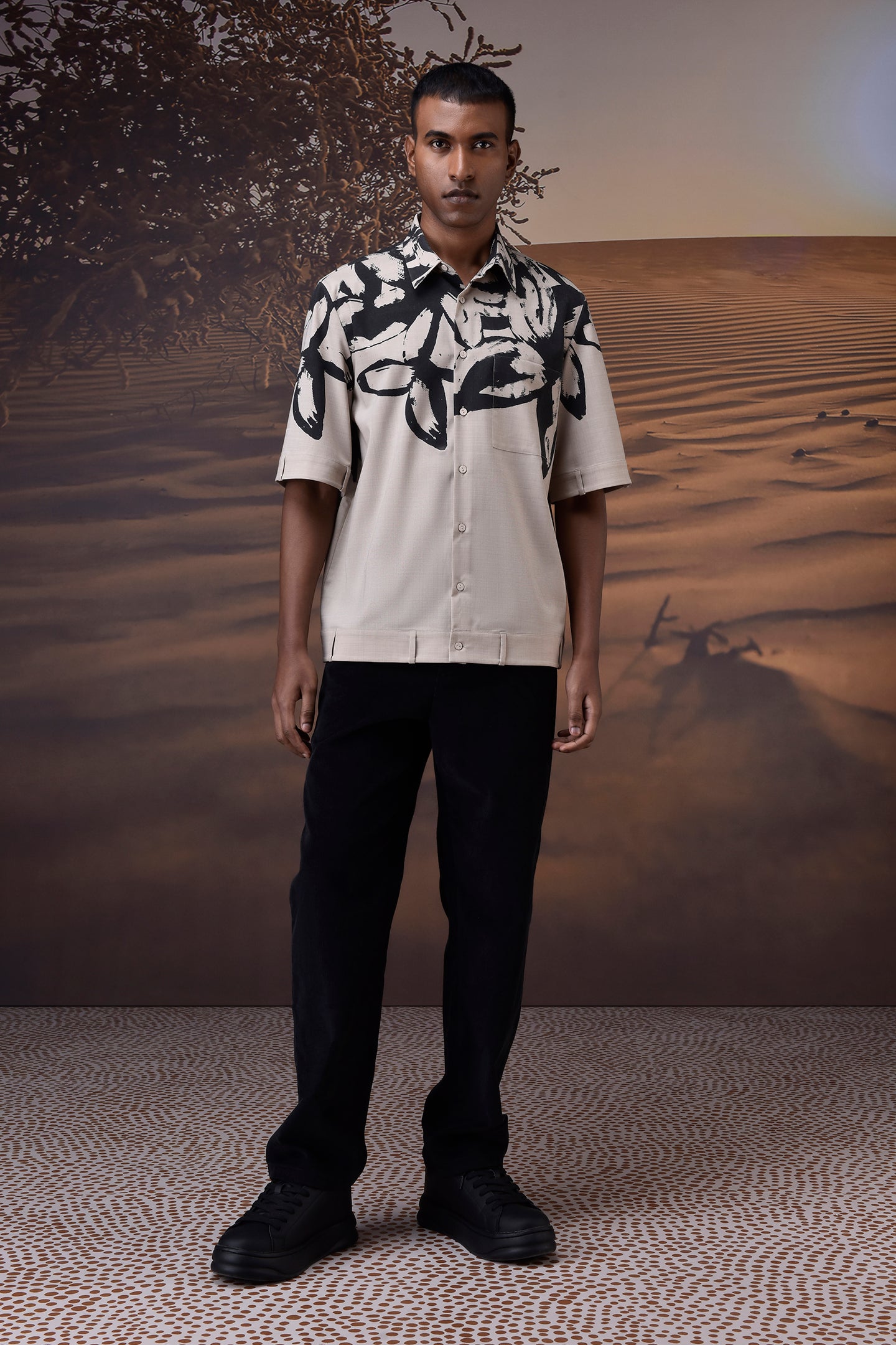 Cut in a softly structured poly wool, this beige shirt introduces expressive flair through its bold black brushstroke print. The abstract motif spans the upper half, creating strong visual contrast while maintaining a clean, wearable base.