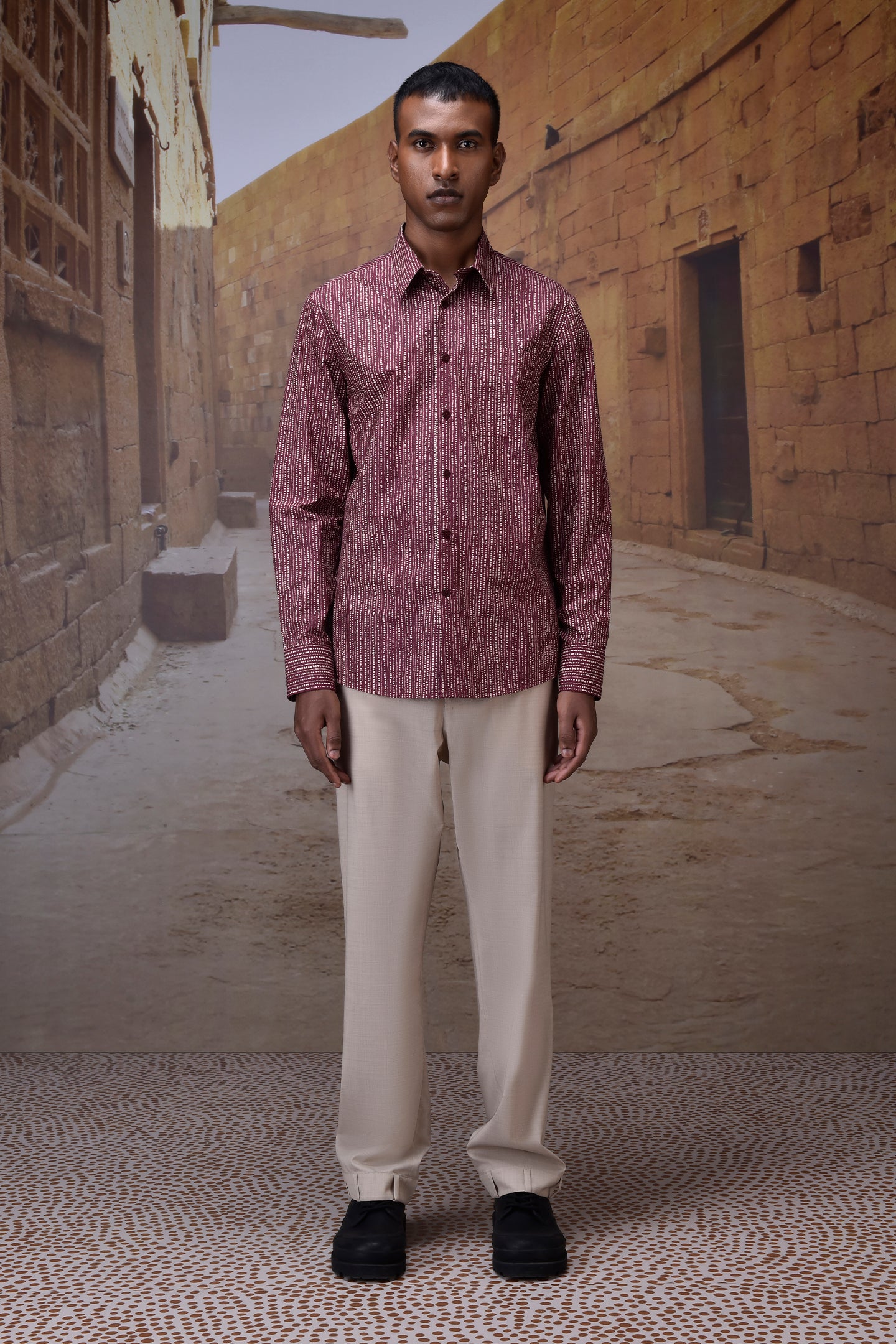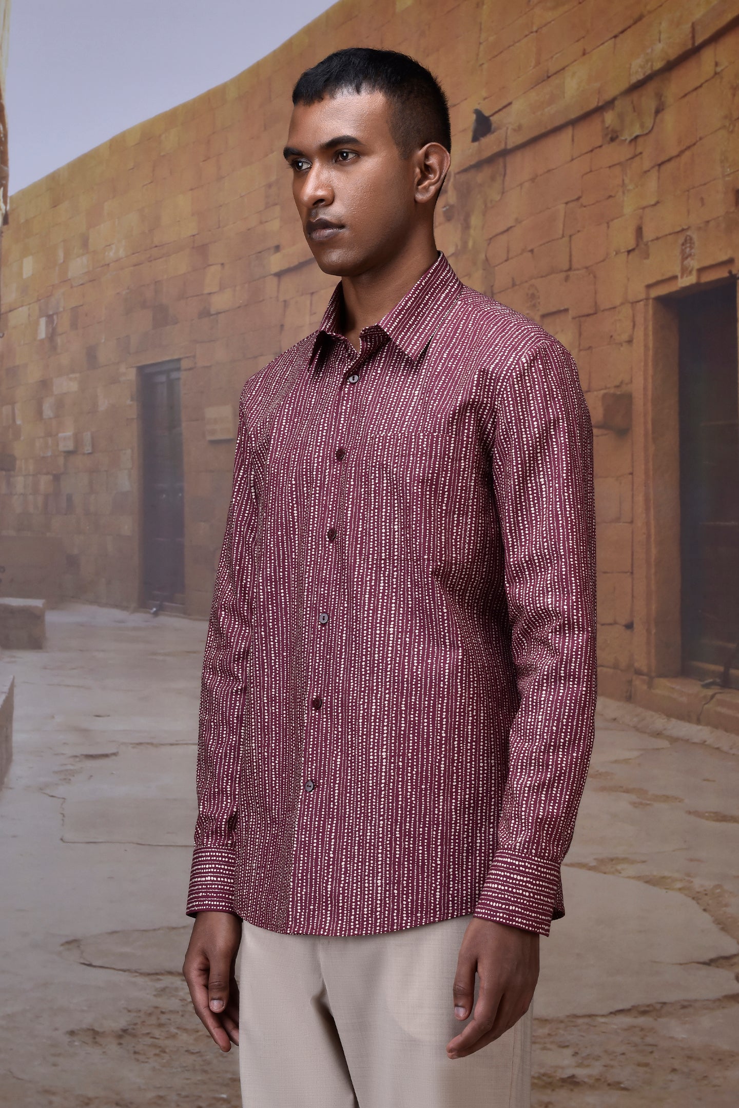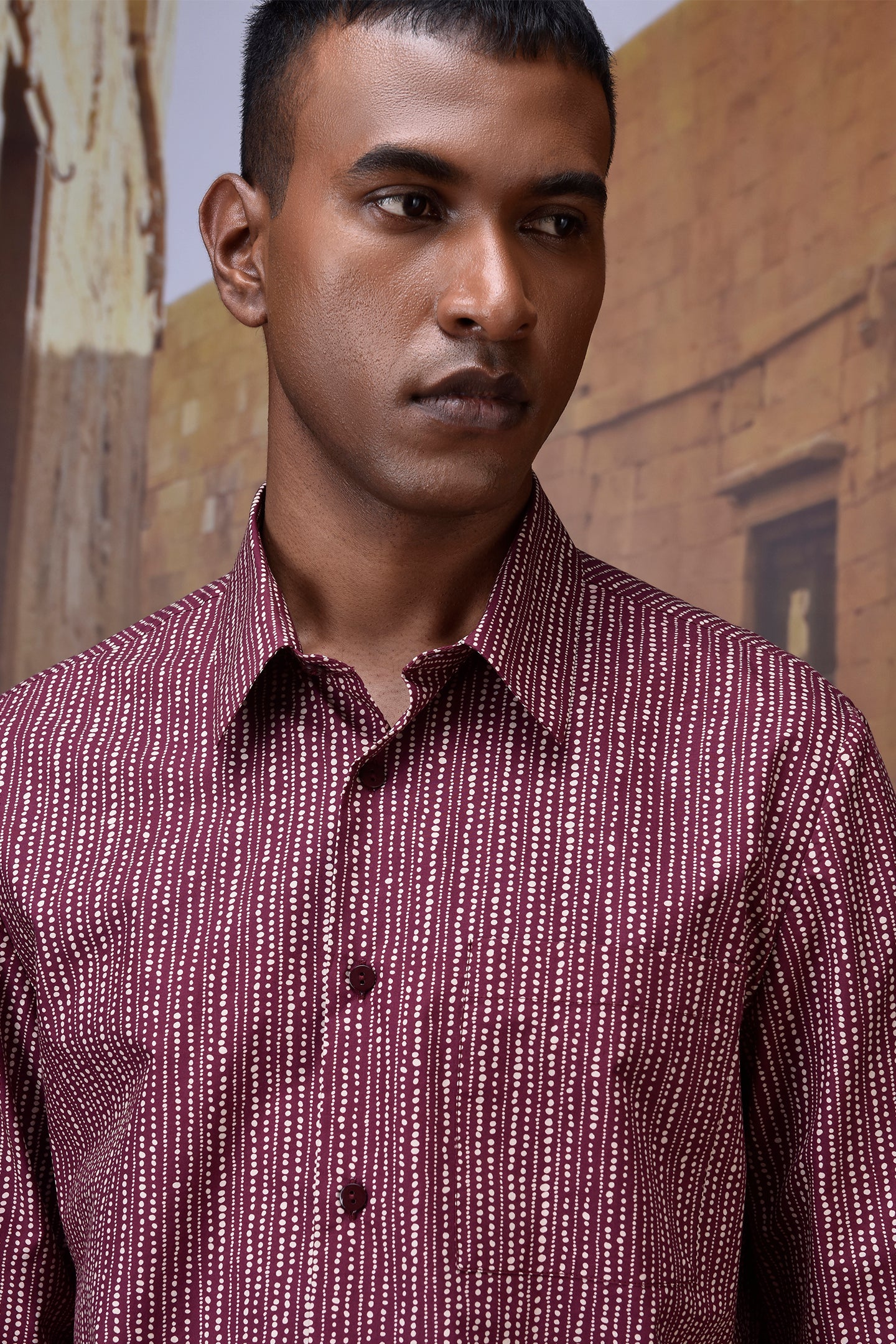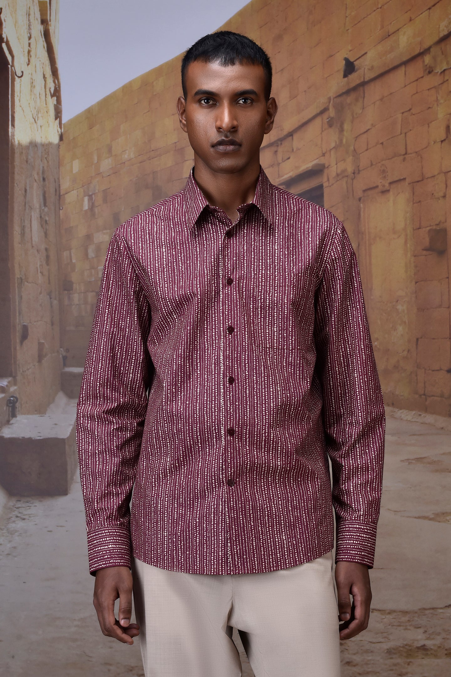 Tailored from premium Giza cotton poplin, this cherry lacquer shirt blends crisp structure with a refined touch. The rhythmic abstract dot print adds subtle movement and visual interest to the rich burgundy base, creating a sophisticated yet playful statement. Crafted for effortless versatility, it features a sharp collar, full button placket, and a straight hem for a clean-lined silhouette.