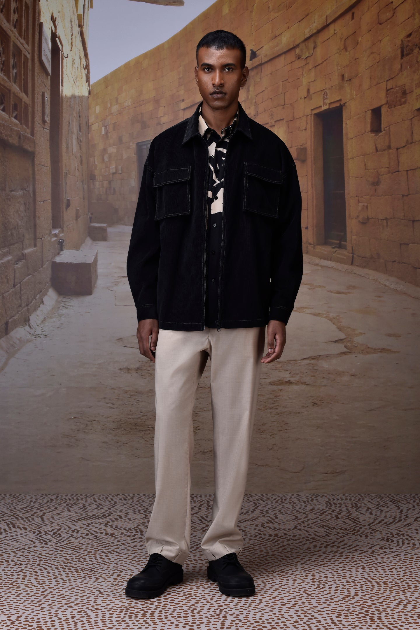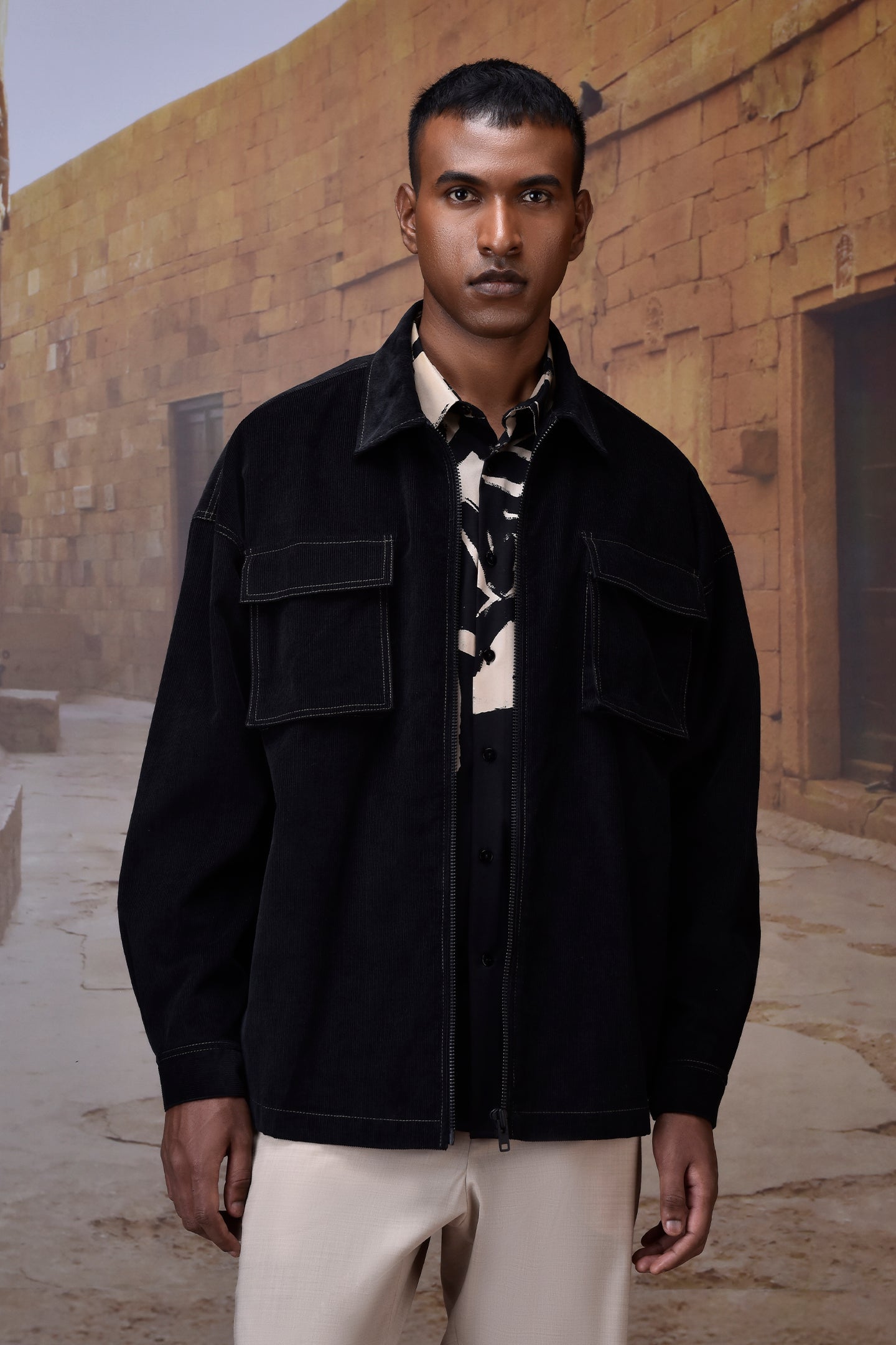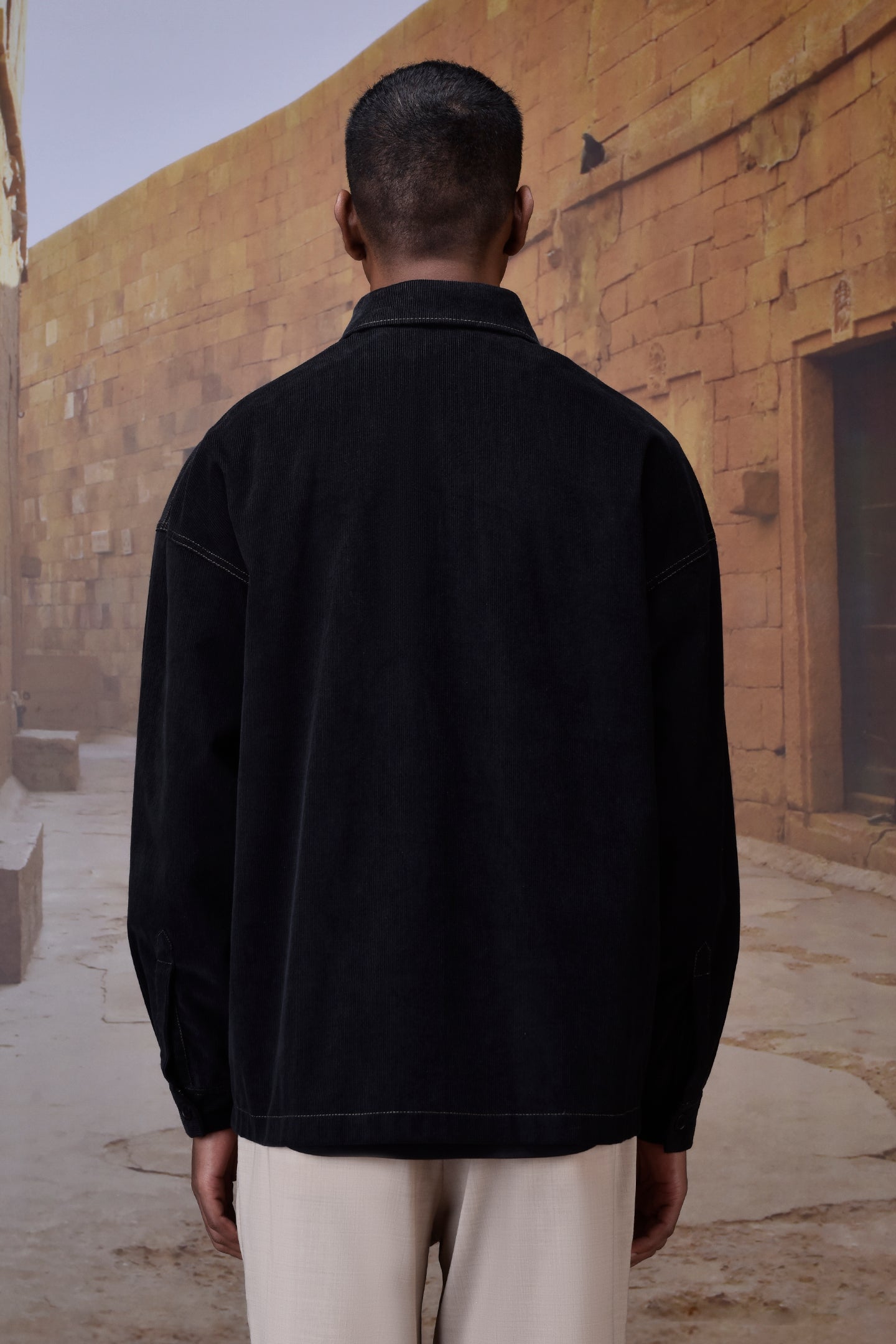 This utility-inspired shirt is crafted from fine black cotton corduroy, delivering rich texture and subtle sheen to a timeless silhouette. The structured design features oversized front patch pockets, adding both function and a contemporary edge. Clean lines, straight sleeves, and precise stitching highlight its tailored appeal, while the zip-up front ensures modern versatility. Its medium-weight construction strikes a balance between layering and standalone wear, making it a go-to piece for transitional seasons.