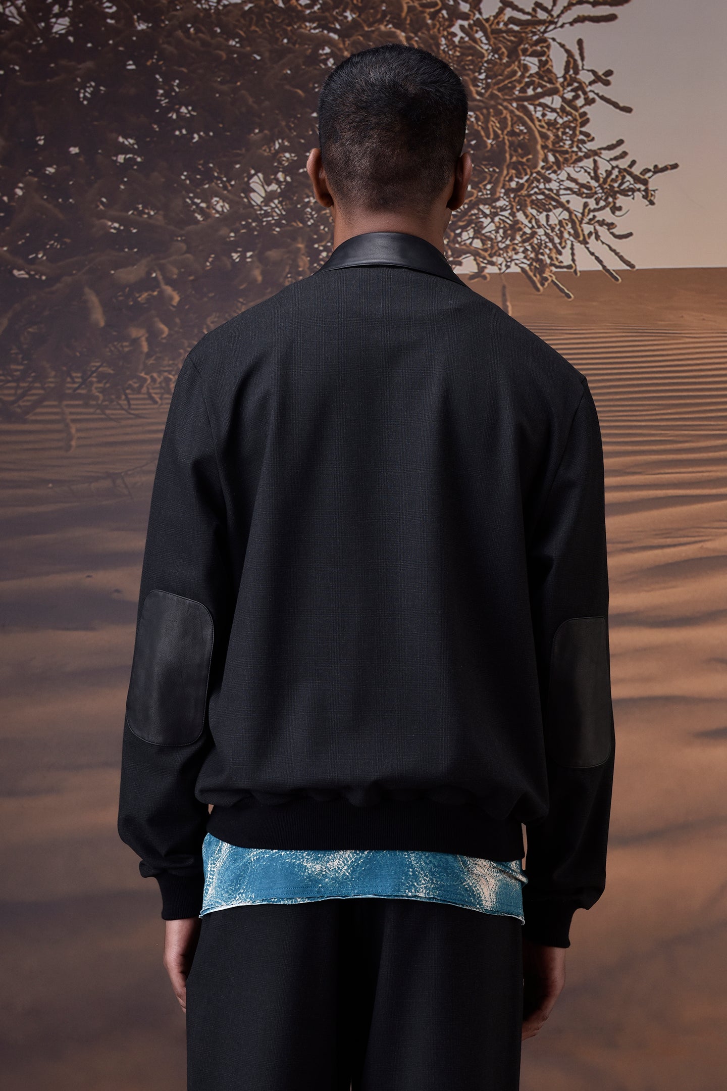 Smooth leather collar, pocket trims, and elbow patches for contrast detailing