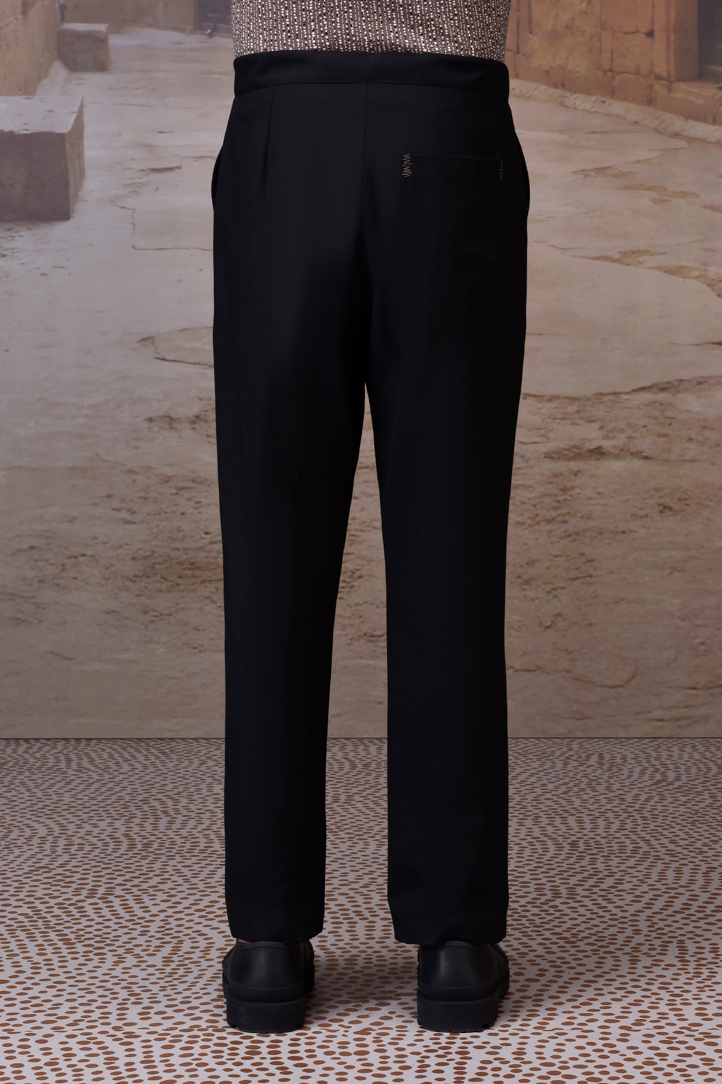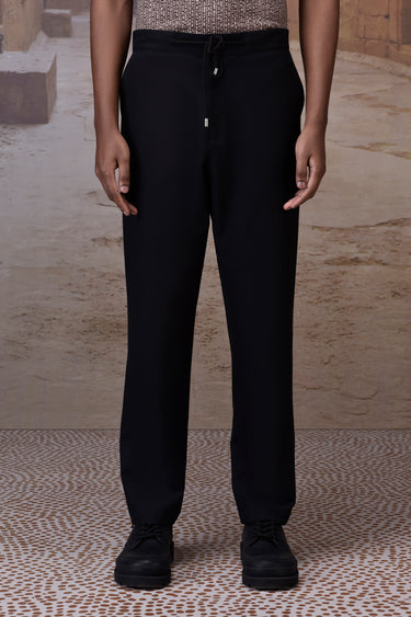 Cut from a smooth poly-viscose blend with a hint of lycra, these black trousers balance structure with stretch for all-day comfort. The clean, straight-leg silhouette is anchored by a mid-rise drawstring waist, offering a relaxed fit that adapts seamlessly from casual to semi-formal settings. Side slip pockets and a single back patch pocket add functional detailing without compromising the streamlined look.