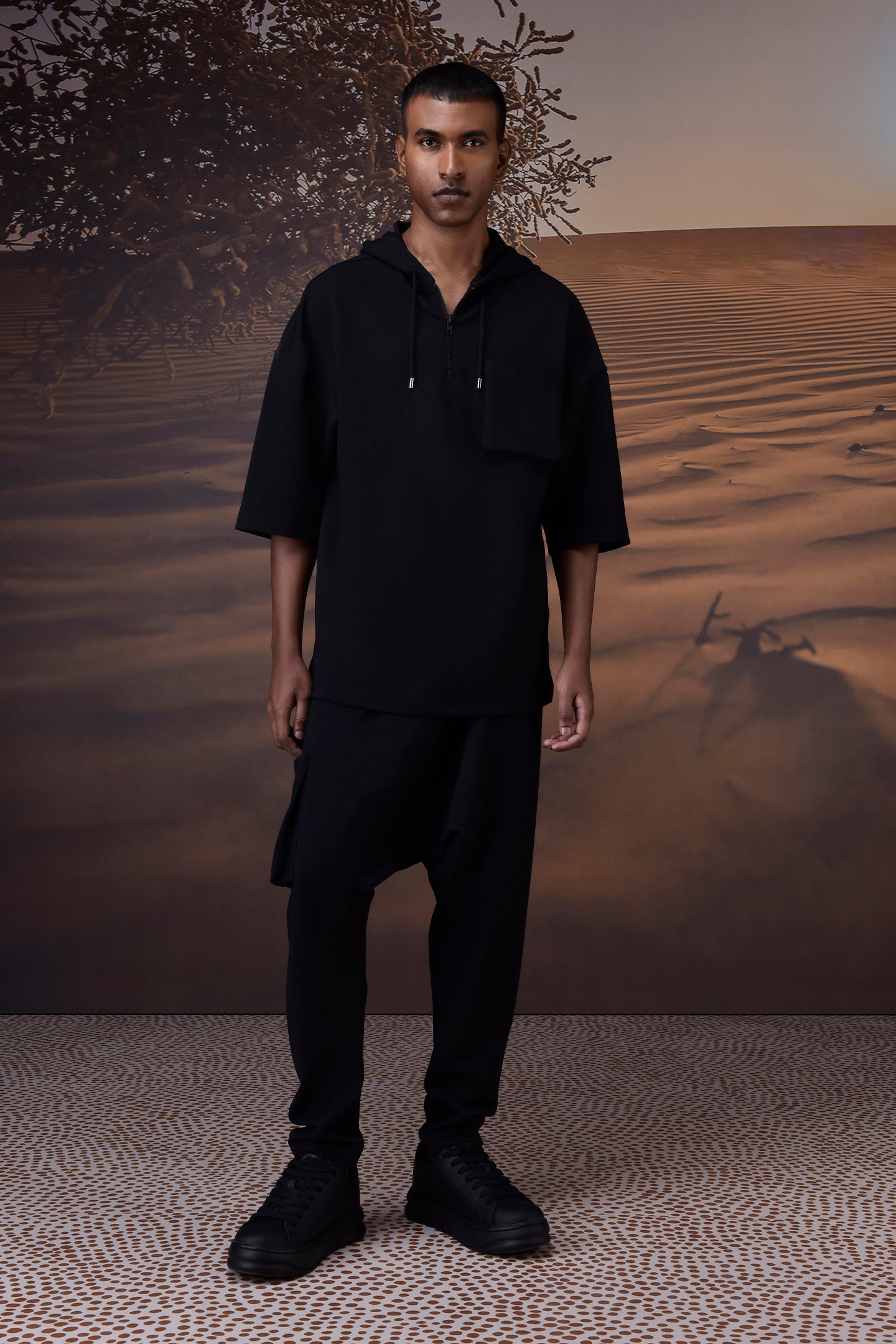 Cut from innovative textured poly lycra, this black hoodie reimagines casualwear with an architectural, modern sensibility. The unique fabric offers subtle structure and stretch, resulting in a silhouette that feels both sculpted and comfortable. Featuring a relaxed hood with adjustable drawstrings, a distinctive oversized front pocket, and a half-zip placket, this piece balances utilitarian ease with sleek design. Its clean lines, dropped shoulders, and three-quarter sleeves produce an effortless profile—perfect for layering or standing out on its own.