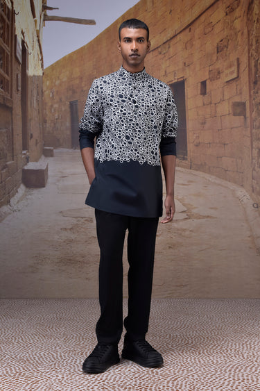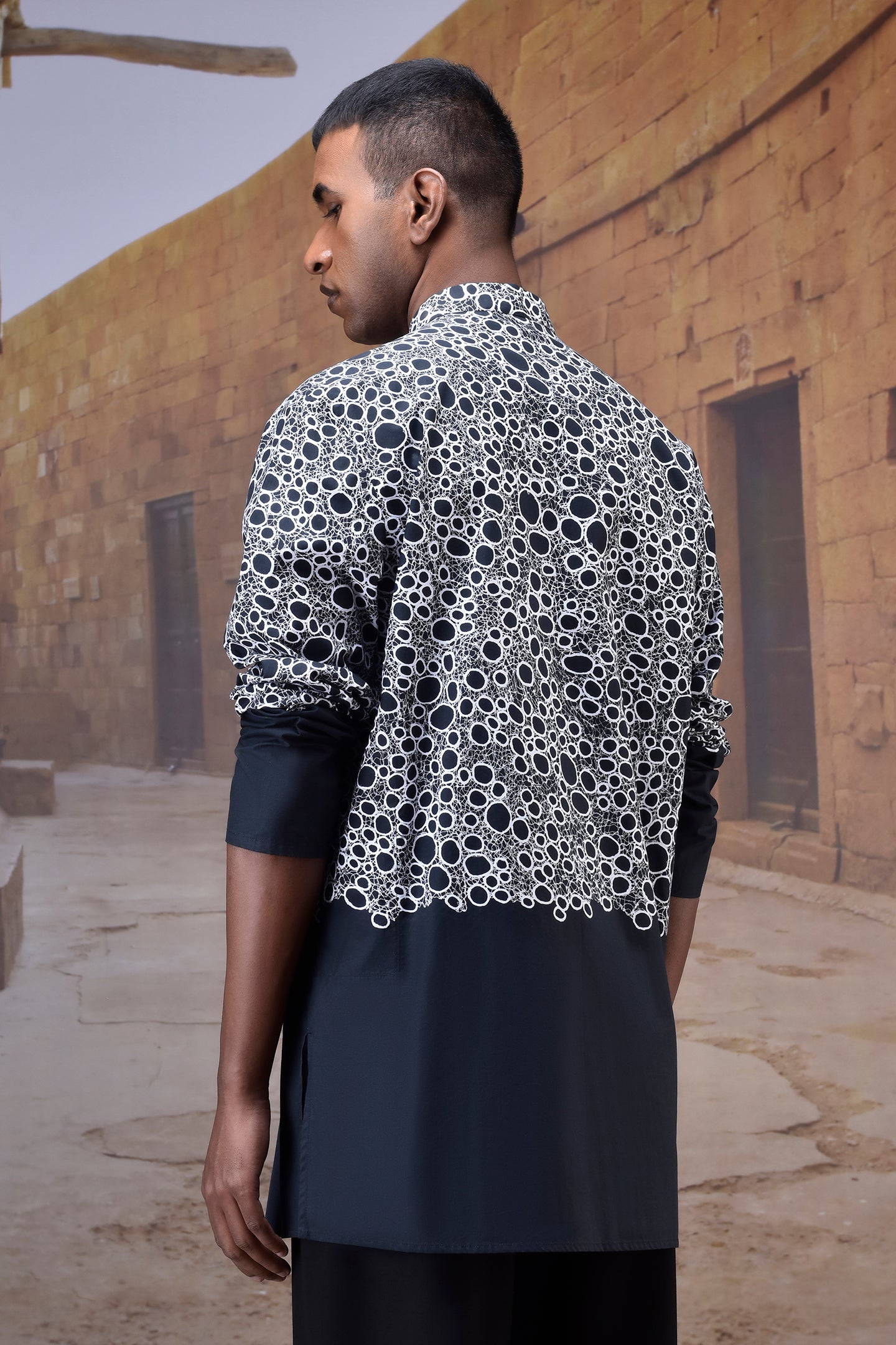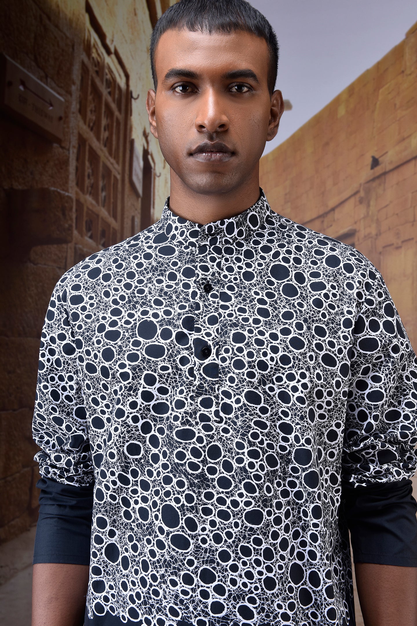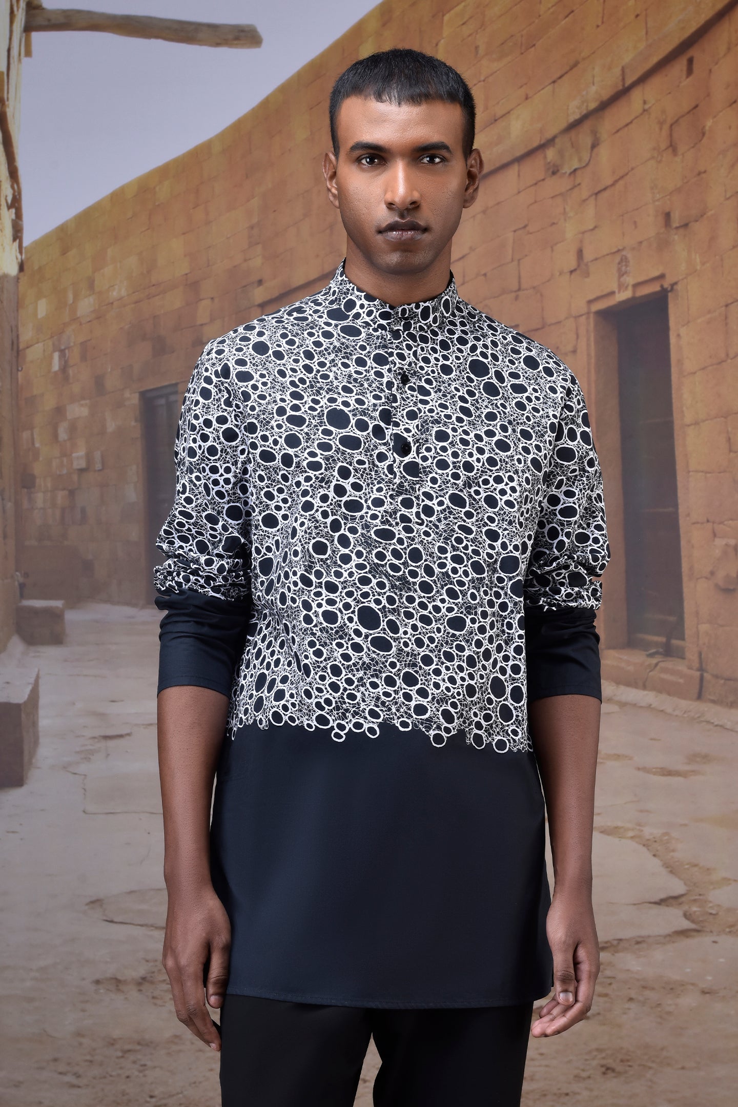 Cut in luxurious Giza cotton poplin, this black kurta makes a bold statement with its striking all-over bubble print in ivory. The design is densely packed through the top half and gradually diffuses into a clean, solid base — creating a contemporary gradient effect.