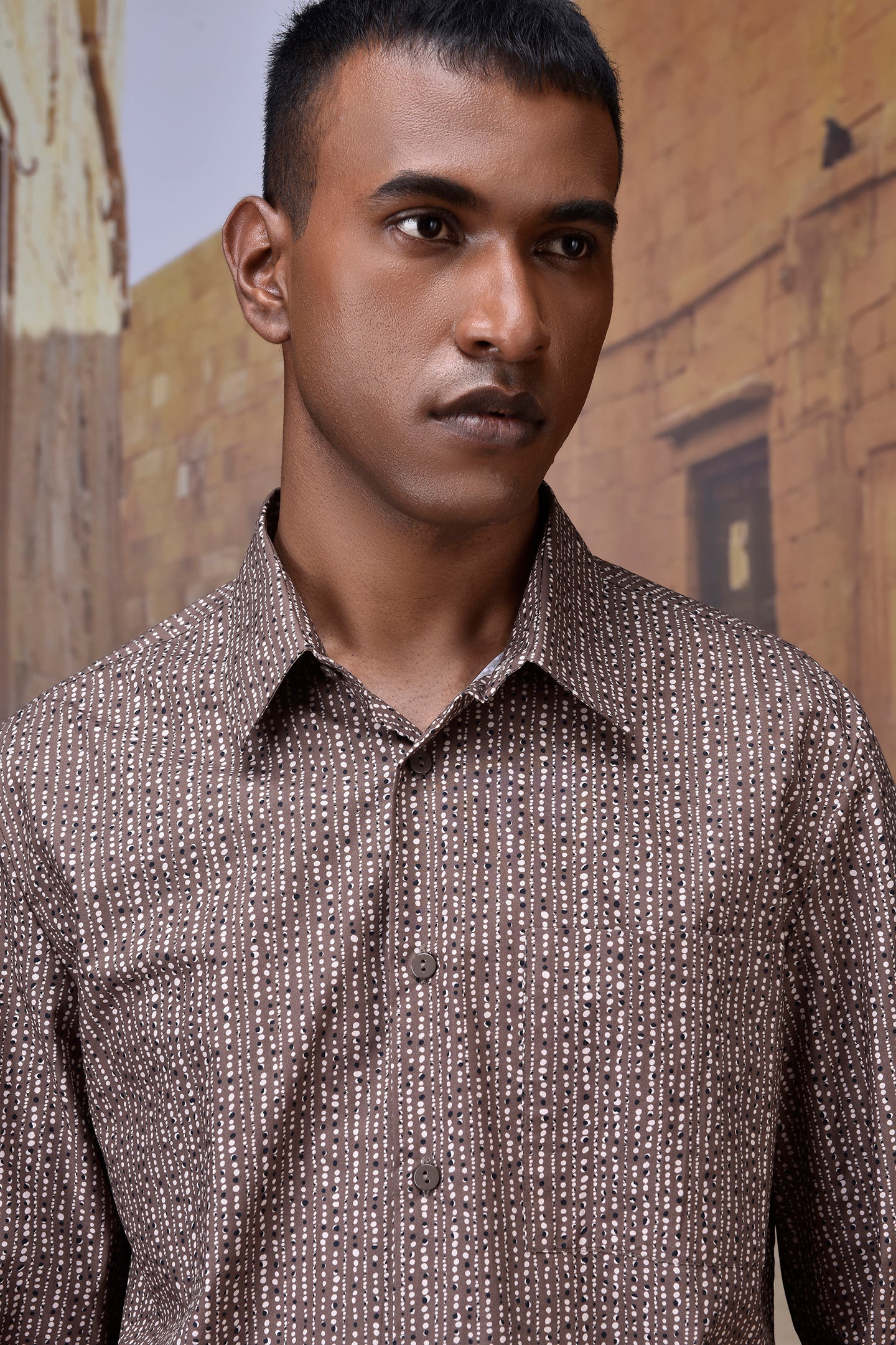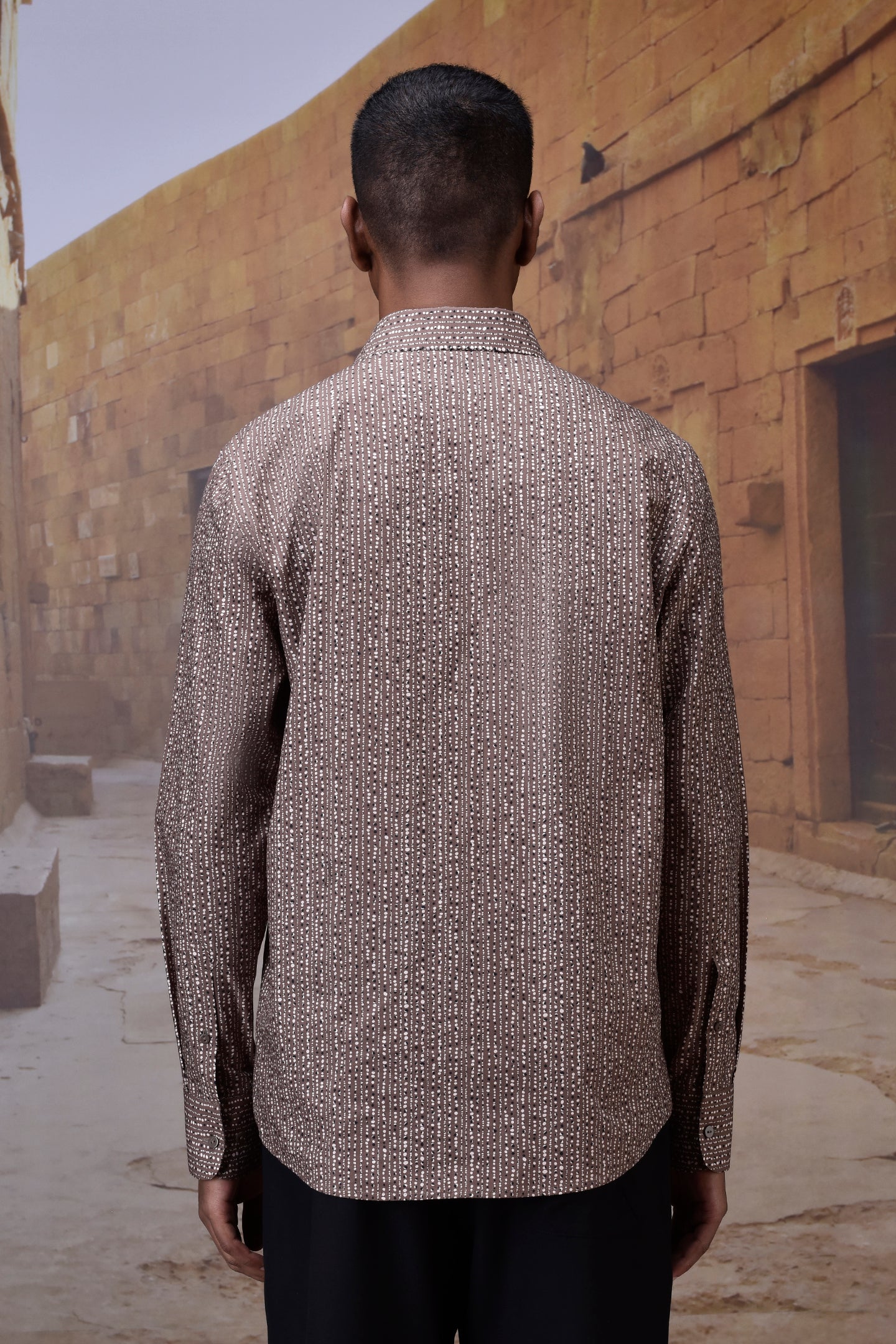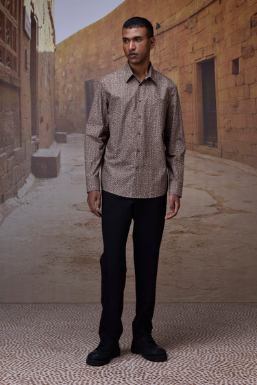 Tailored from premium Giza cotton poplin, this warm beige shirt blends crisp structure with a refined touch. The rhythmic abstract dot print adds subtle movement and visual interest to the soft, neutral base, creating a sophisticated yet versatile statement. Crafted for effortless styling, it features a sharp collar, full button placket, and a straight hem for a clean-lined silhouette.