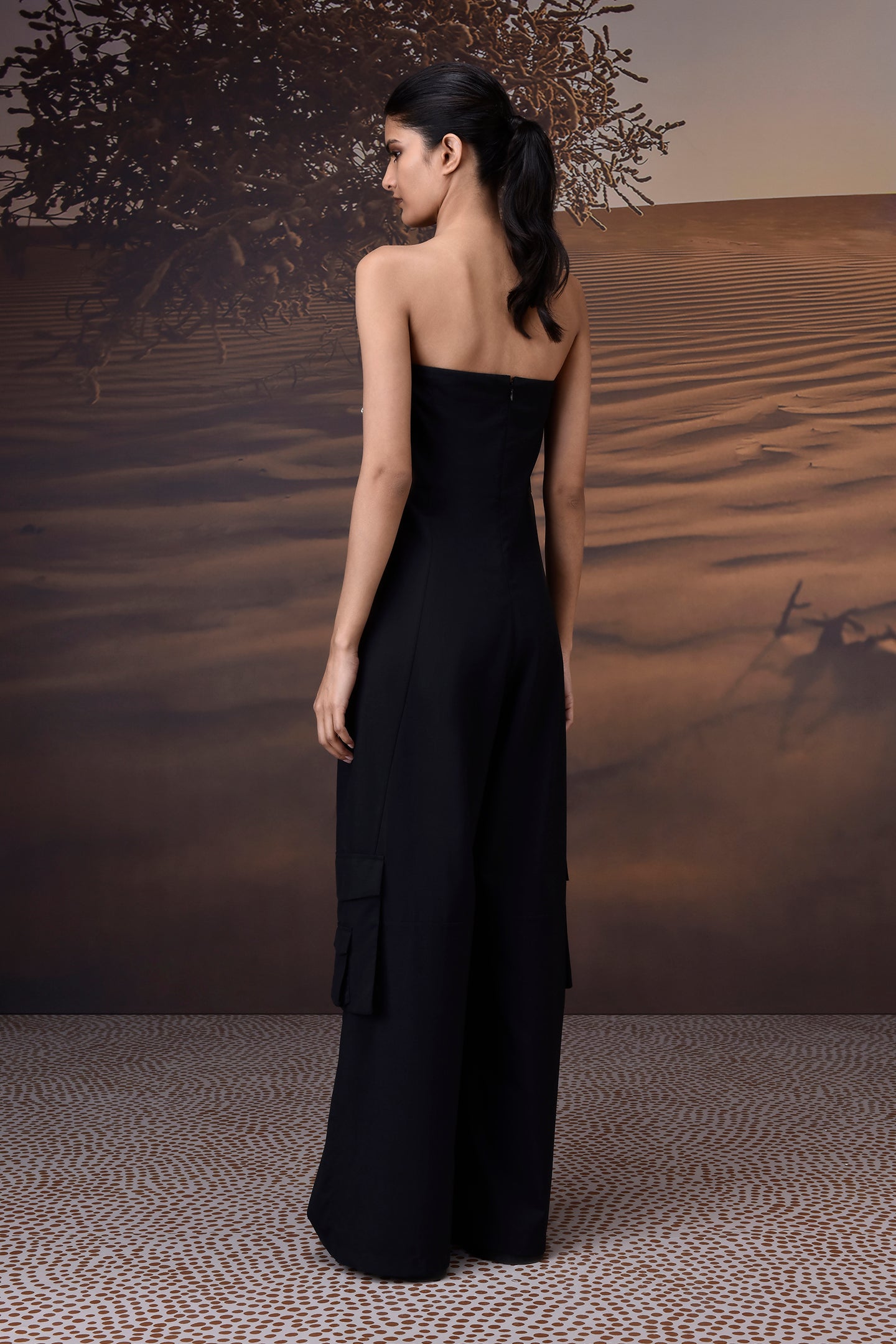Cut in fine poly wool, this Genes Lecoanet Hemant jumpsuit blends architectural poise with fluid movement. The sculpted strapless bodice is hand-embellished with black and silver sequins that catch the light, while wide-leg trousers with subtle cargo-style pocket detailing add a modern edge; a concealed back zip keeps the lines sleek—an assured statement for evening occasions.