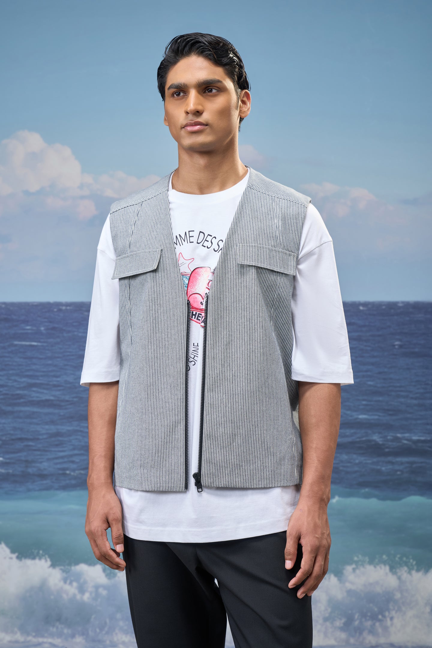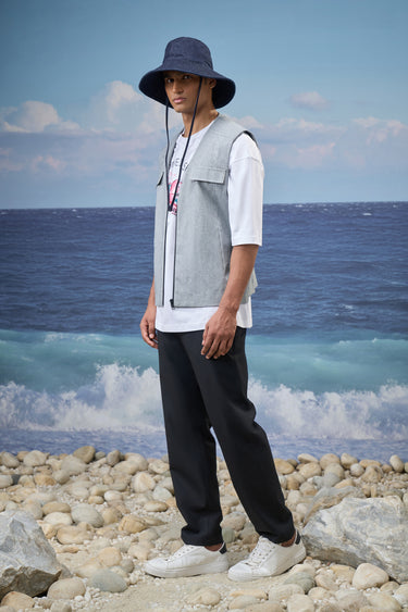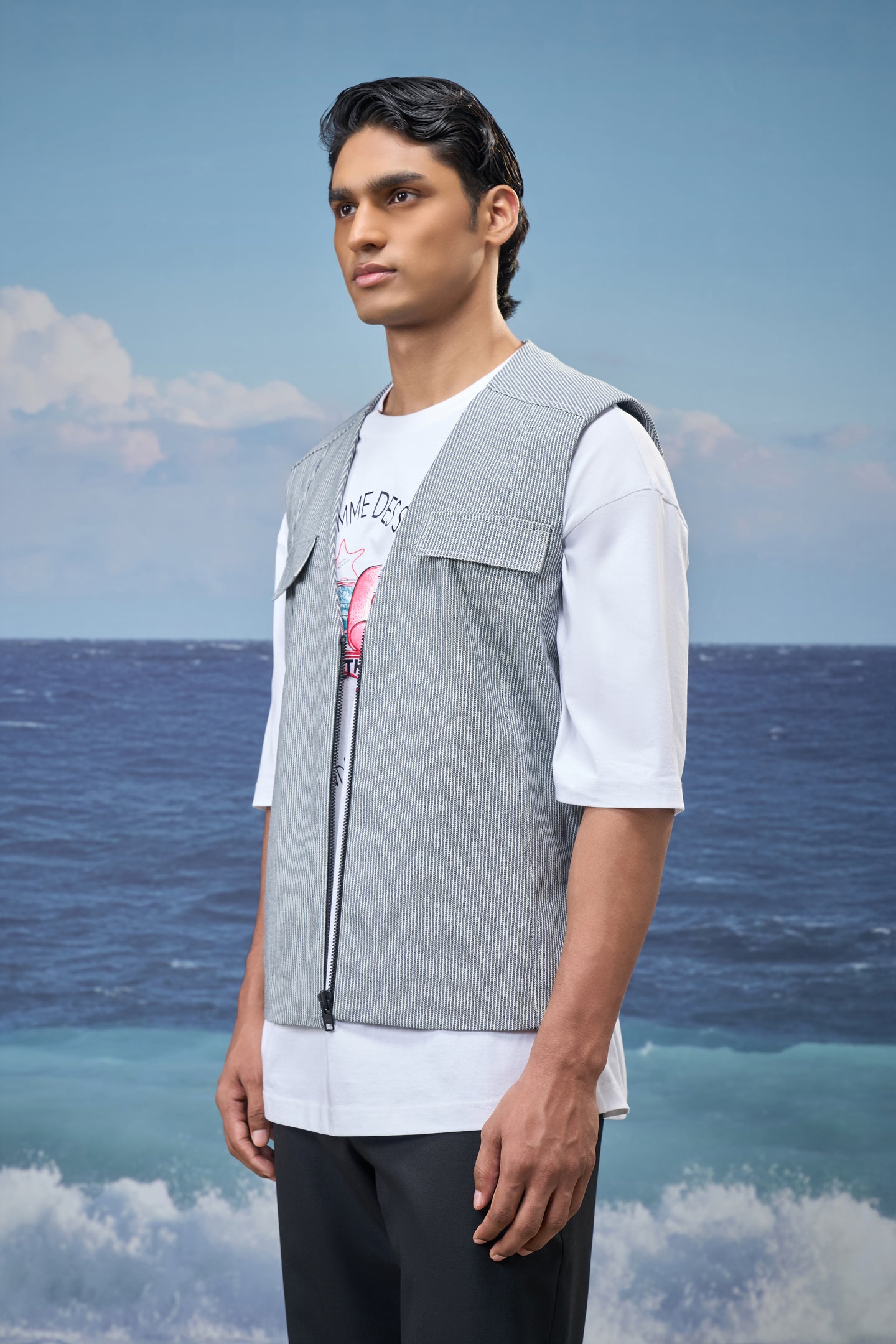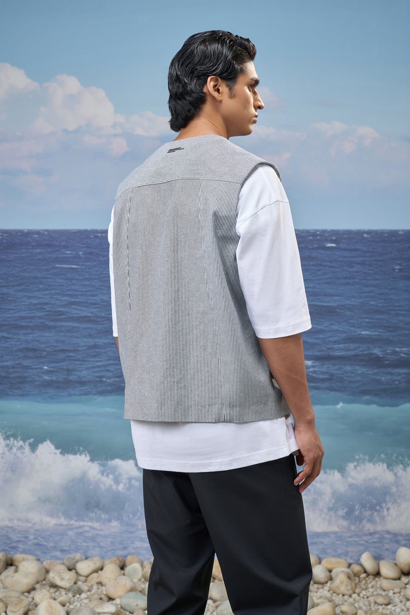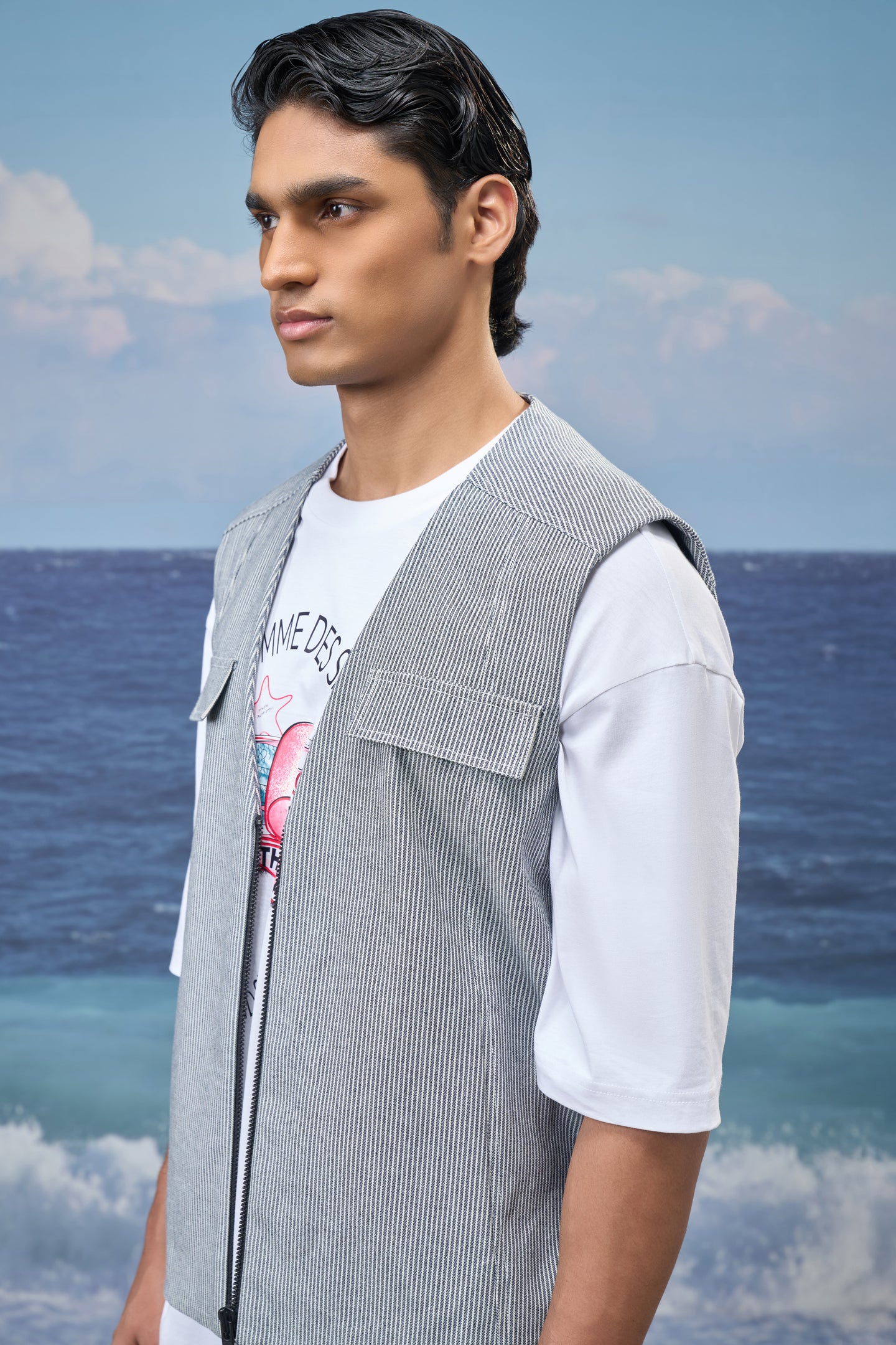 This sleeveless vest delivers a modern layering essential with a relaxed, contemporary attitude. Crafted from cotton denim with fine navy stripes, it offers a structured yet breathable feel. The clean V-neckline and oversized silhouette create an effortless drape, making it ideal for styling over tees or lightweight shirts while maintaining a sharp visual balance.