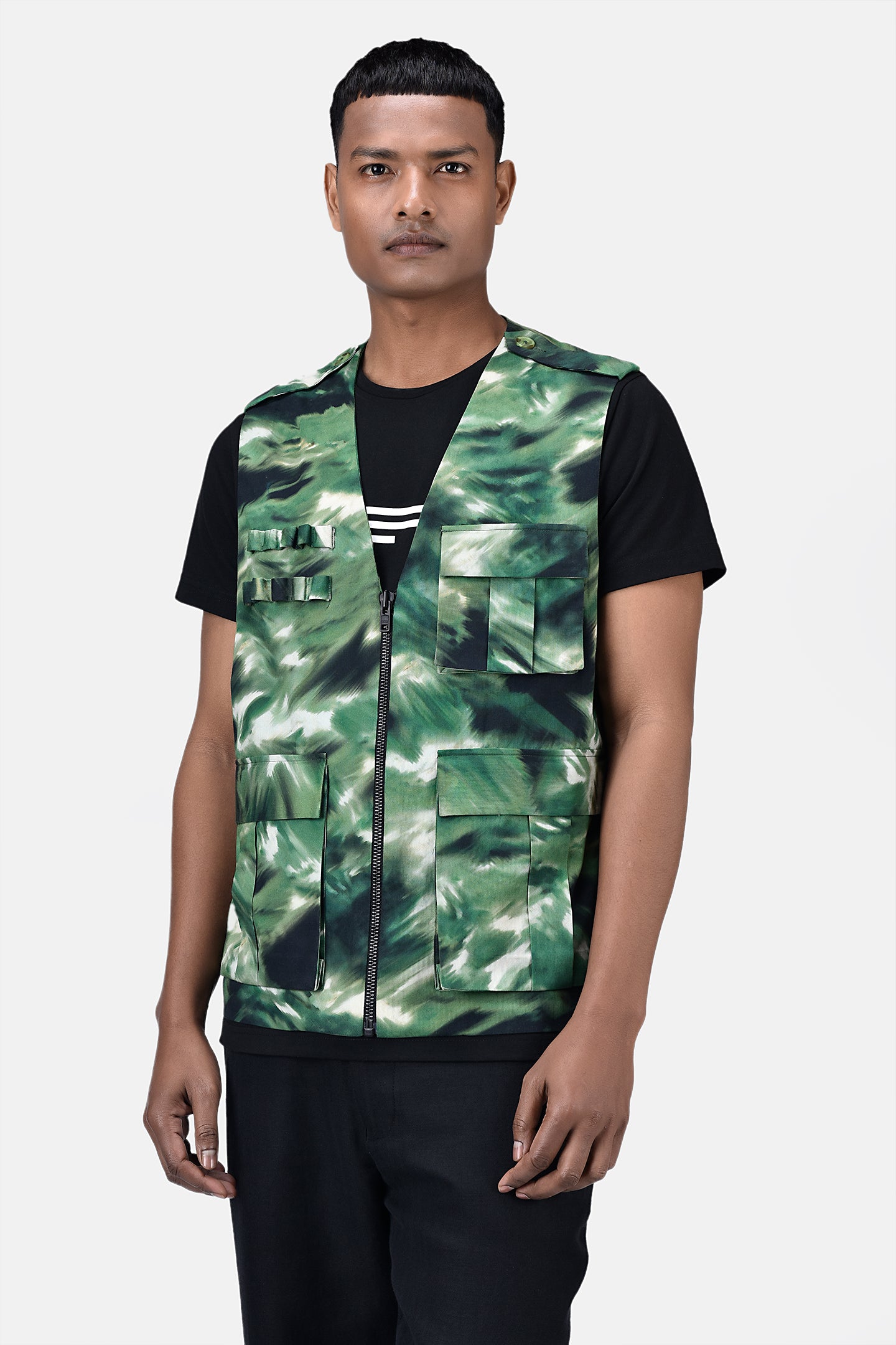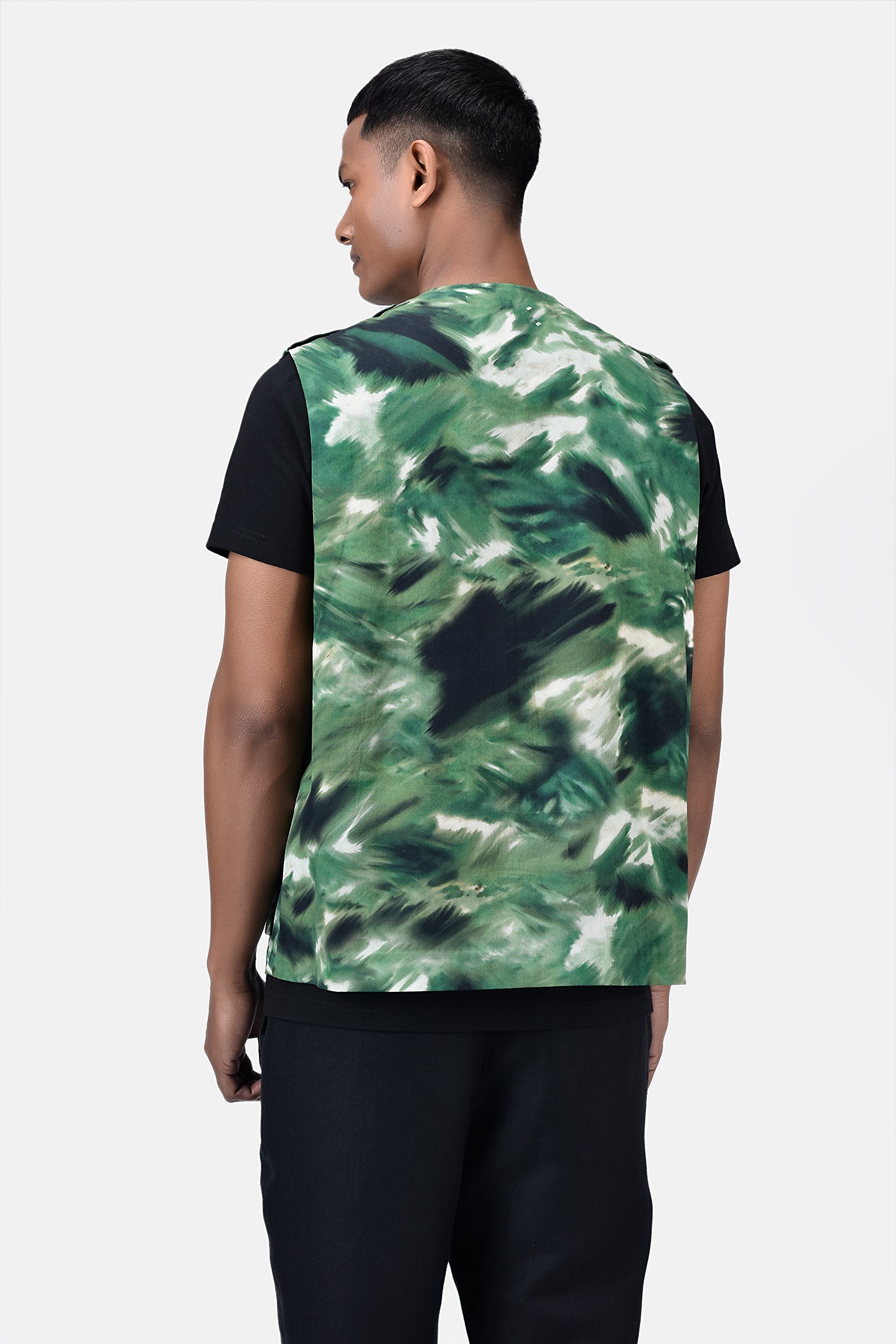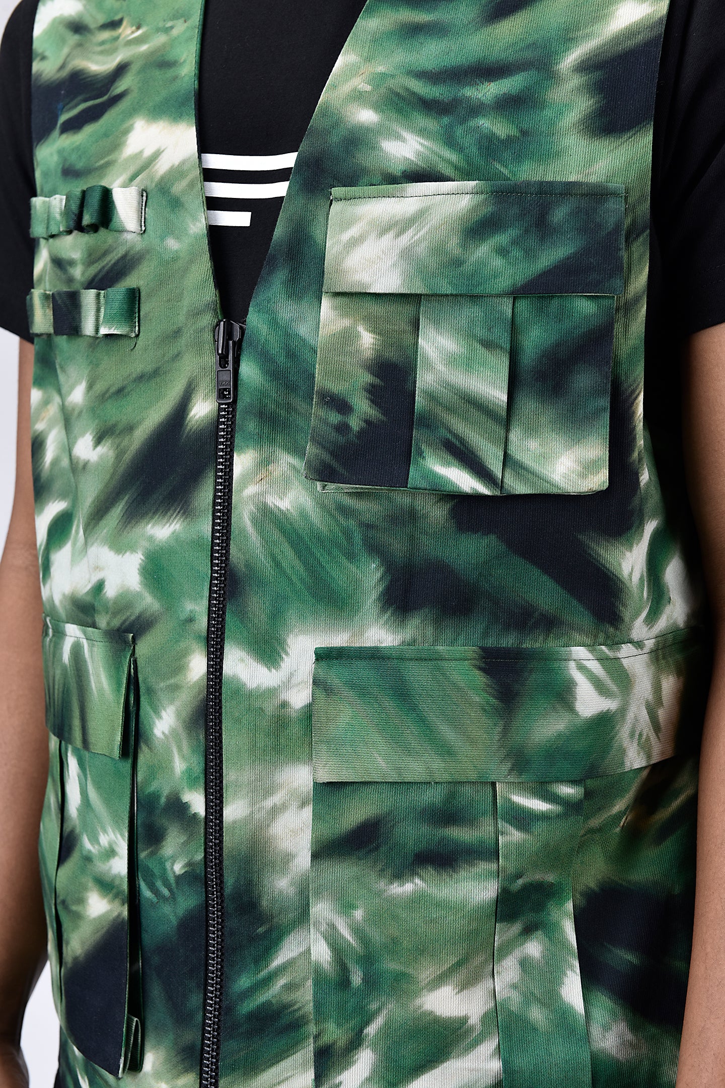 Relaxed fit V-neck gilet jacket in cotton pin corduroy, featuring multiple pockets and an all-over camouflage print for a functional and stylish outdoor look.