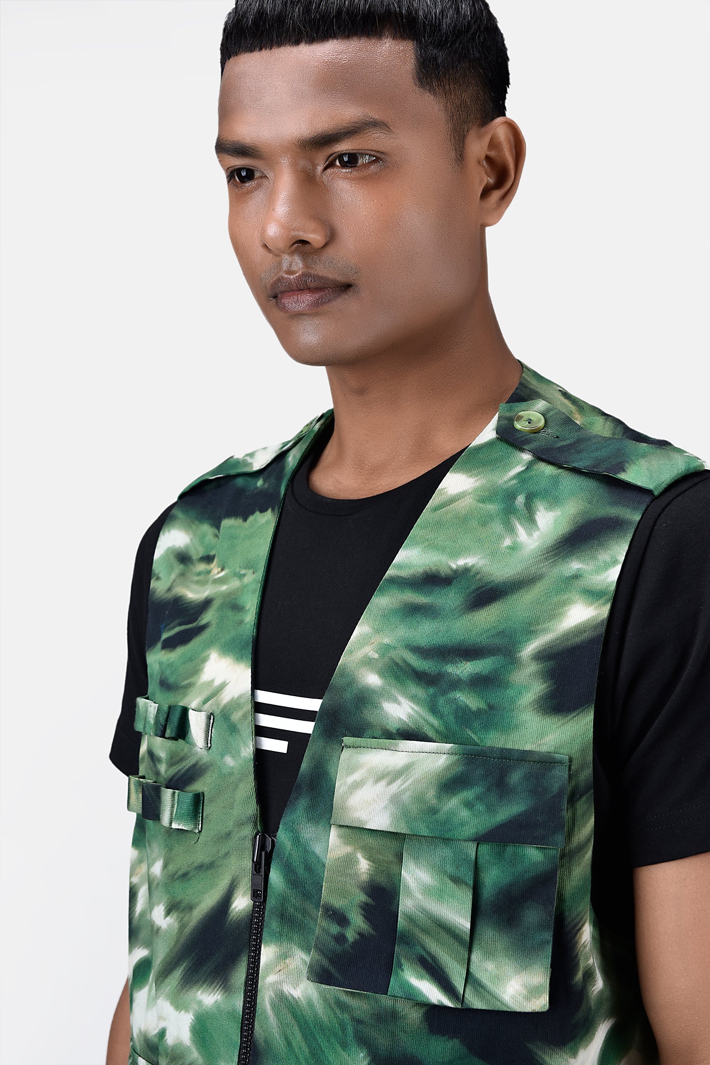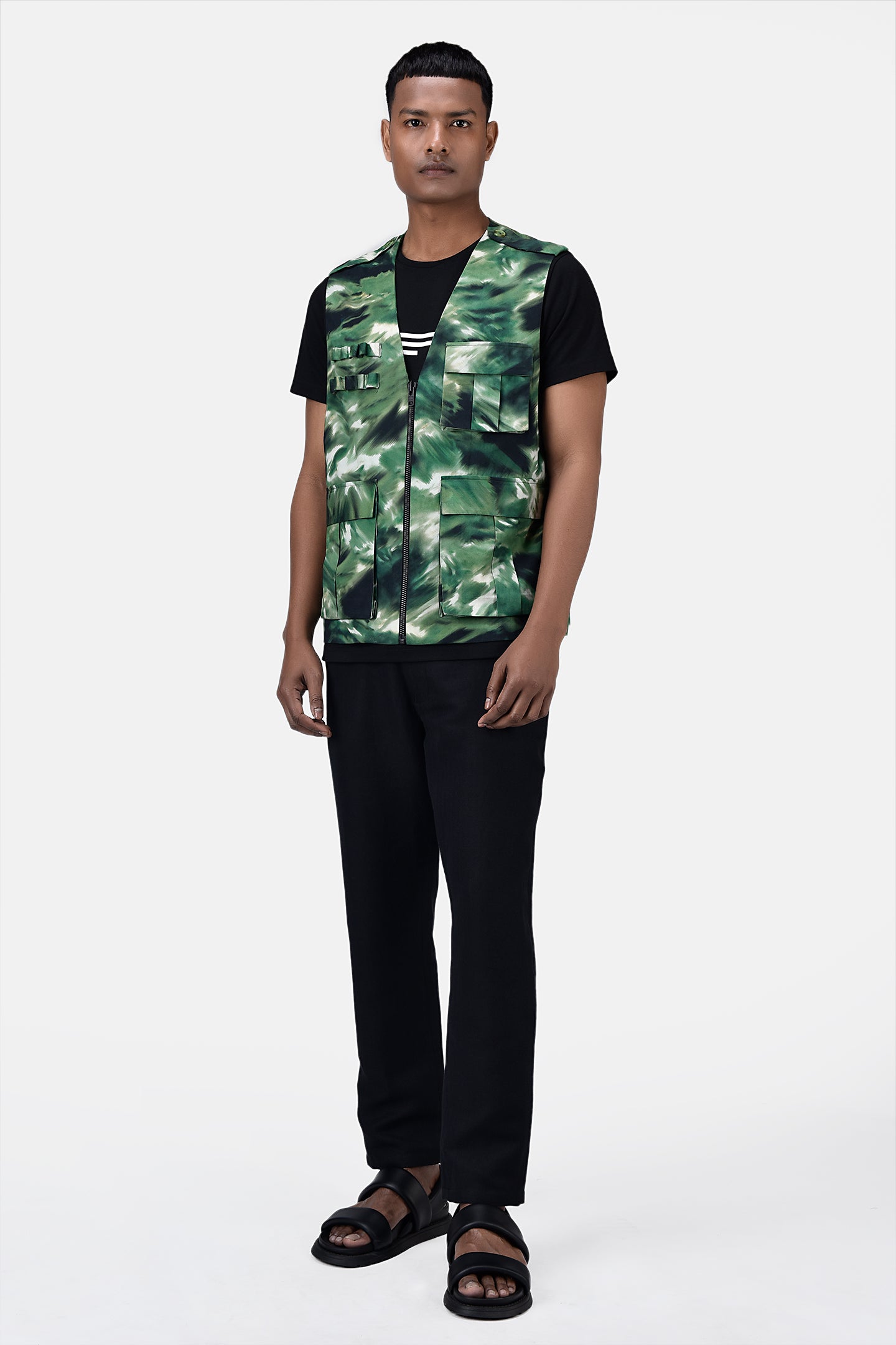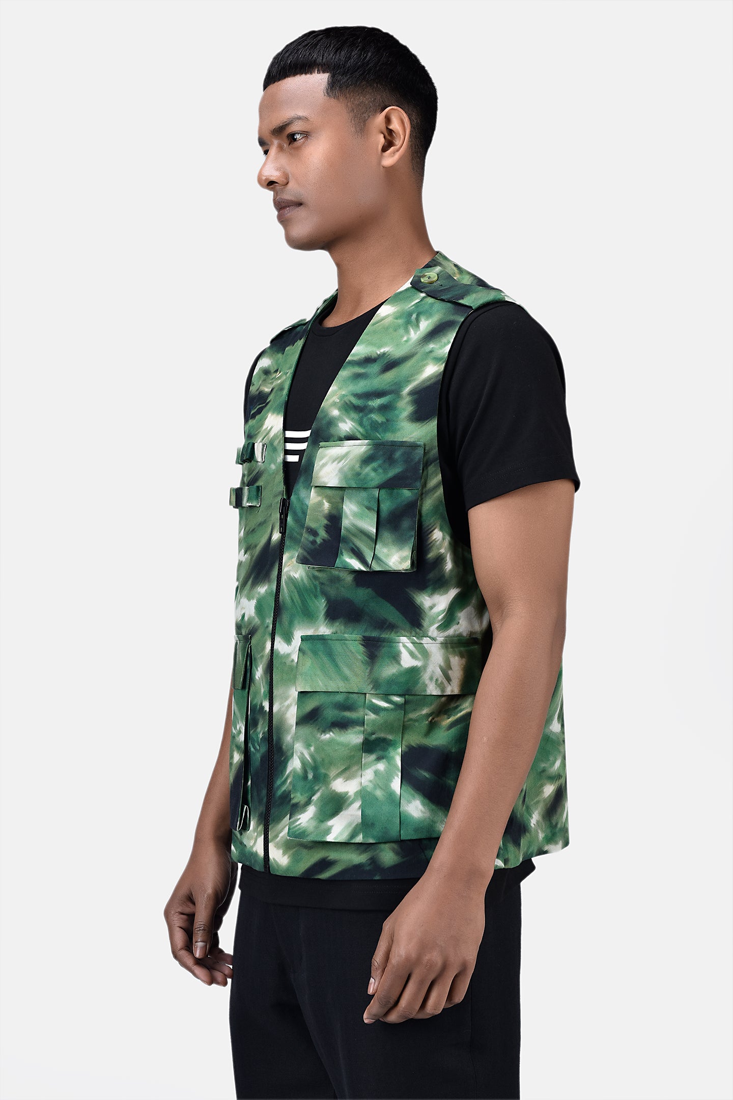 Relaxed fit V-neck gilet jacket in cotton pin corduroy, featuring multiple pockets and an all-over camouflage print for a functional and stylish outdoor look.