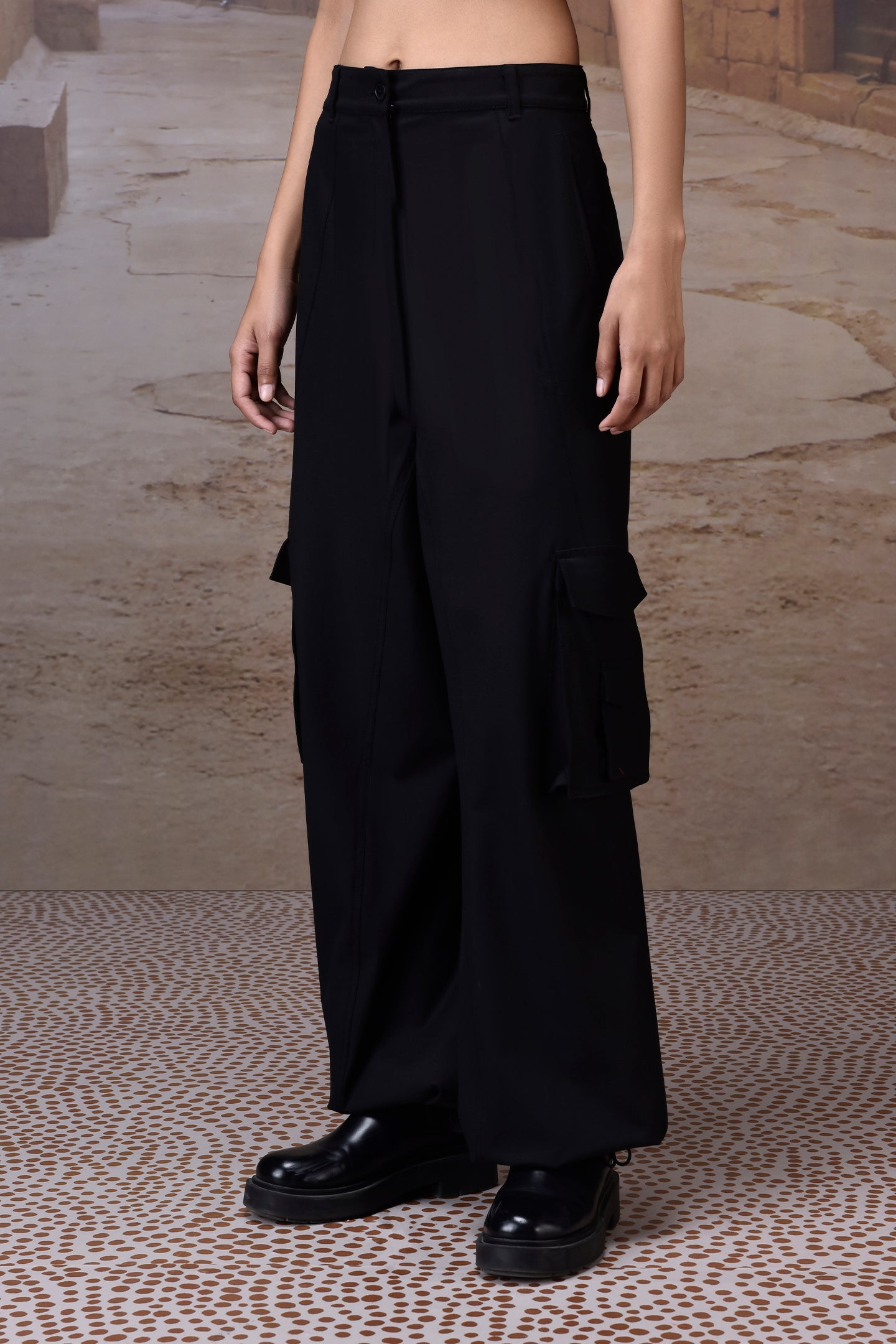 Blending utility with contemporary tailoring, these black cargo trousers are cut in smooth poly-viscose for a clean drape and everyday comfort. Designed with multiple flap cargo pockets and welt detailing at the back, they balance functionality with a streamlined wide-leg silhouette. The mid-rise waistband and precise cut elongate the frame, making them versatile enough for workdays, casual edits, or elevated streetwear looks.
