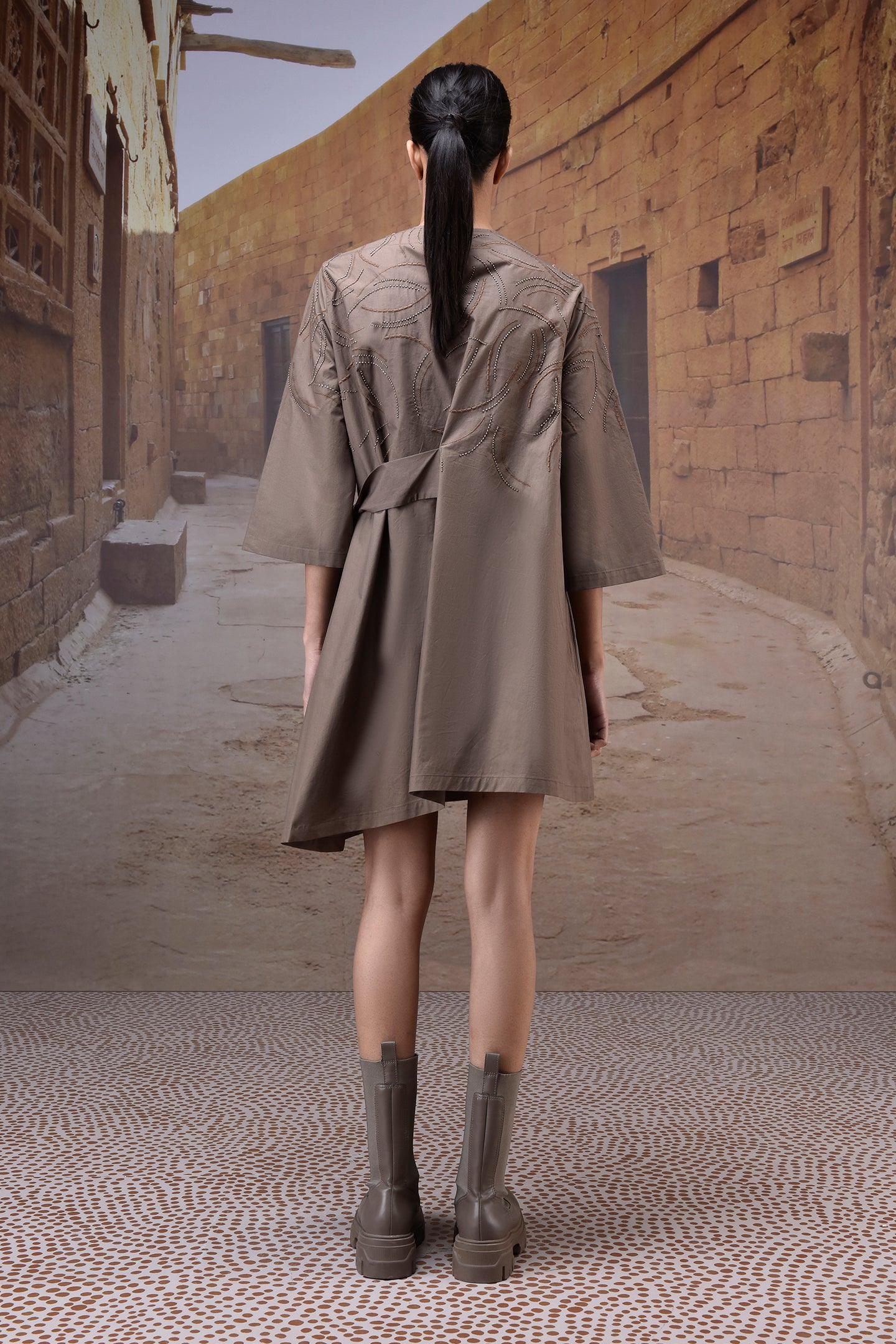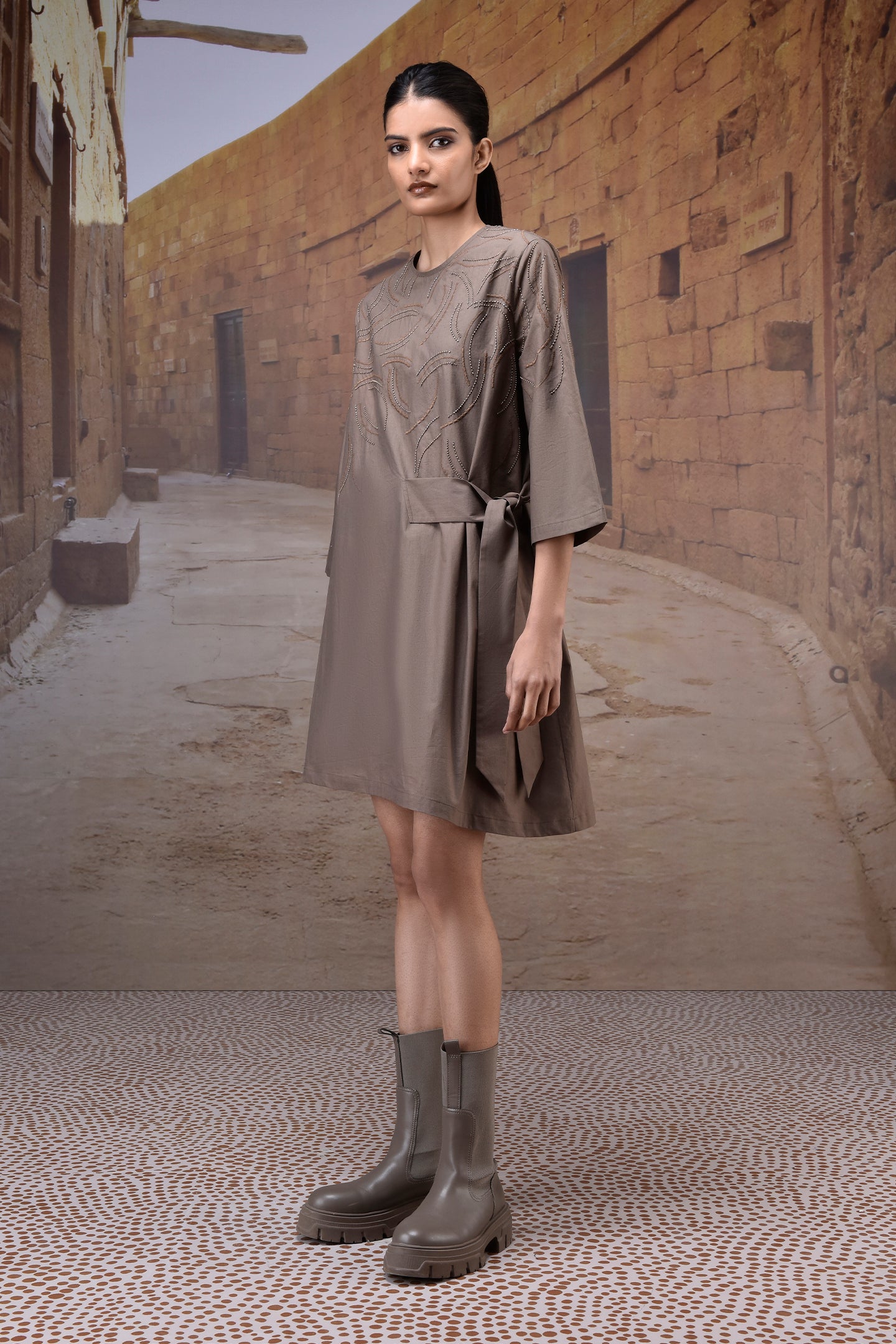 Crisp yet fluid, this warm beige Giza cotton poplin dress redefines relaxed sophistication. The straight silhouette is softened with tonal embroidery across the bodice, while a side tie detail adds subtle structure. With its round neckline and three-quarter sleeves, the piece balances modern ease with timeless refinement.