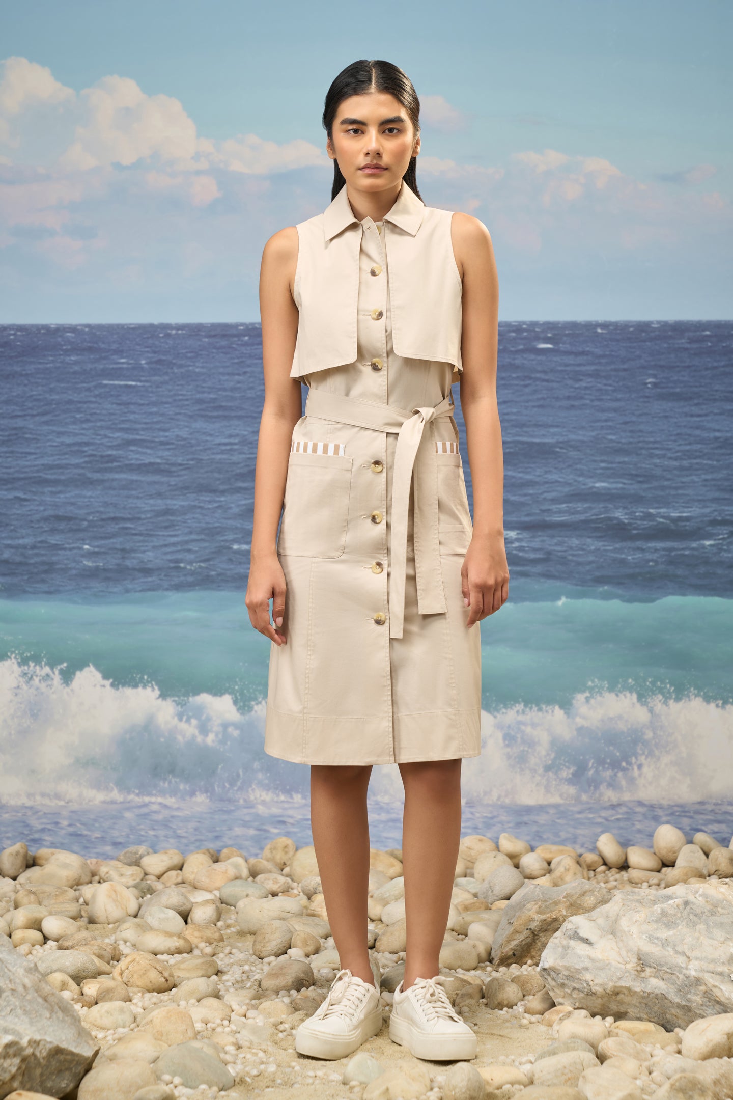 Beige Premium Cotton Lycra Sleeveless Shirt Dress