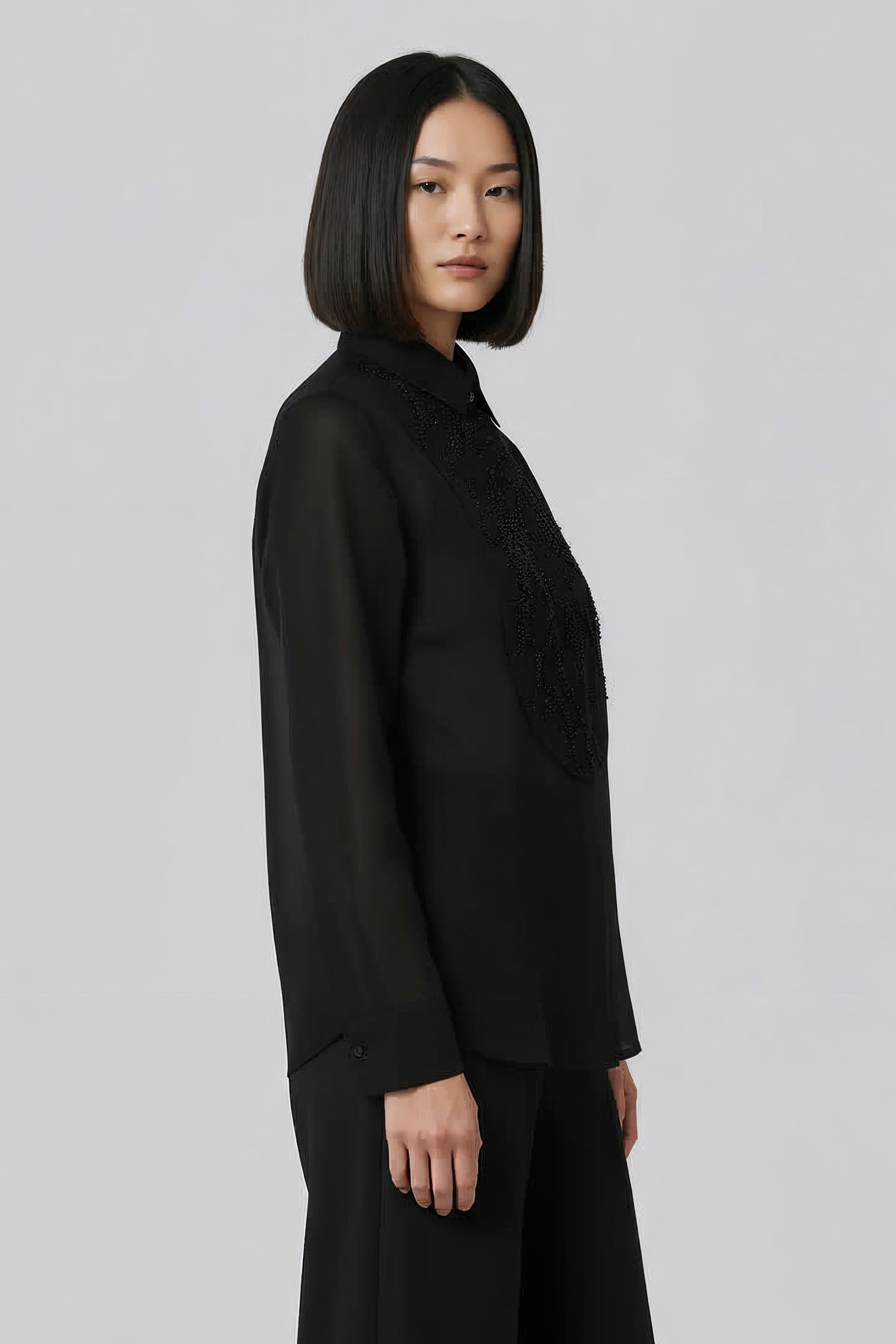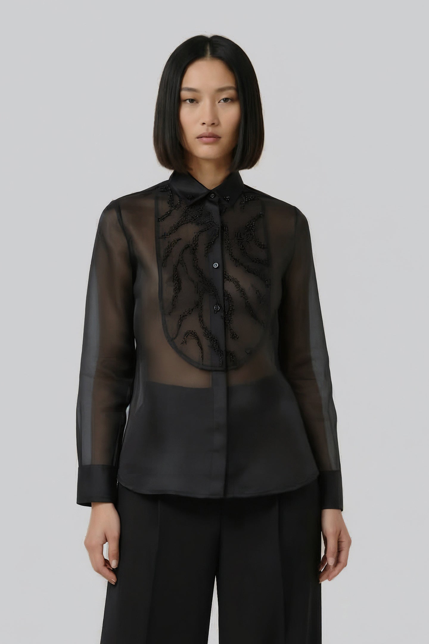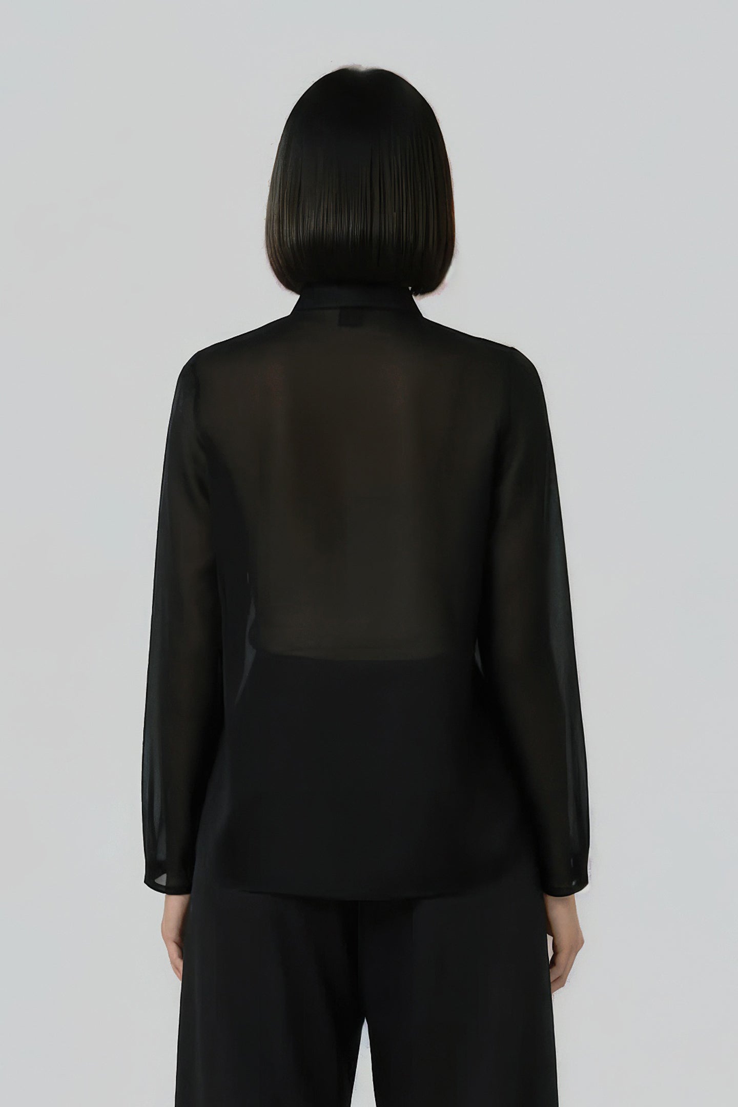 Crafted from 100% polyester organza, this shirt is a study in refined transparency and sculpted delicacy. The fabric’s airy lightness and subtle sheen lend it a sensuous fluidity, while the tailored cut ensures an elegant, structured fit.