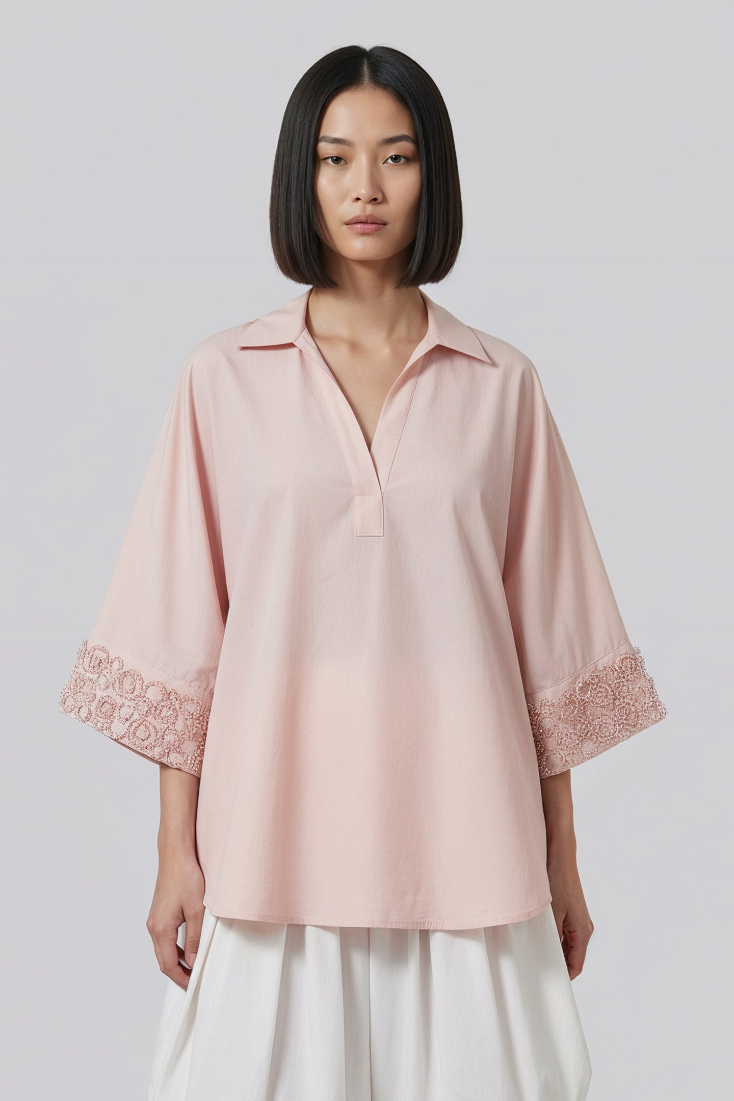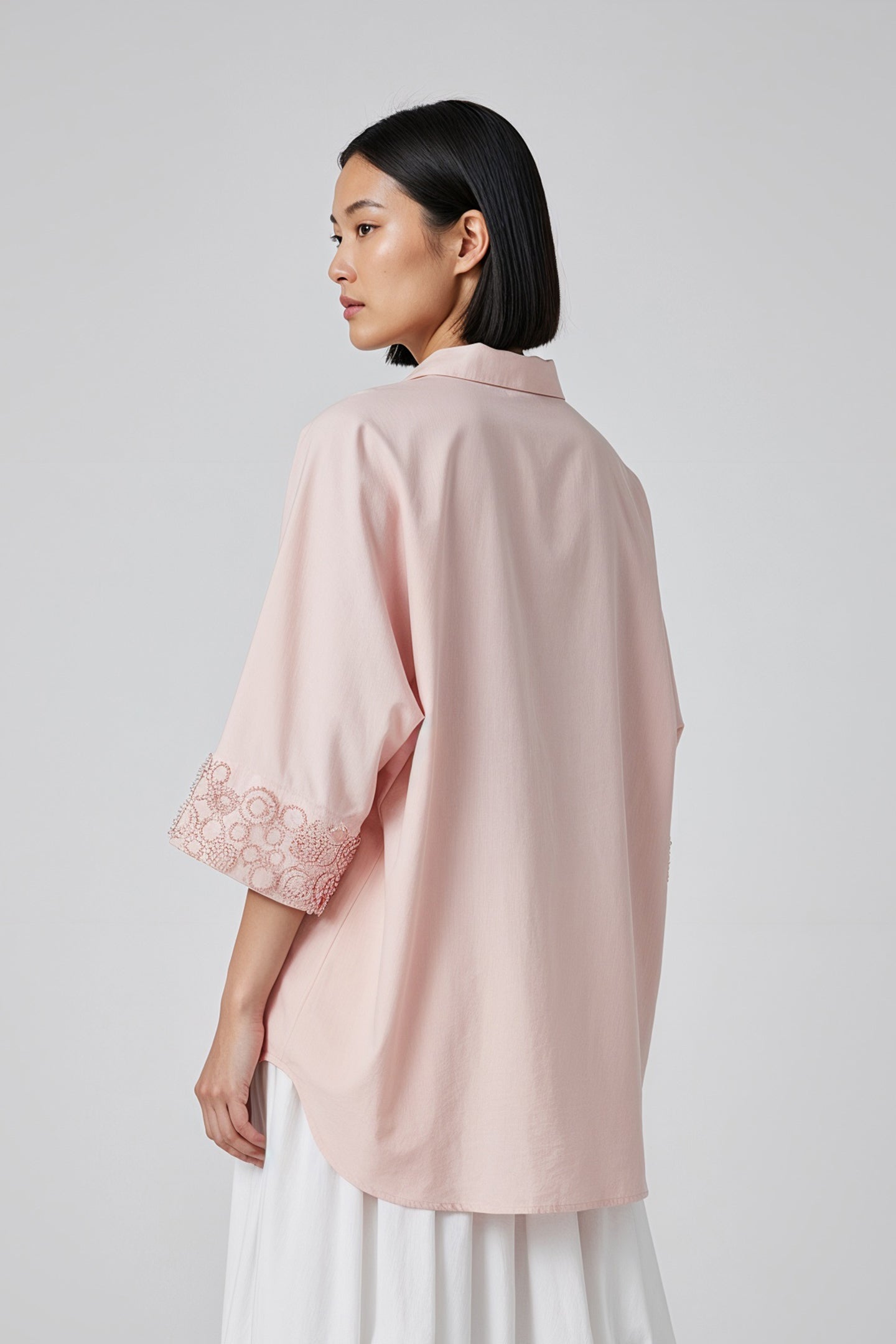 ¾-length sleeves with tonal embroidered cuffs