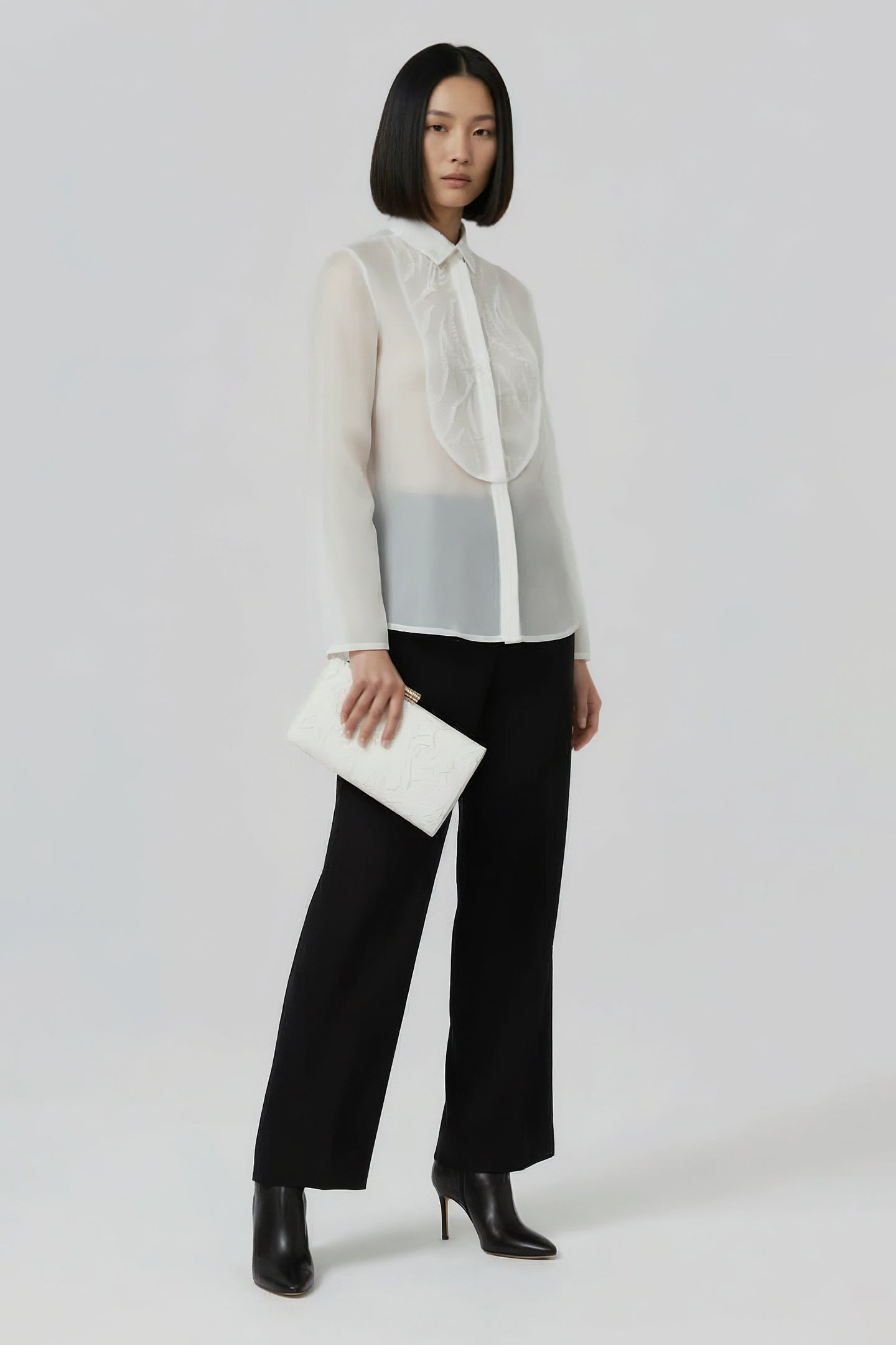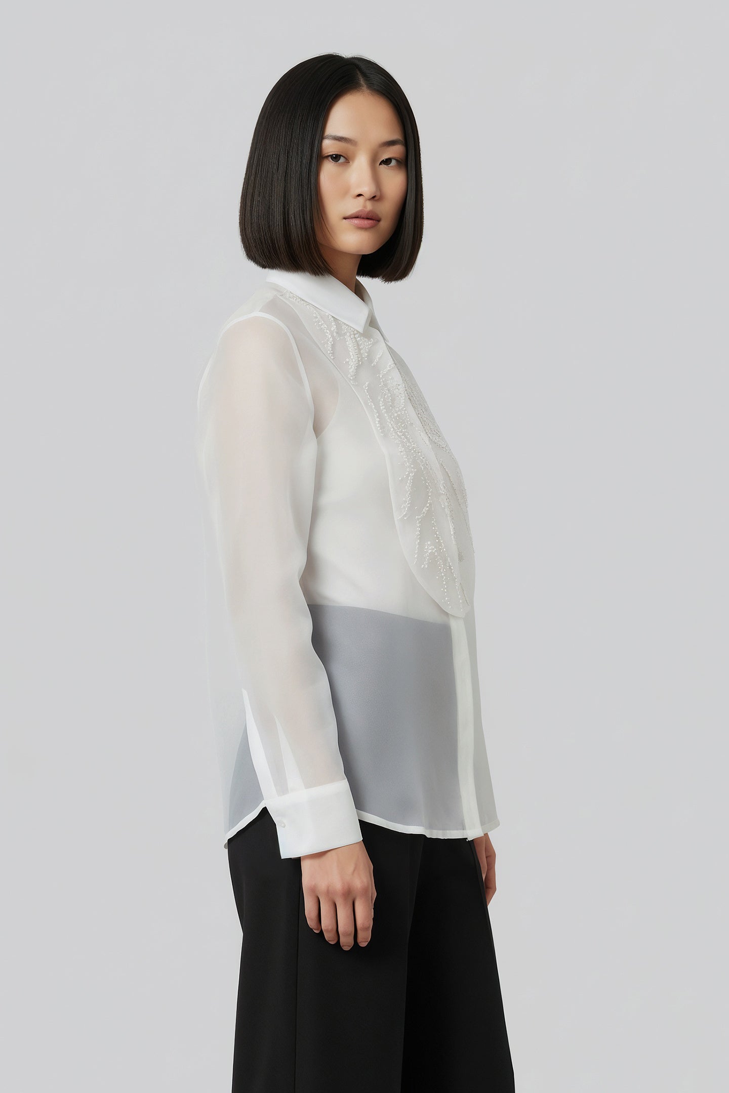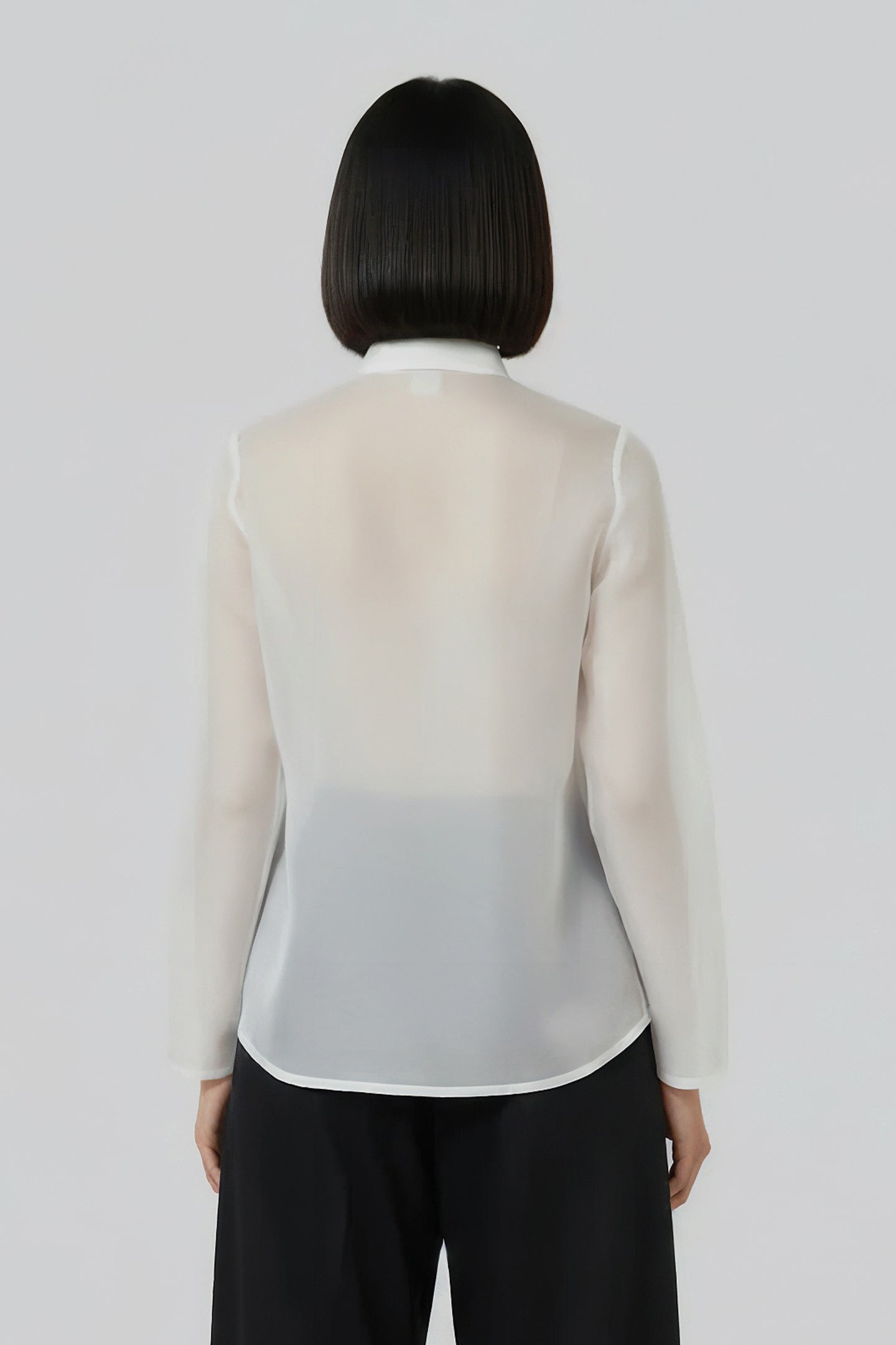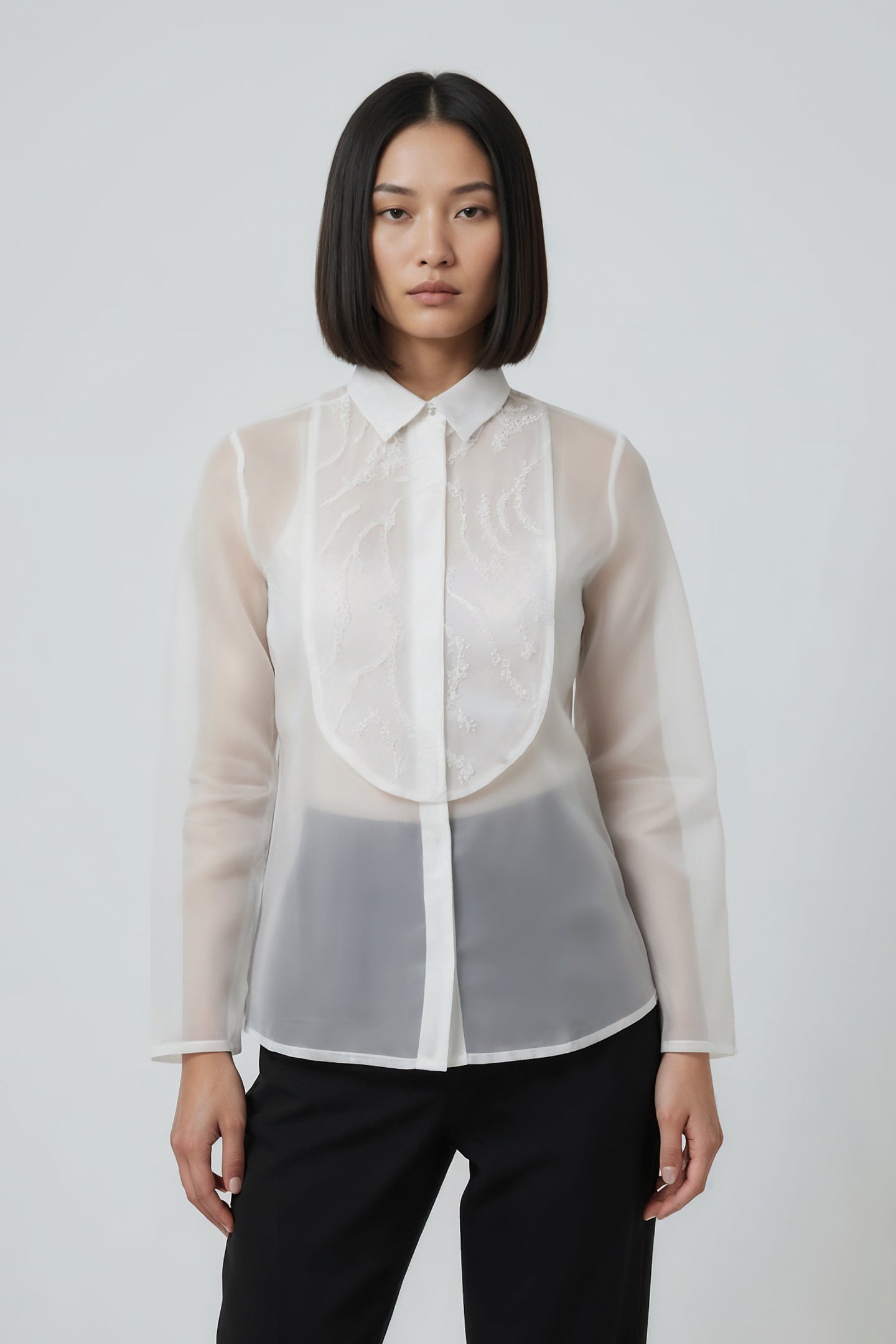 Crafted from 100% polyester organza, this shirt captures ethereal lightness through an interplay of translucence and texture. The fabric’s gossamer quality and soft sheen lend a delicate sophistication, while precise tailoring ensures structure within its airy form.