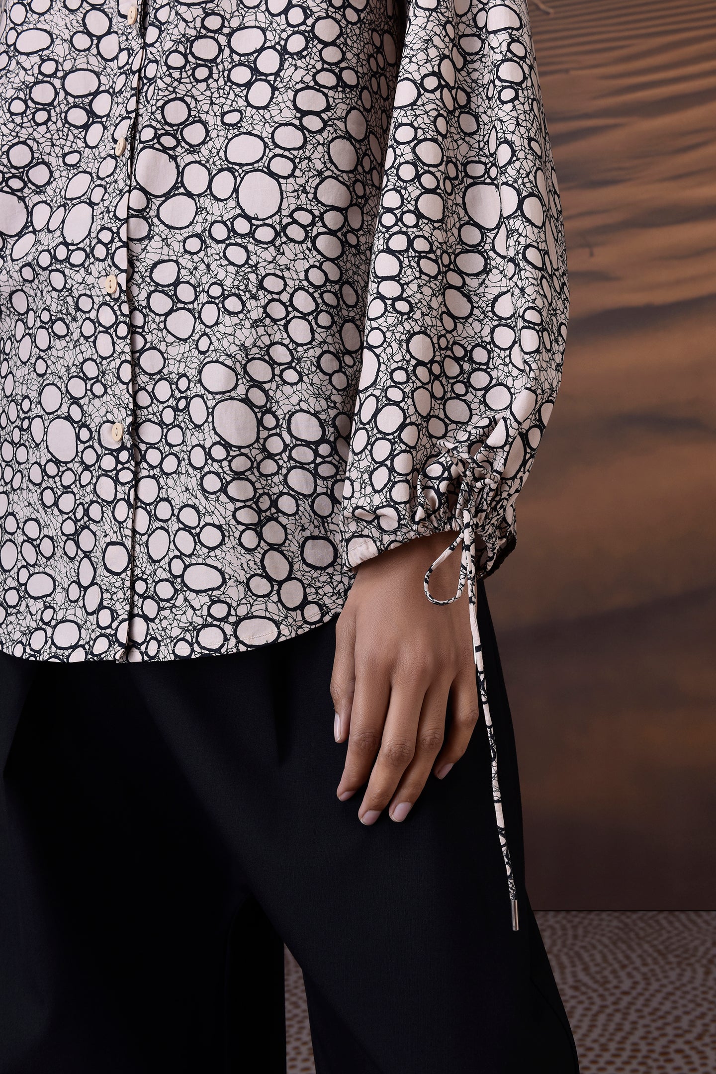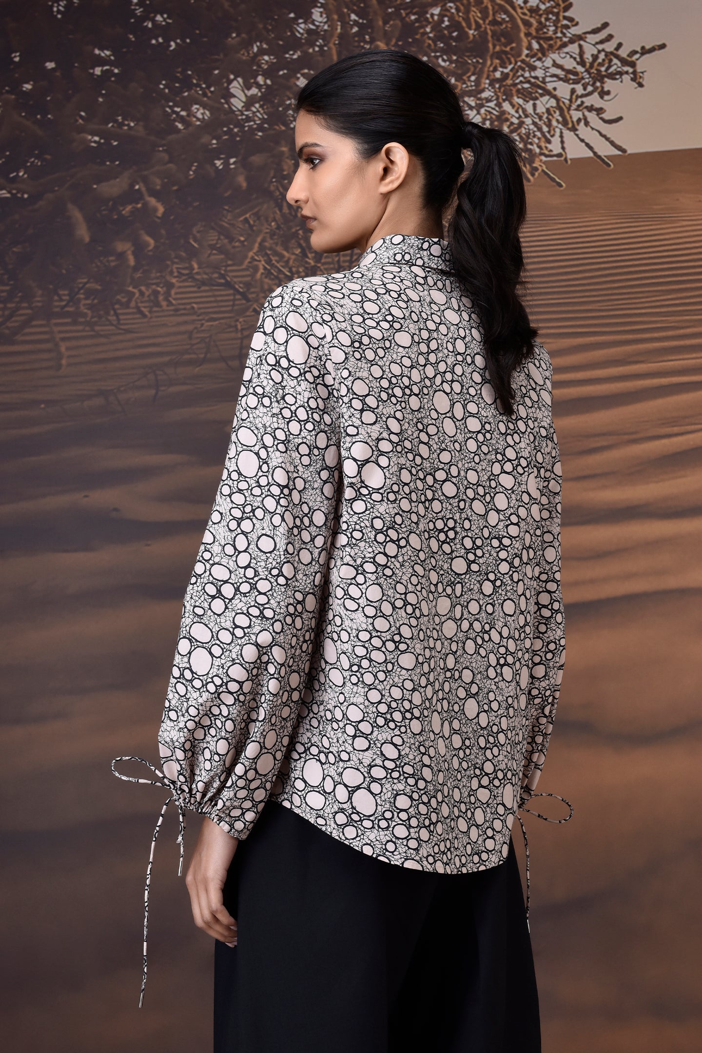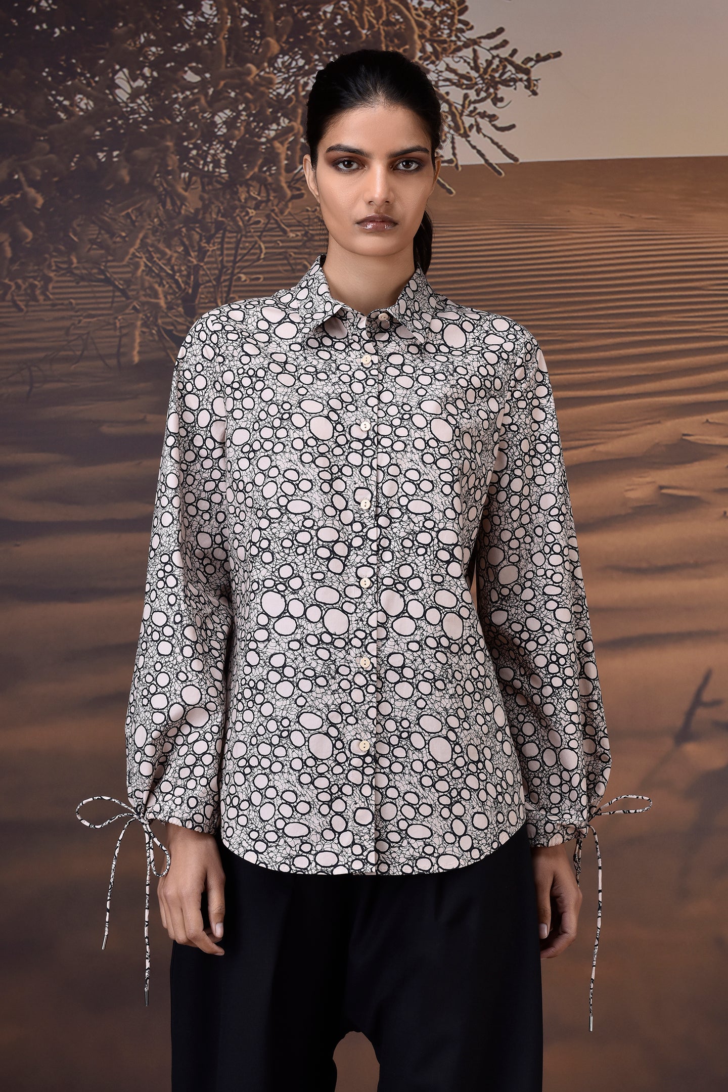 Finished with soft volume through the sleeves and delicate drawstring ties at the cuffs, it’s equal parts refined and wearable. The classic spread collar and button-down front offer versatility, whether worn tucked into trousers or layered under a jacket.