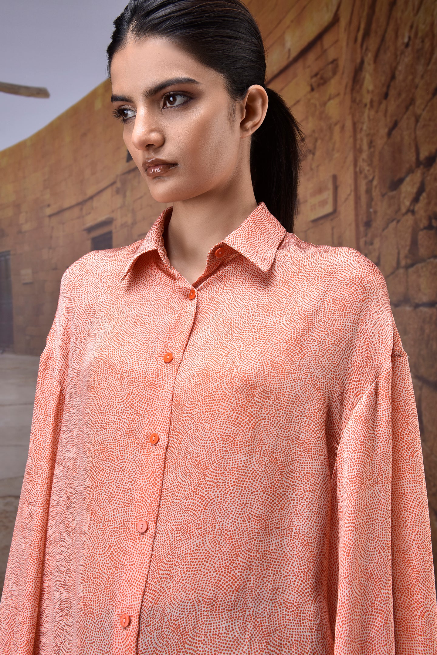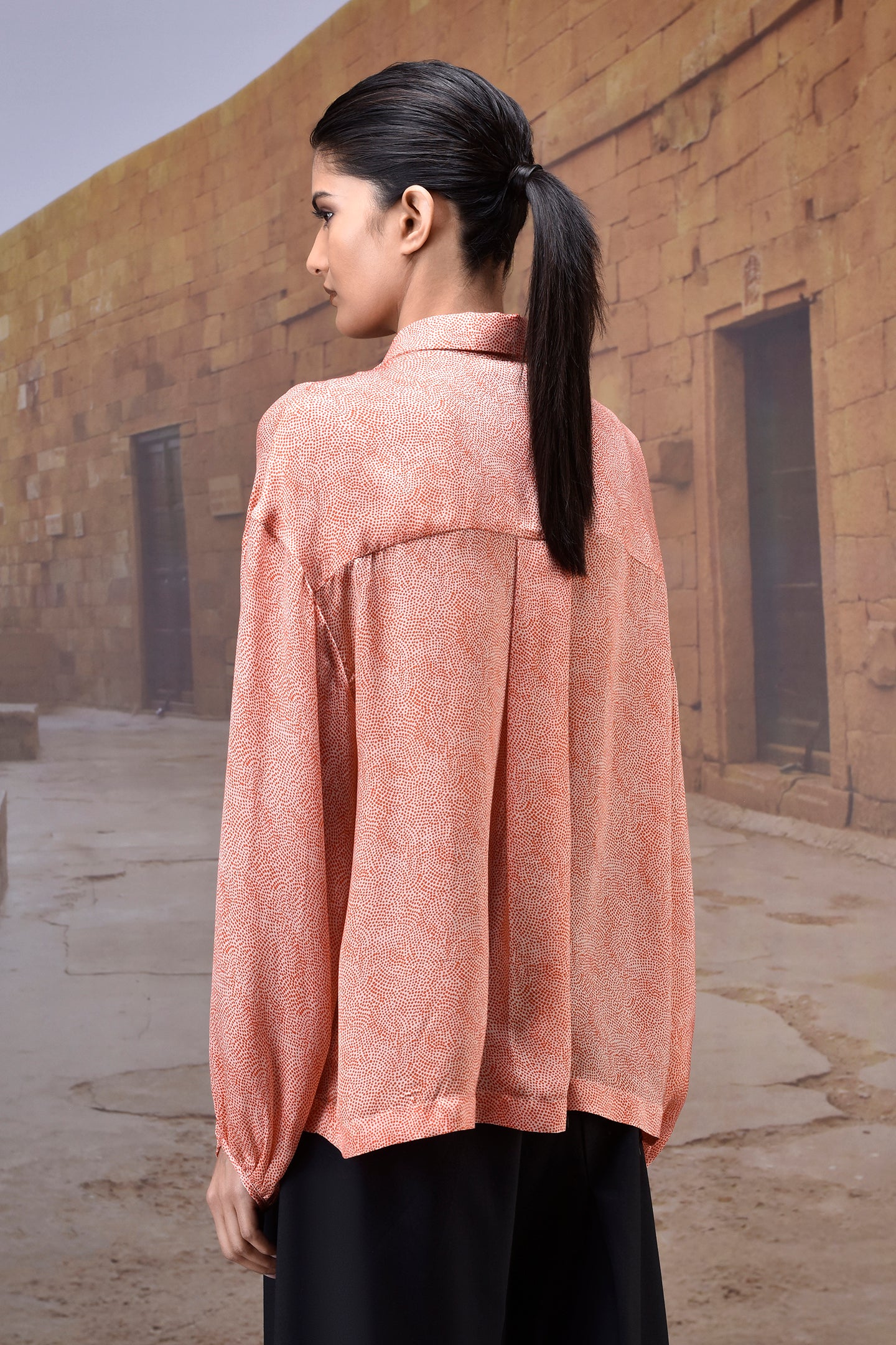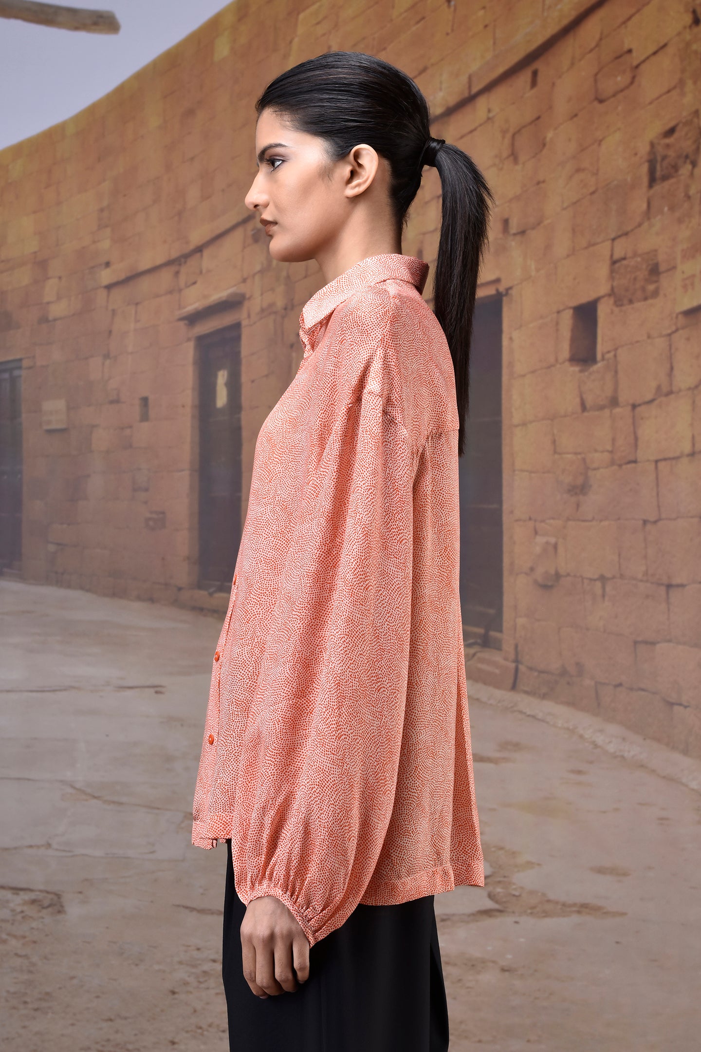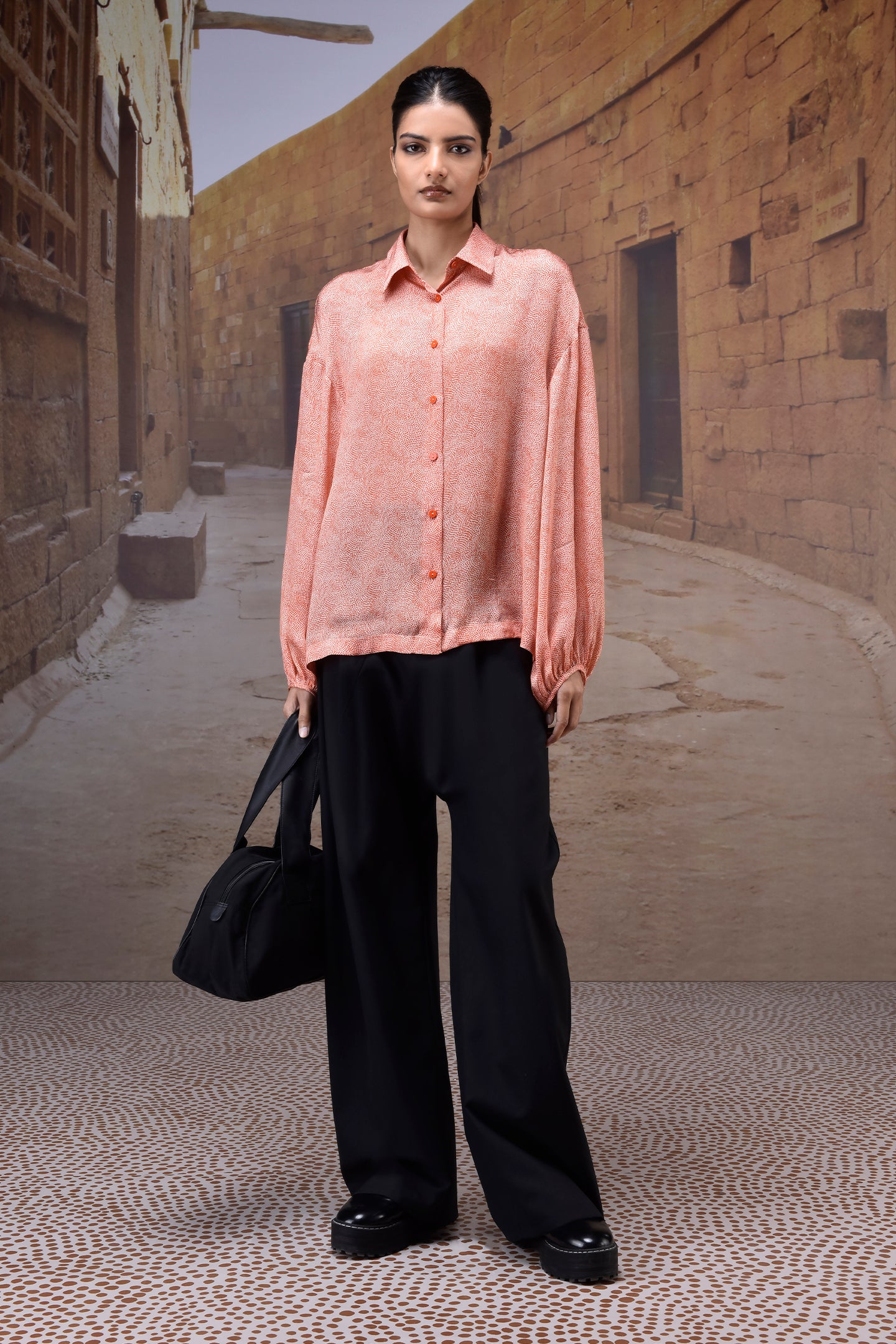 Rendered in soft viscose satin, this printed shirt offers a lustrous drape and relaxed sophistication. The design features a clean spread collar and a visible button placket, balanced by voluminous long sleeves gathered into buttoned cuffs. The fluid fabric enhances the silhouette with subtle movement, while the back yoke with pleat detail ensures ease. A versatile piece that transitions effortlessly from casual daywear to evening polish.