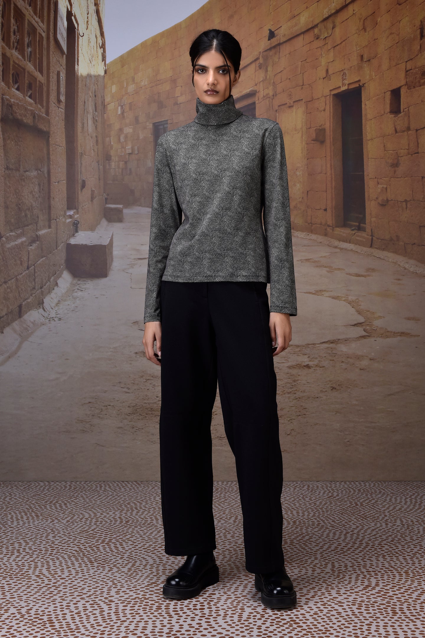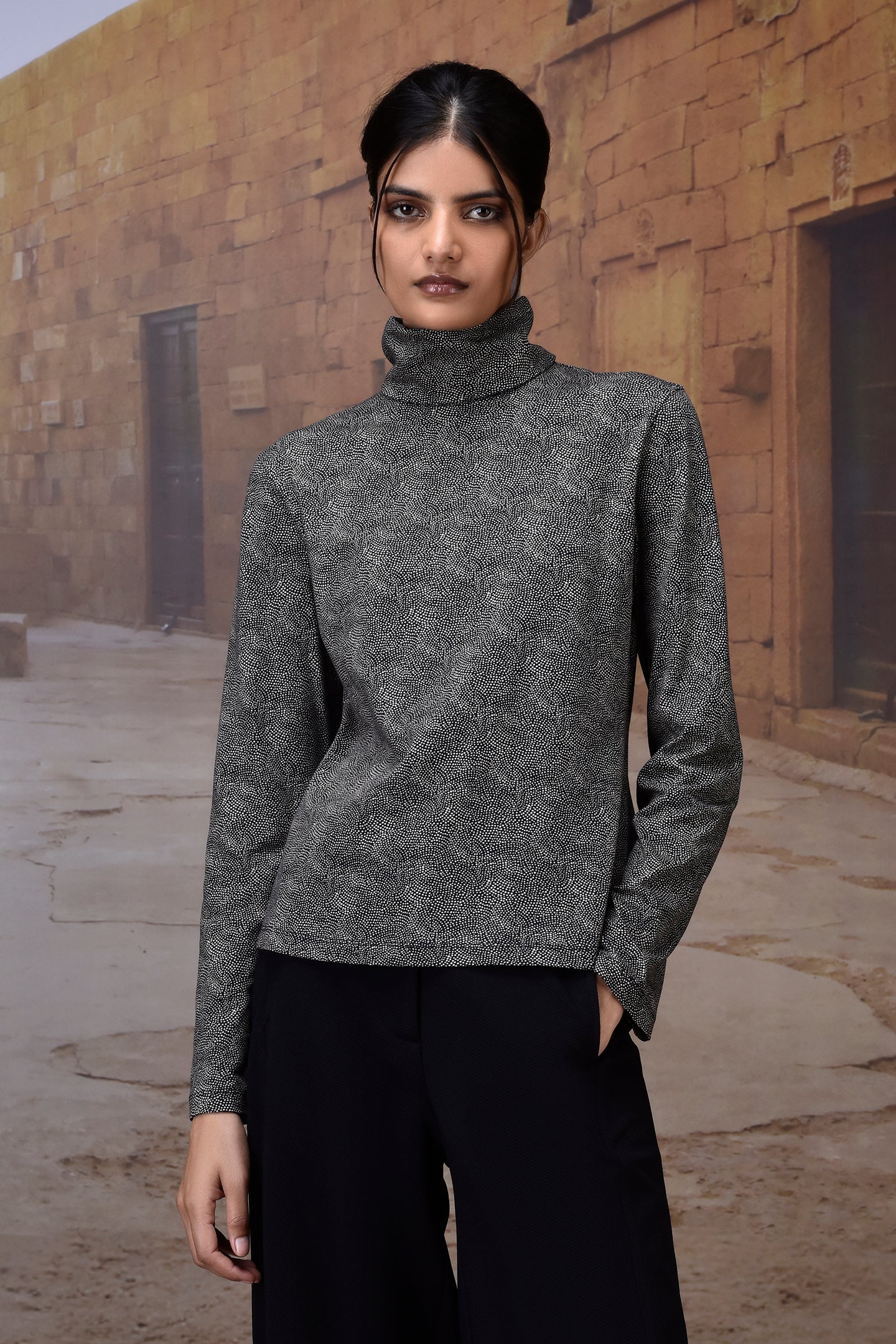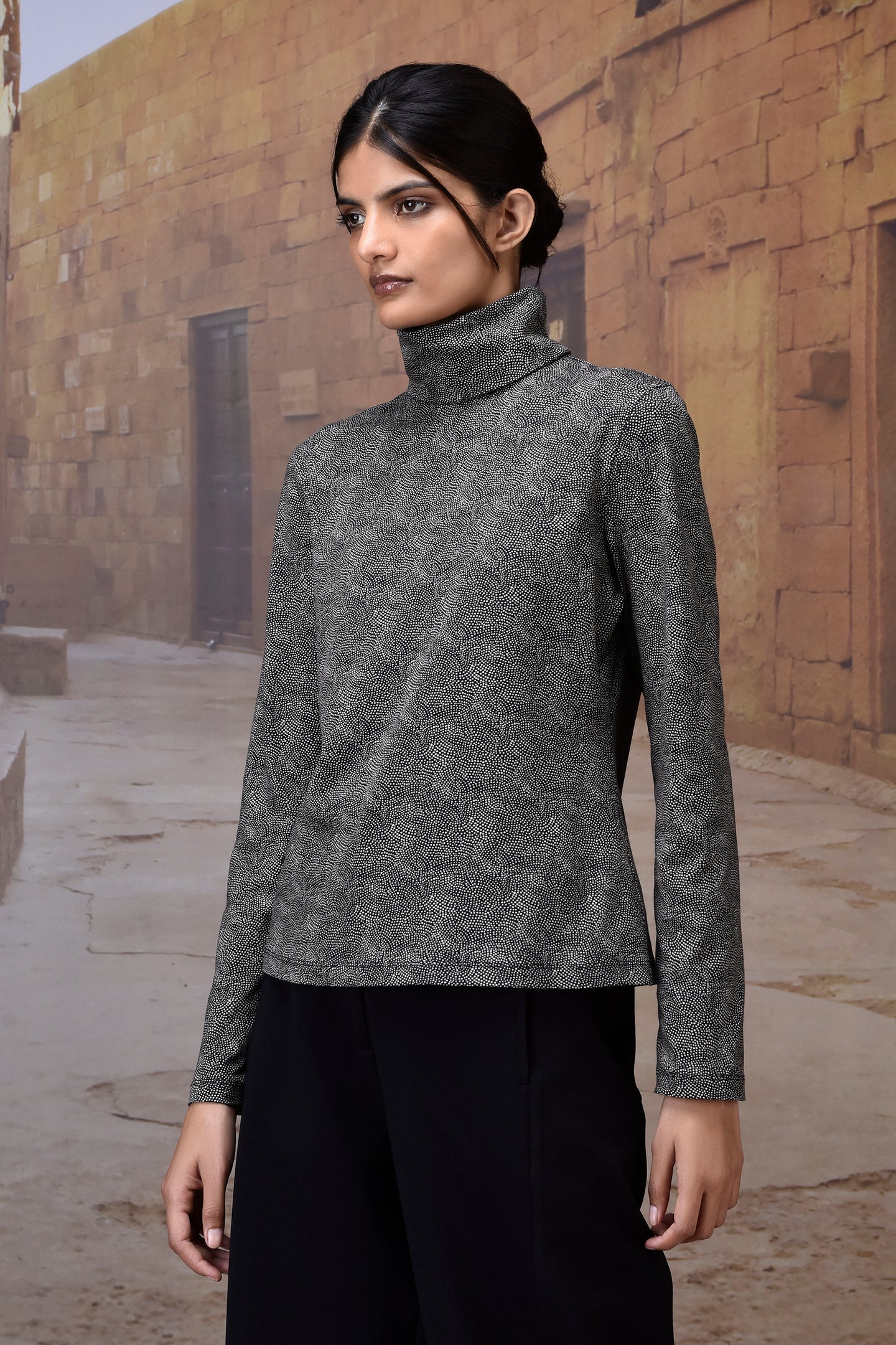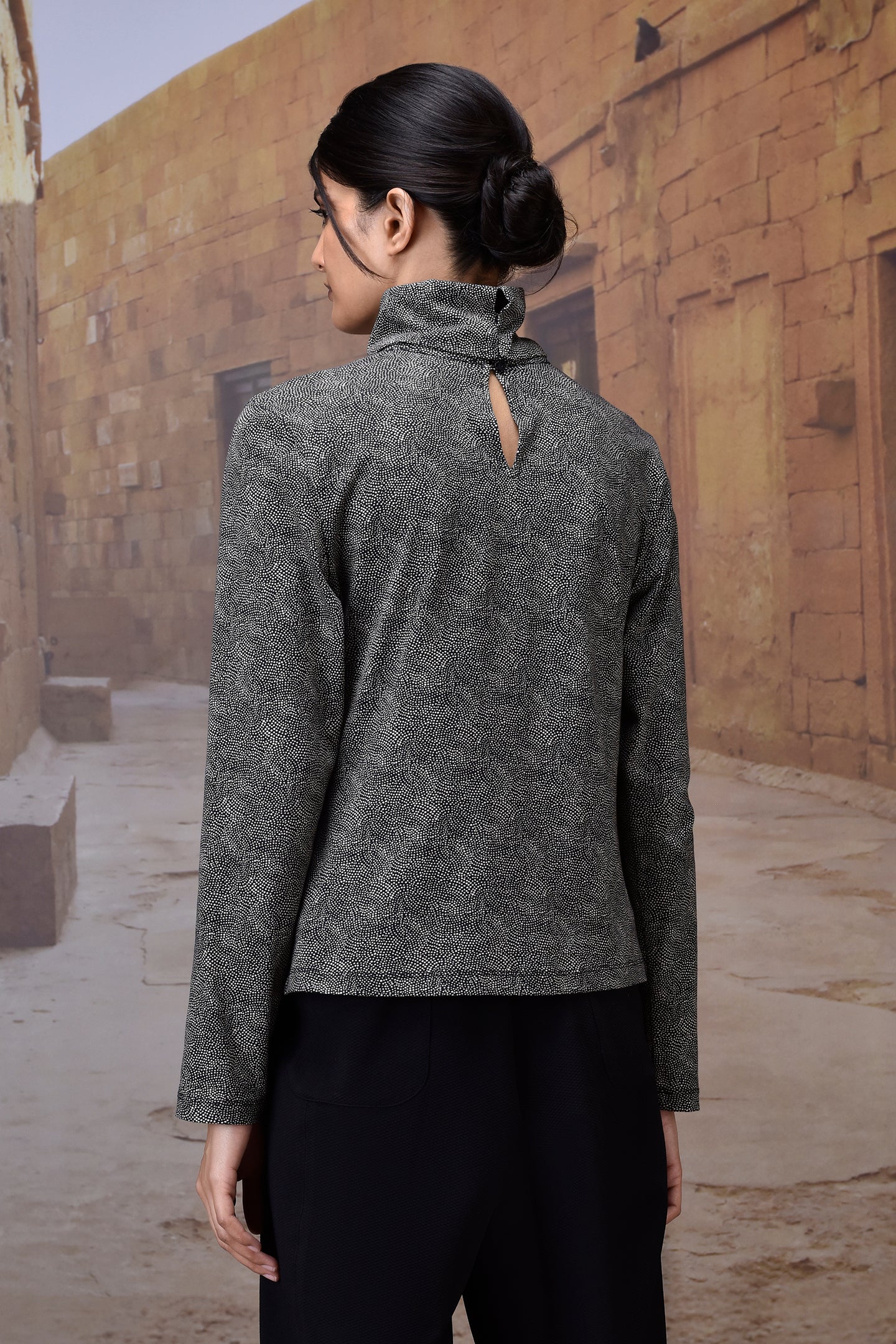Crafted from premium cotton single jersey, this black high-neck top is elevated with a subtle micro-dot pattern for a refined, modern touch. Its soft yet structured fabric ensures all-day comfort, while the sleek silhouette makes it a versatile piece for both casual and elevated styling. The back button closure adds a hint of detailing while keeping the design minimal and chic.
