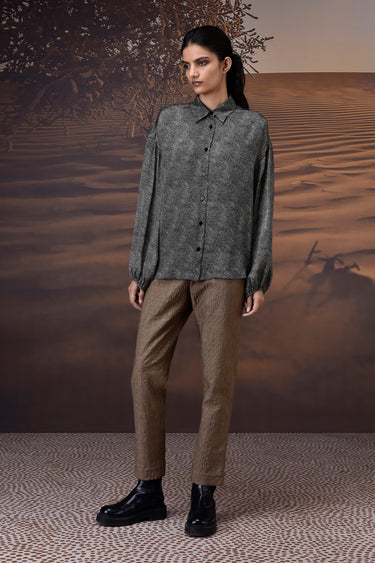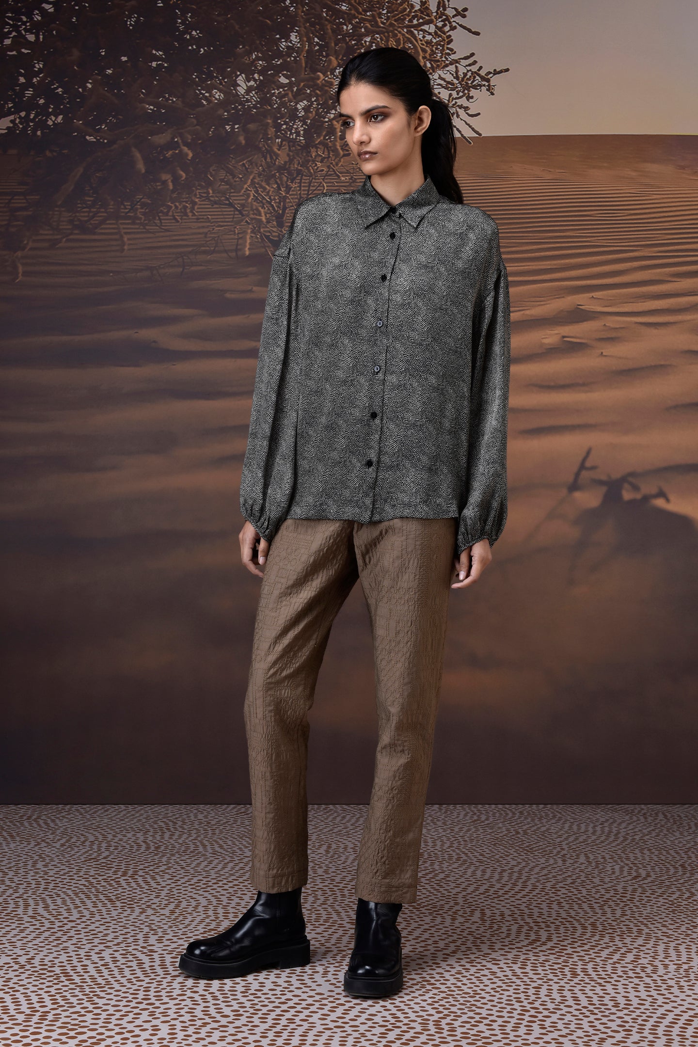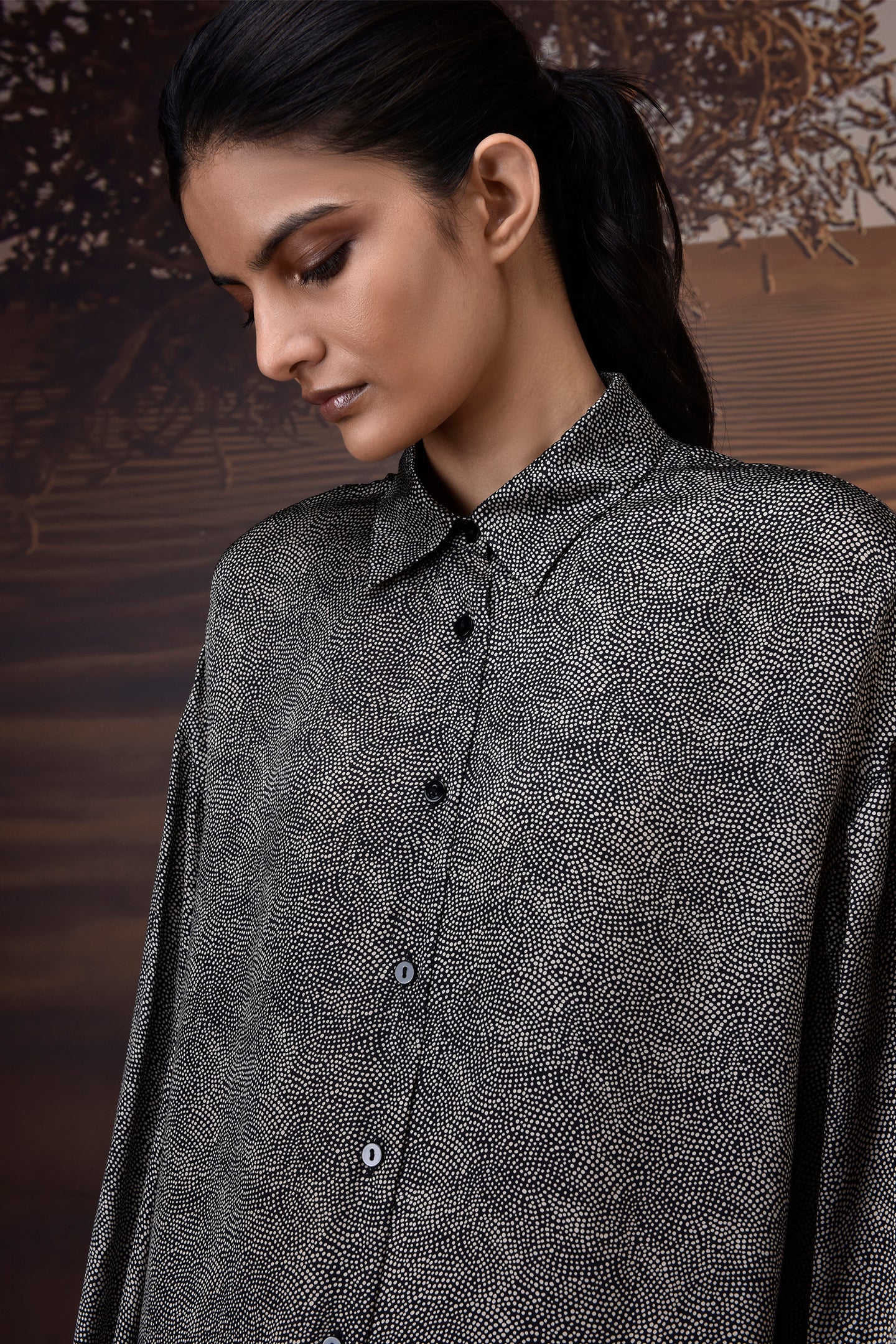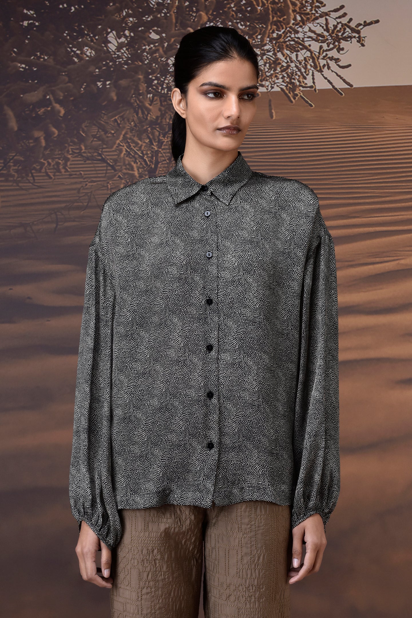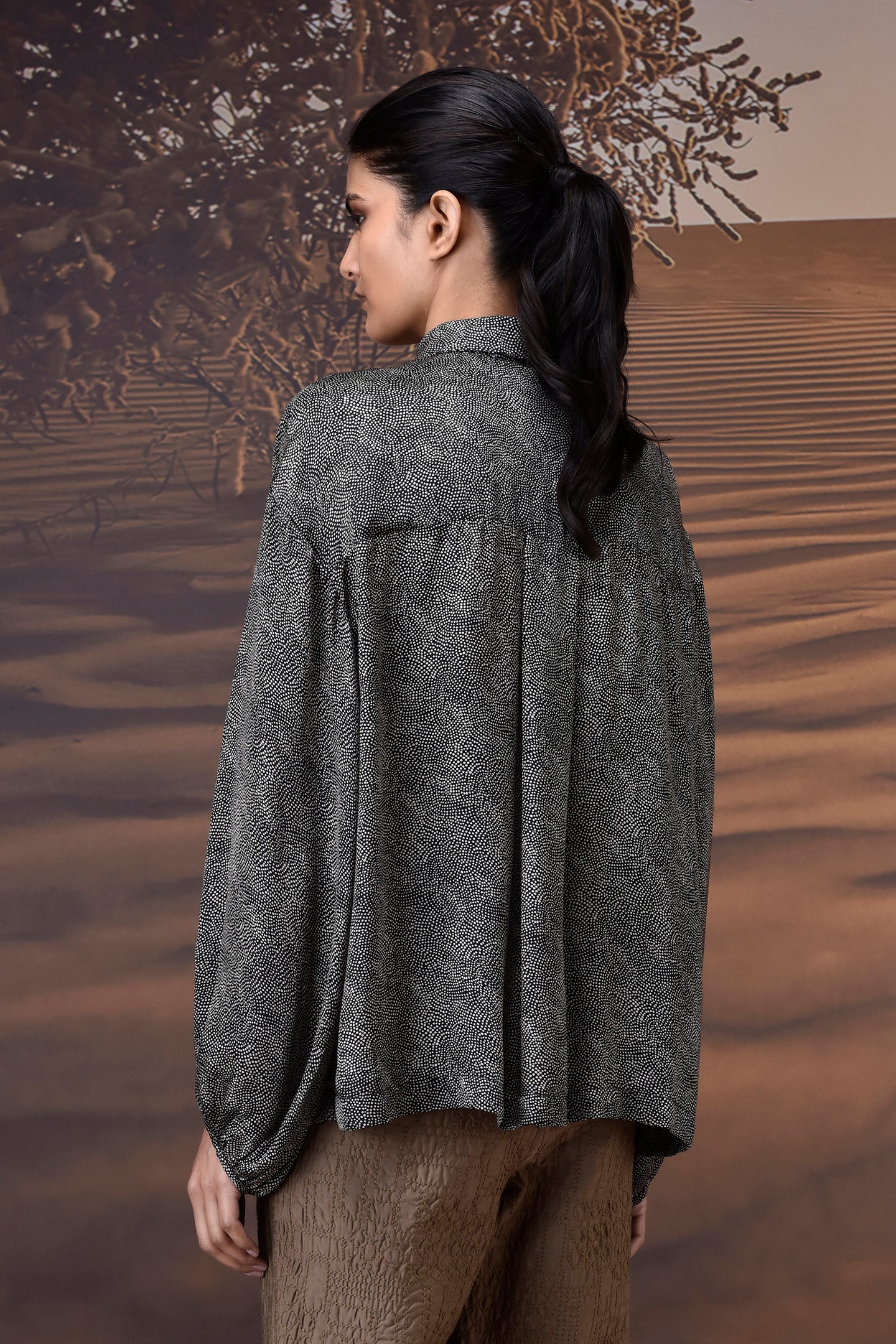 Rendered in soft viscose satin, this black shirt offers a lustrous drape and refined sophistication. The design features a clean spread collar and a visible button placket, balanced by voluminous long sleeves gathered into buttoned cuffs. The fluid fabric enhances the silhouette with subtle movement, while the back yoke with pleat detail ensures ease. A versatile piece that transitions effortlessly from casual daywear to evening polish.