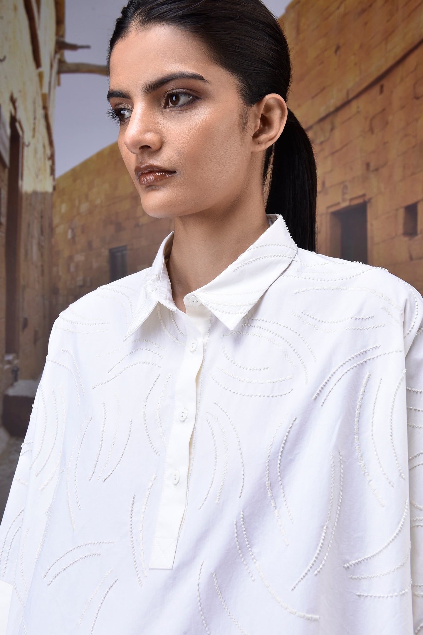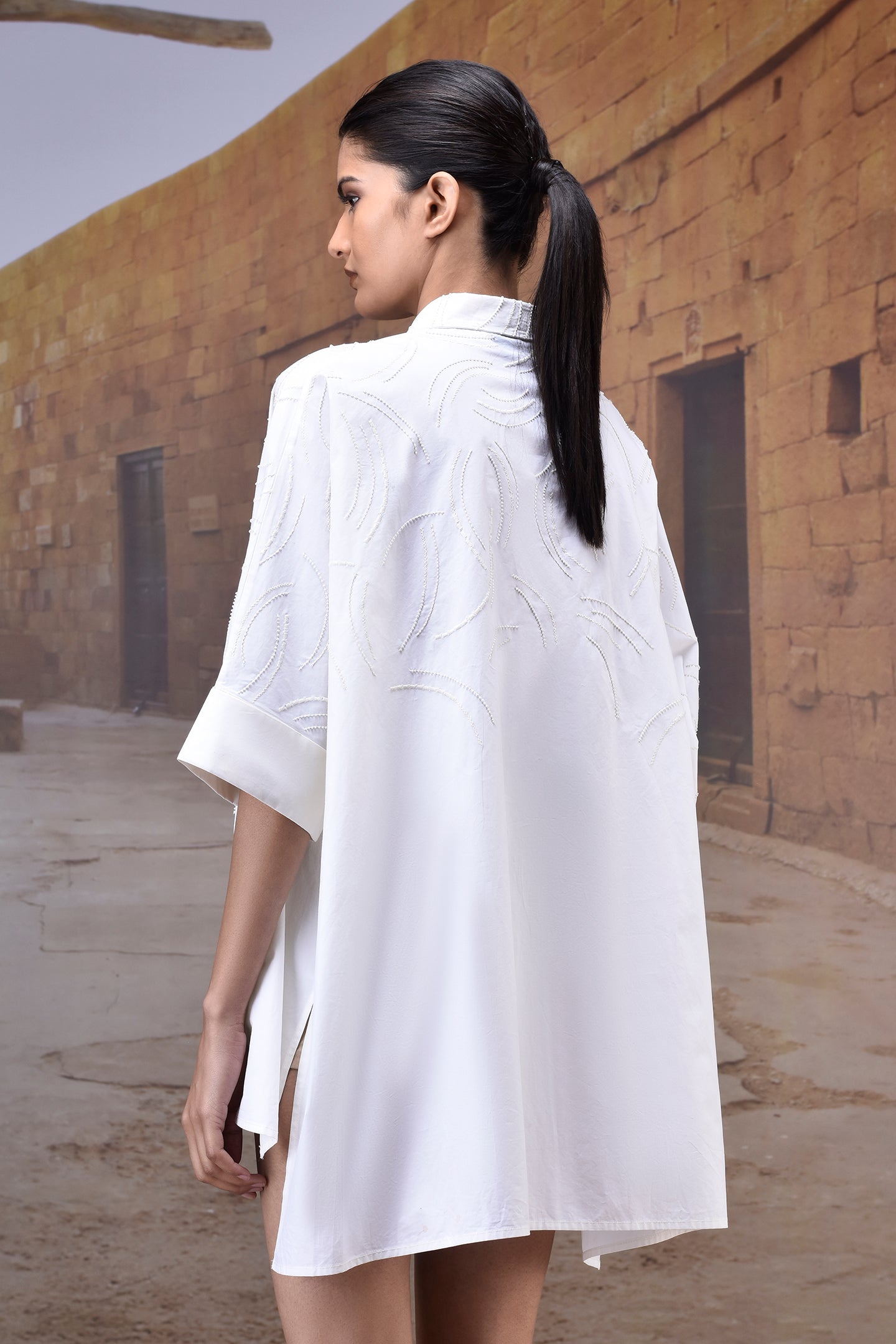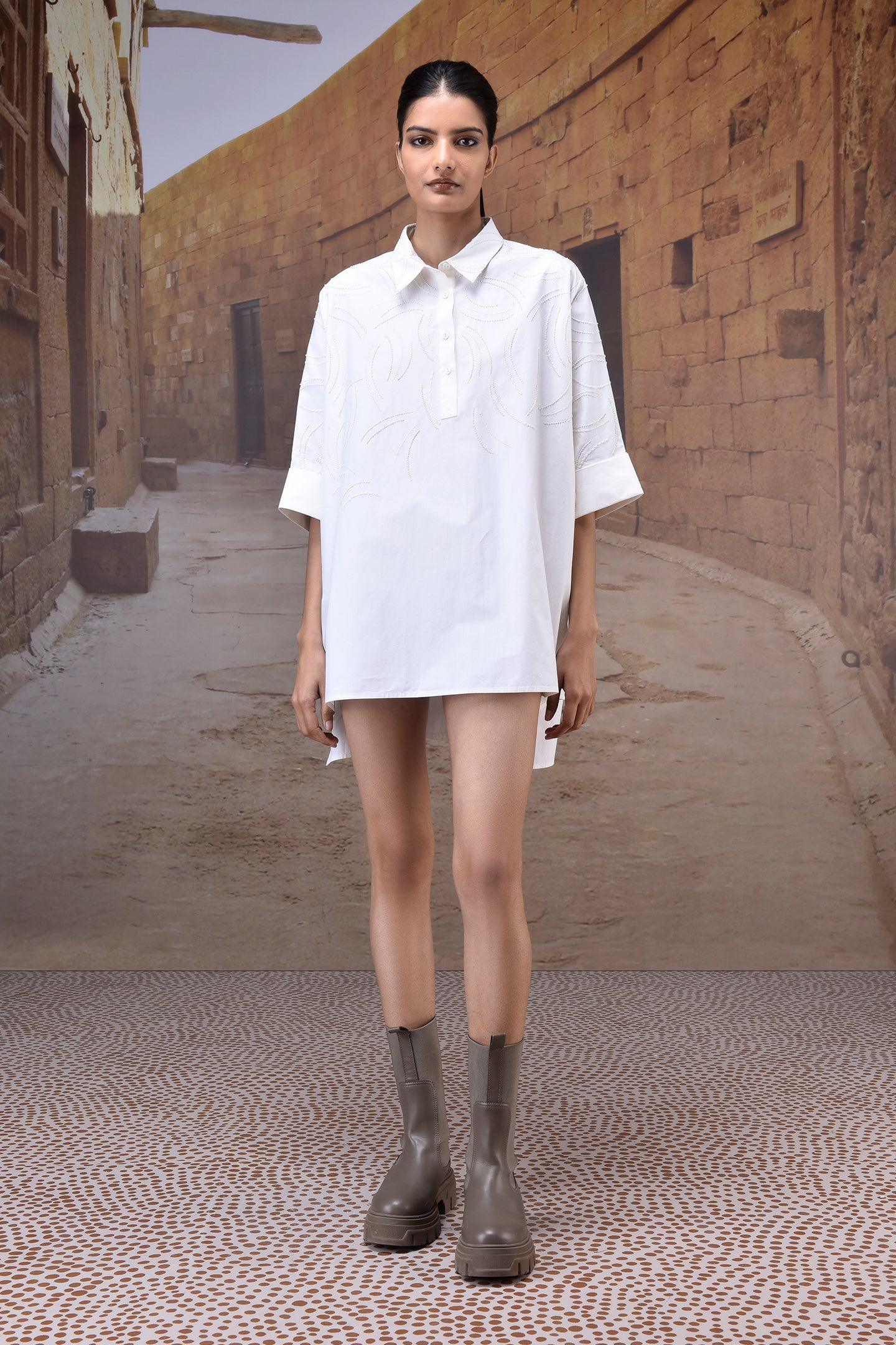 Cut in crisp ecru Giza cotton poplin, this oversized shirt is a modern wardrobe essential. The pointed collar and half button placket keep the front clean and minimal, while wide half sleeves add contemporary ease. Intricate tonal embroidery enhances the surface with subtle texture. Finished with a high-low hemline, it balances structure with fluidity for effortless styling.