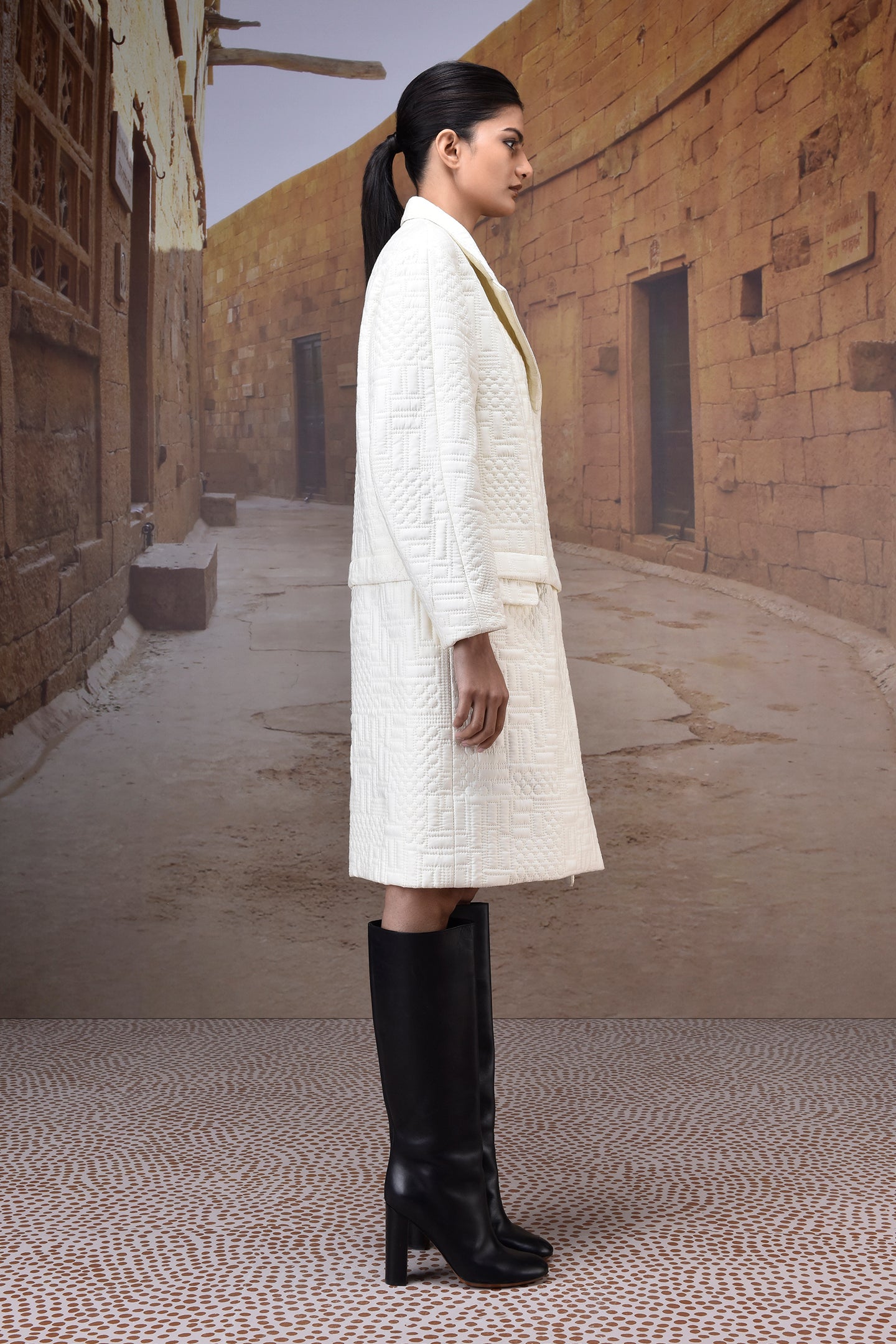 An elegant layering piece from Genes Lecoanet Hemant, this ecru overcoat is crafted in a silk-viscose blend with voile, offering a refined balance of structure and softness. The geometric quilted texture enhances its sculptural appeal, while the tailored lapel, belted waist, and flap pockets add timeless sophistication. A versatile design that moves seamlessly from day into evening.