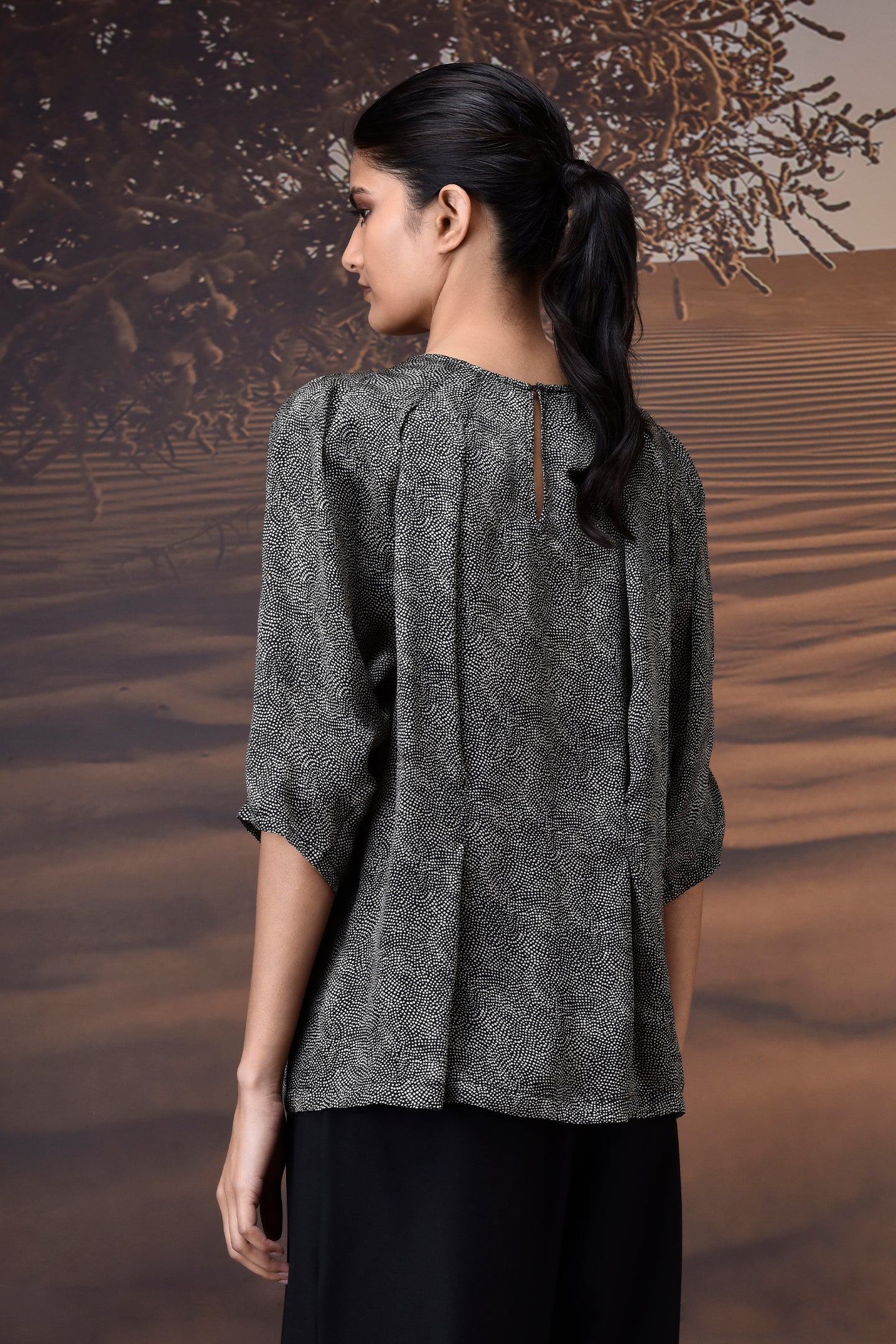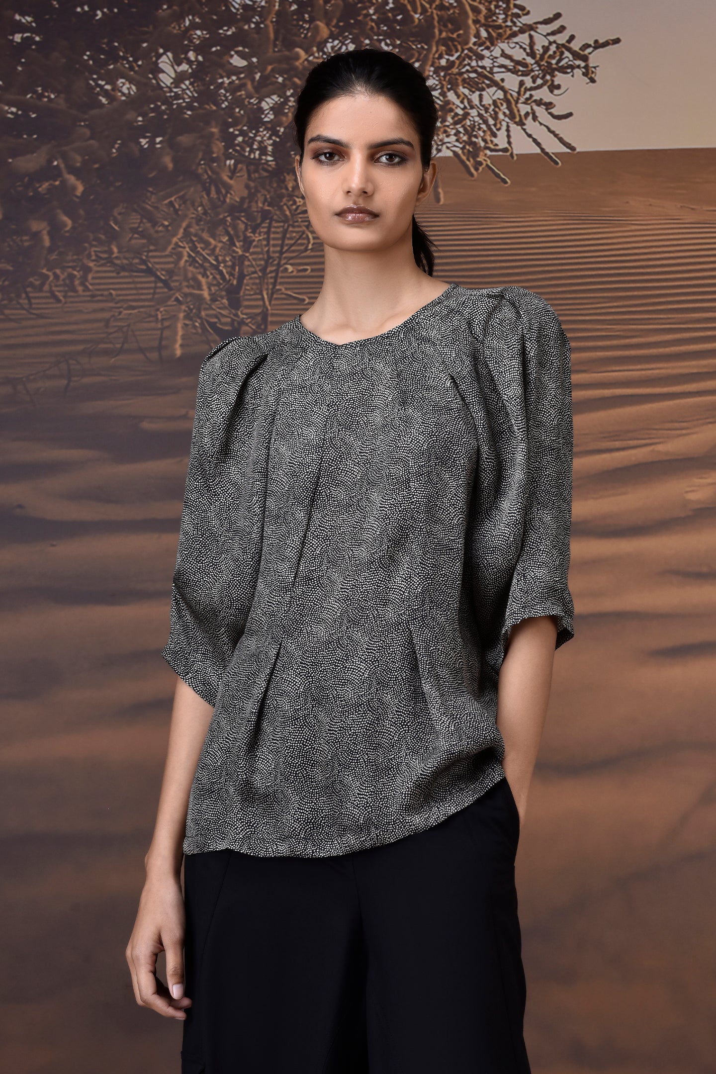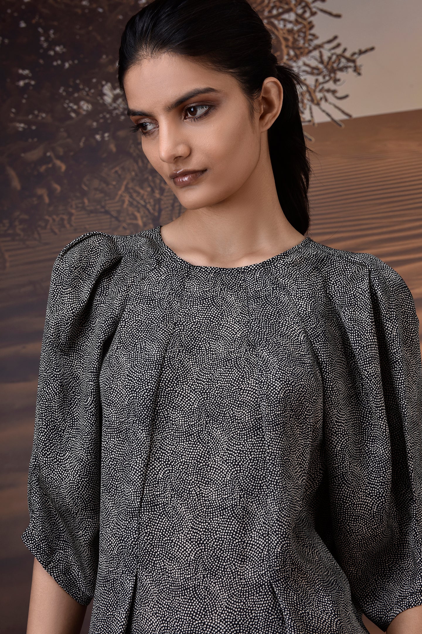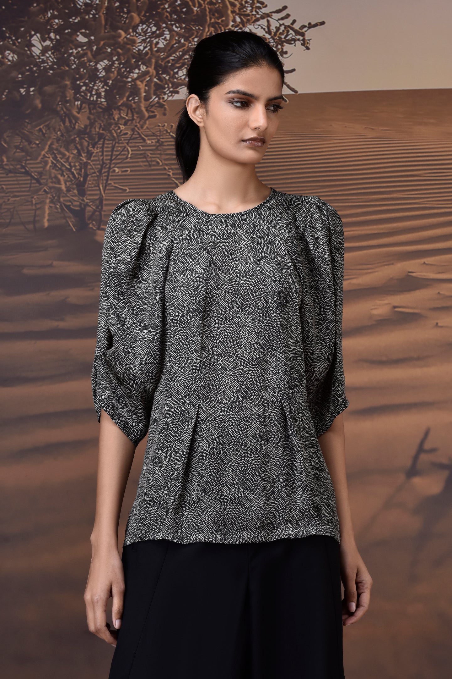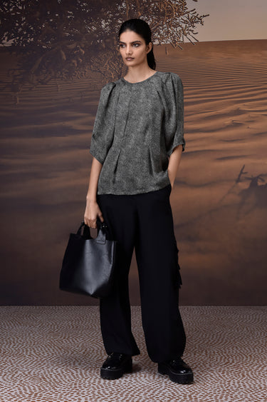 Striking a balance between subtle allure and refined detail, this gathered black top from Genes Lecoanet Hemant is rendered in smooth viscose satin, showcasing a soft micro-patterned texture and understated shine. Generously shaped sleeves and architectural pleating give definition to the relaxed silhouette, while maintaining effortless comfort. The monochrome palette anchors its adaptability, making this piece a go-to for polished day dressing or elevated evening looks.