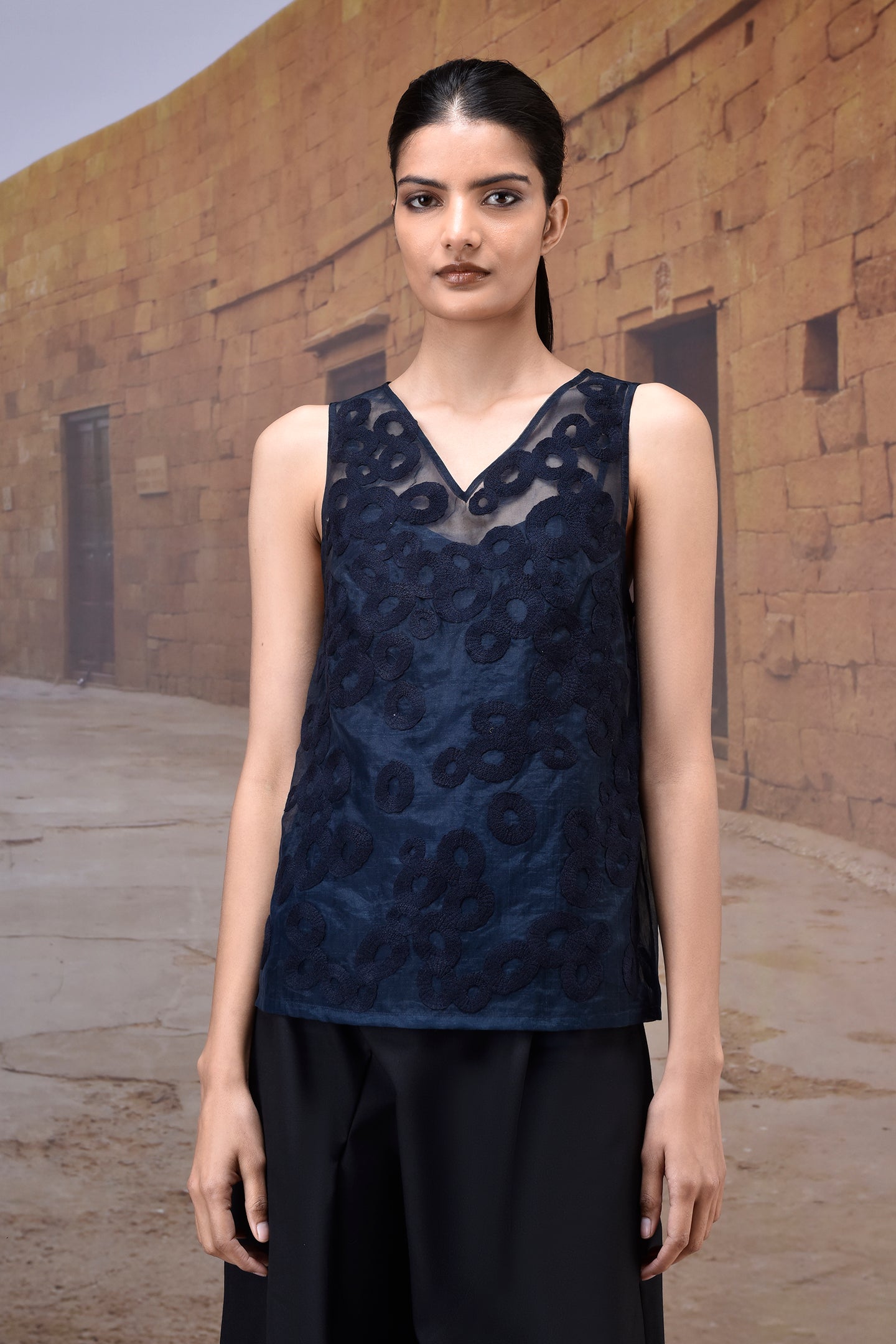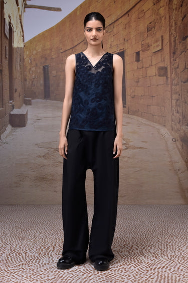 This layered navy top features a semi-sheer organza shell with tonal appliqué embroidery over a sleek satin base, blending structure with lightness. Designed with a clean V-neckline and sleeveless cut, it offers a modern, versatile profile. Finished with a hip-length hem and keyhole back fastening, it transitions effortlessly from workday polish to evening elegance.