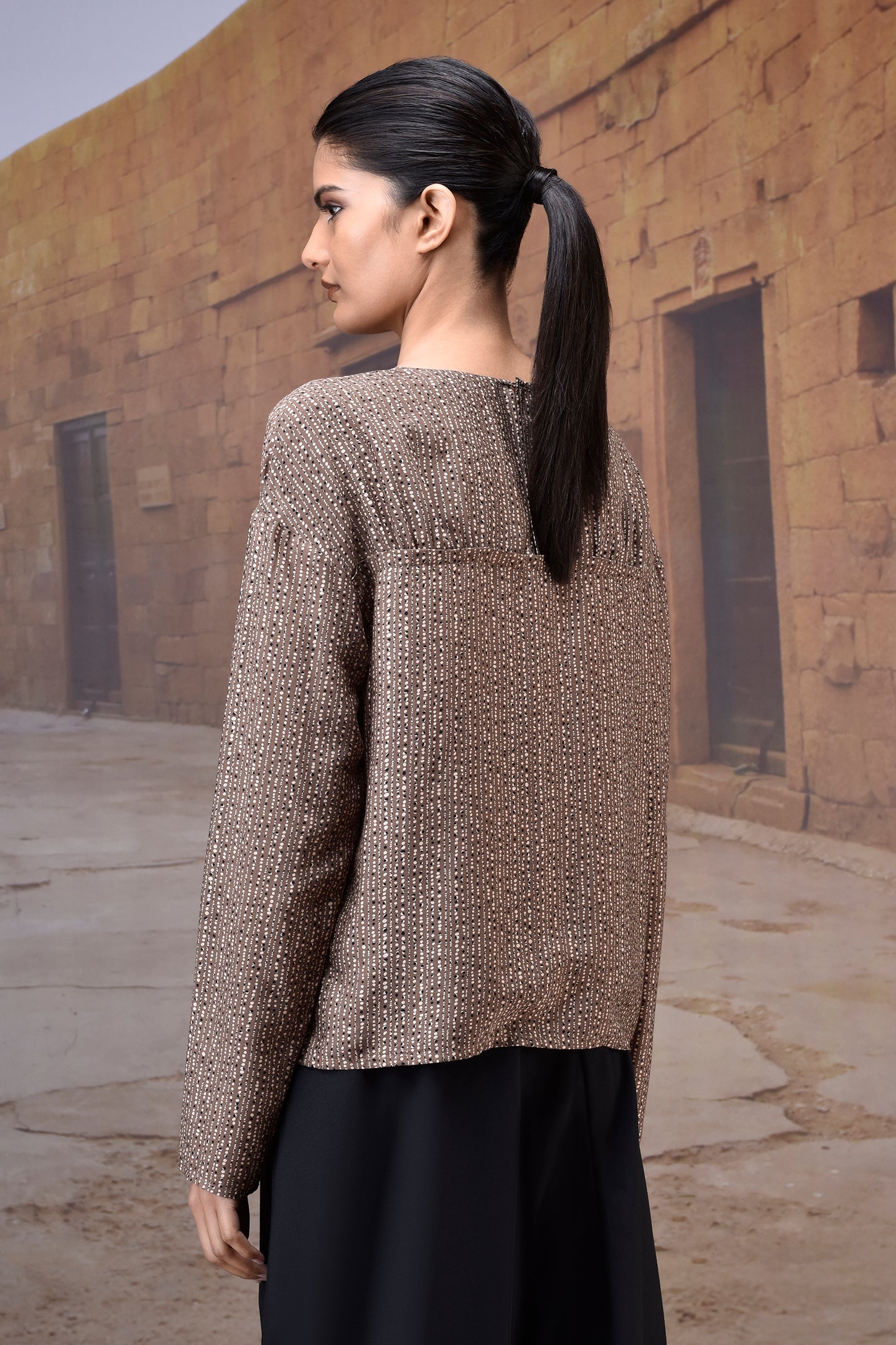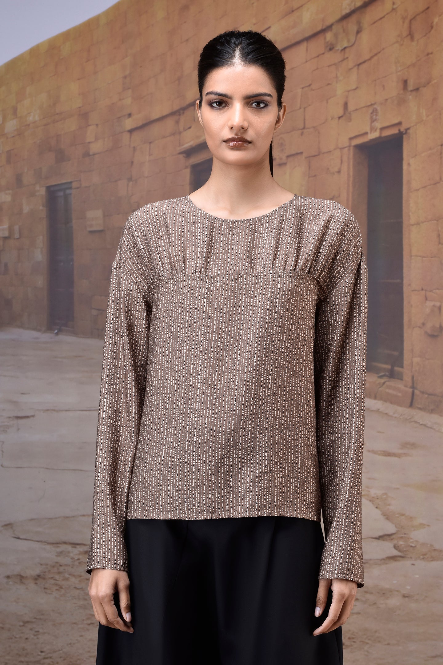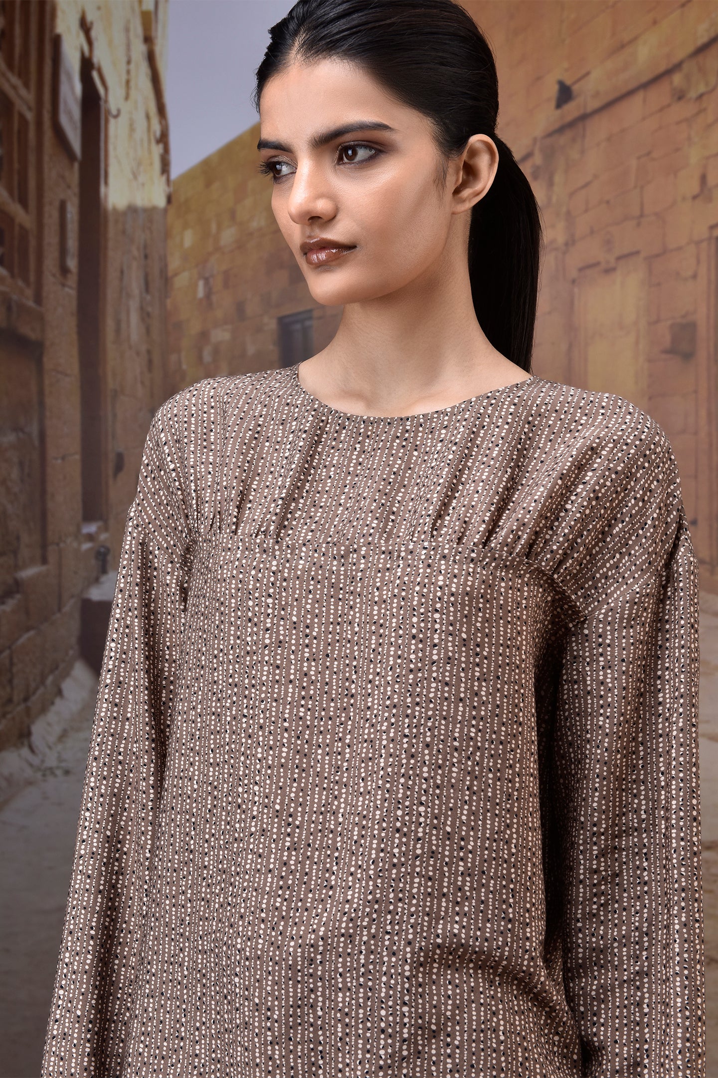 Ease meets quiet polish in this Warm Beige top from Genes Lecoanet Hemant, crafted in a supple silk–viscose blend that falls with a soft, liquid drape. A lightly textured micro-dot stripe lends depth, while gentle gathers along the yoke create movement through the body. The straight, relaxed cut balances long sleeves and a clean round neckline, offering a refined layer that transitions effortlessly from desk to dinner.