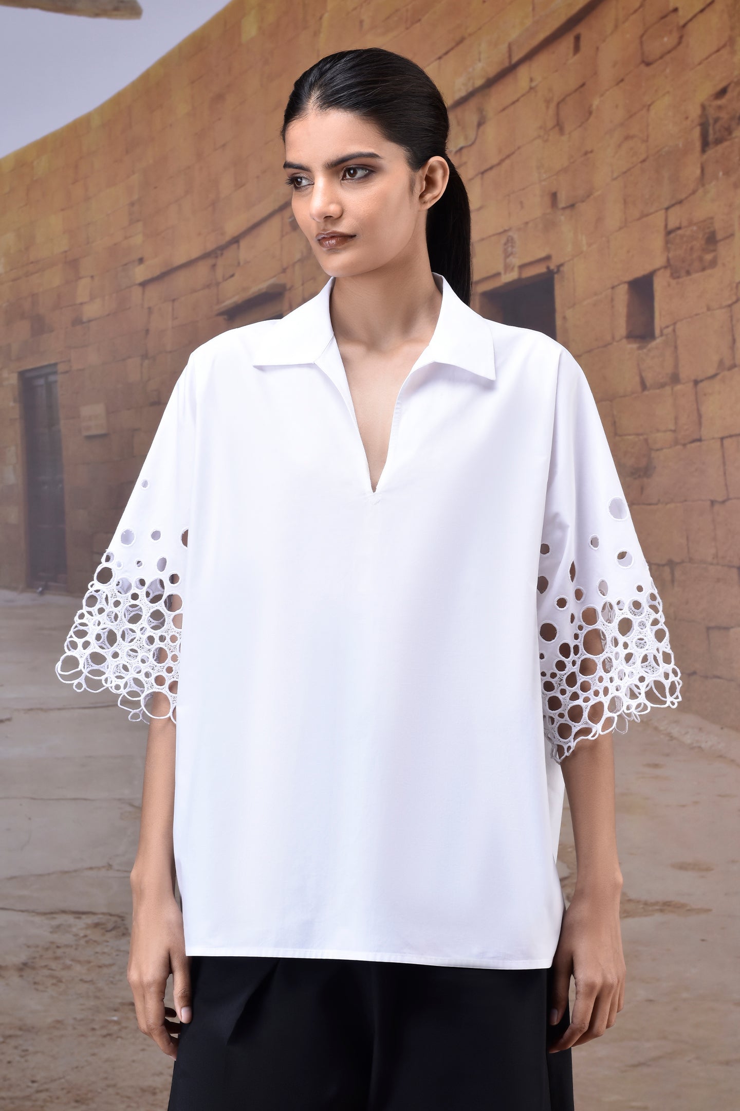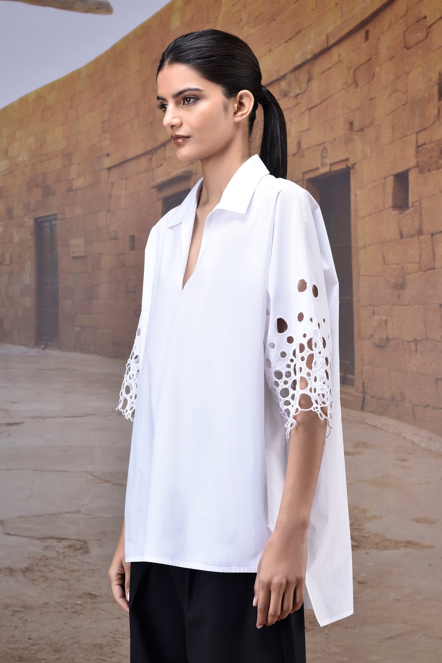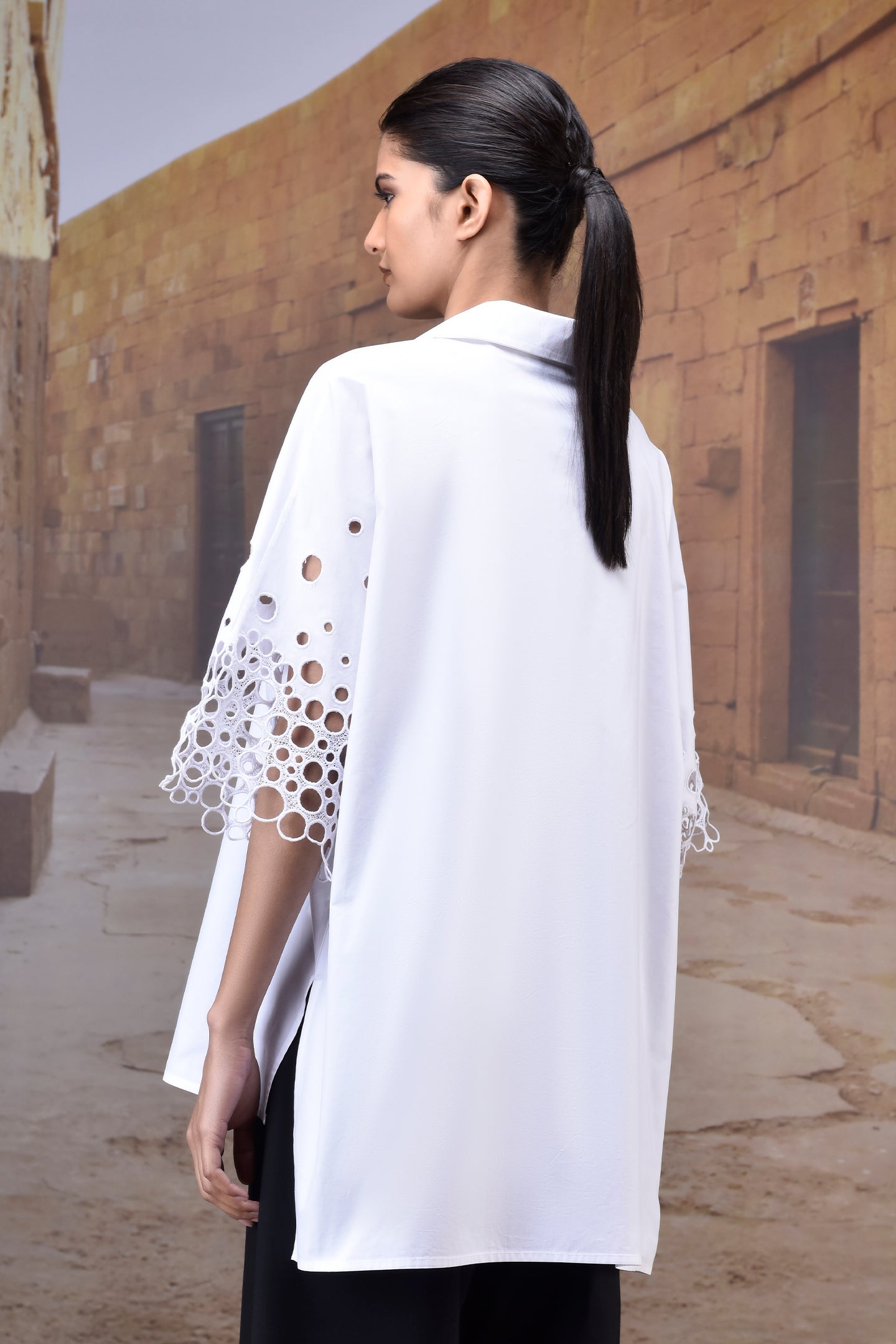 White Poplin Shirt with Embroidered Cut-Out Sleeves