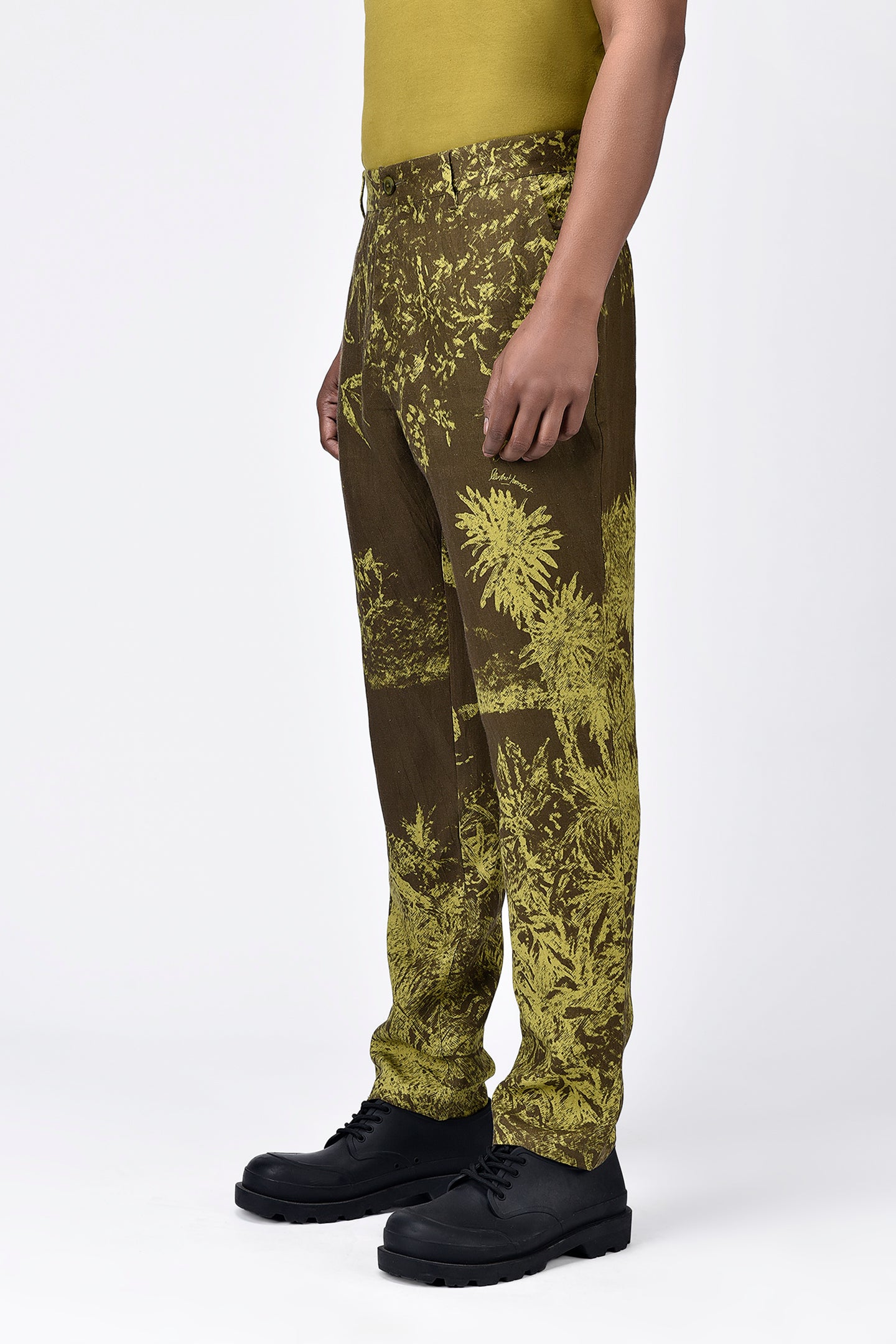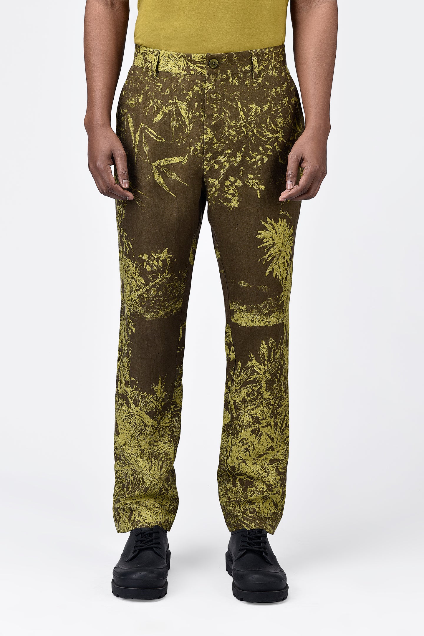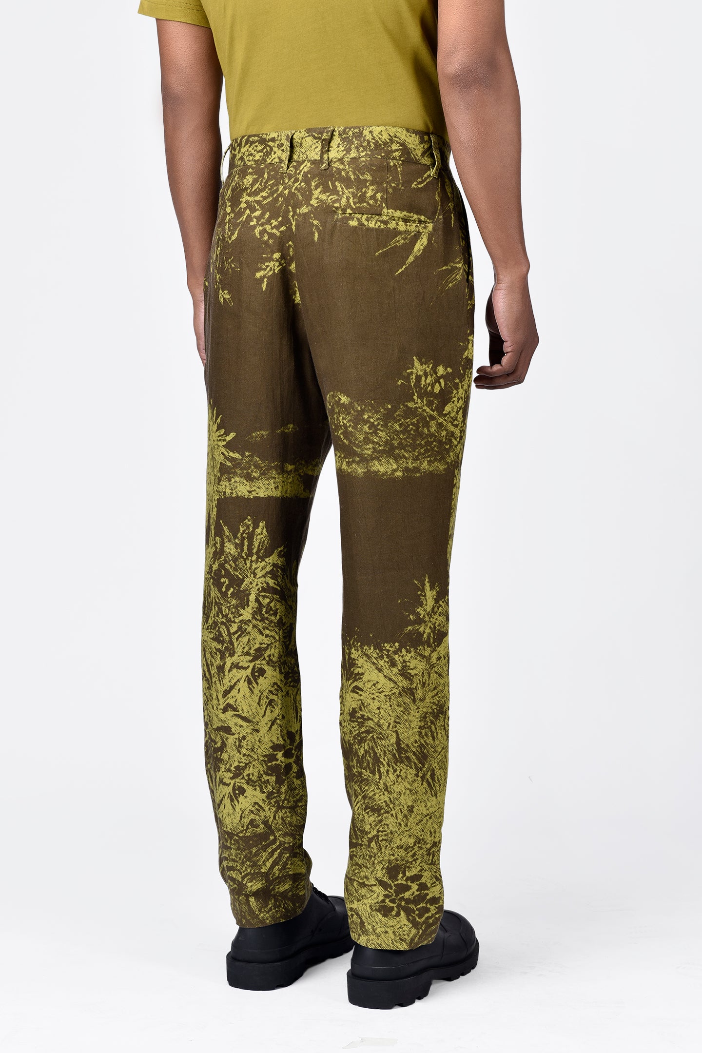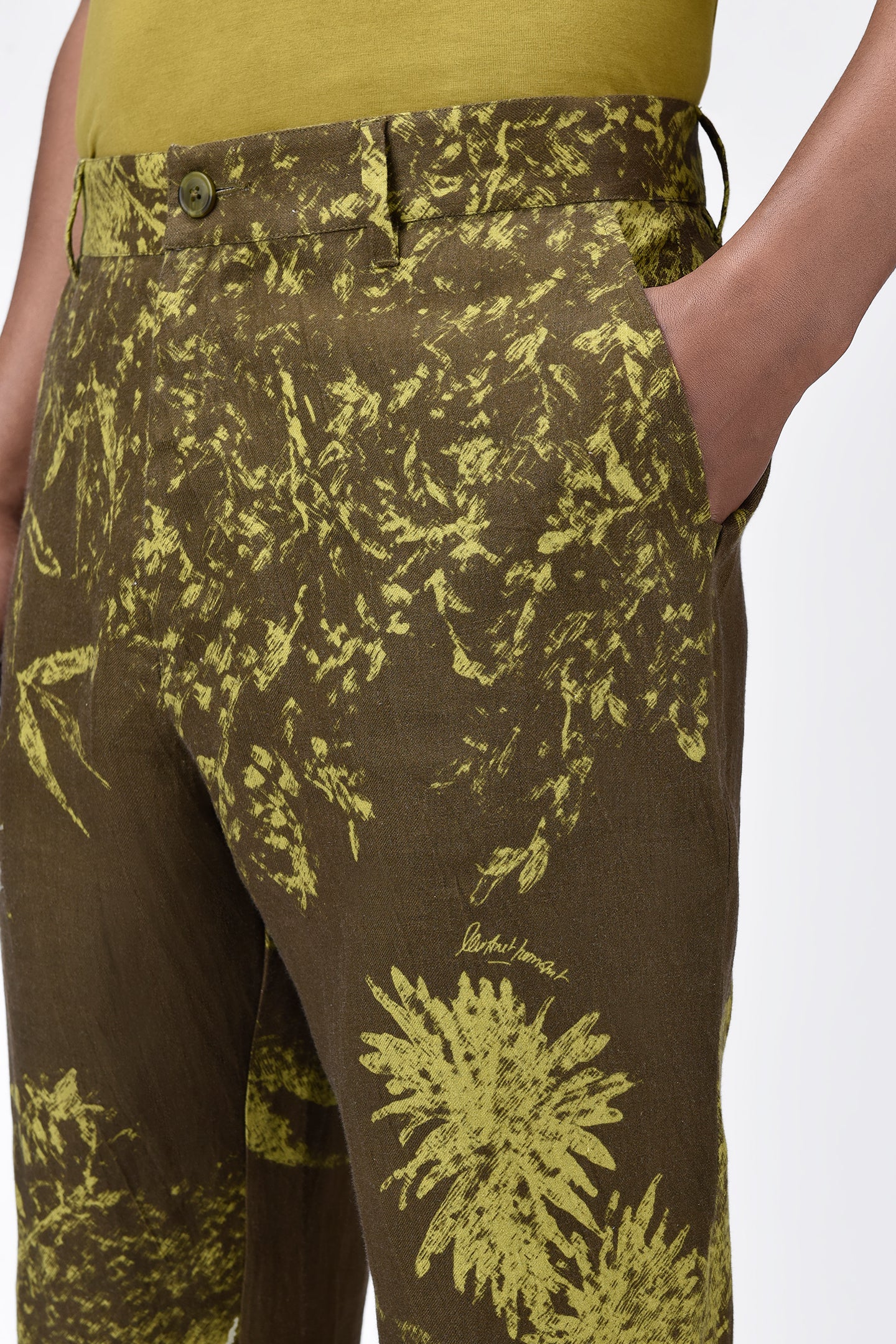Embrace comfort and style with our khaki linen herringbone trousers, tailored for a regular fit. Featuring unique landscape print placements and a distinctive bone pocket, these trousers blend classic sophistication with a touch of nature-inspired elegance.