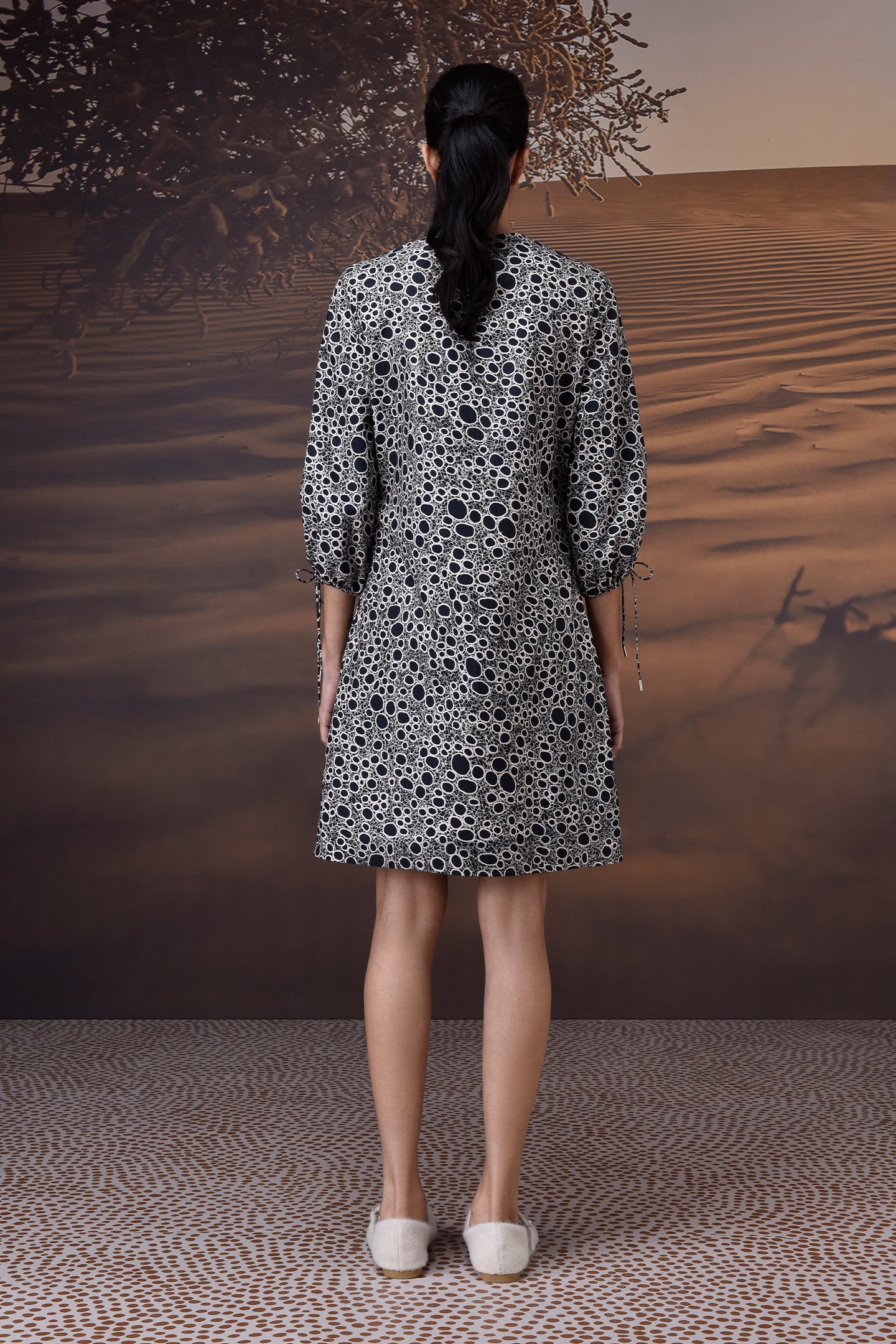 Crafted in luxurious Giza Cotton Poplin, this black dress blends structured elegance with easy wearability. Its distinctive all-over abstract dot print introduces an element of quiet boldness, while the soft gathers at the waist and sleeve ties offer refined detail without overstatement.