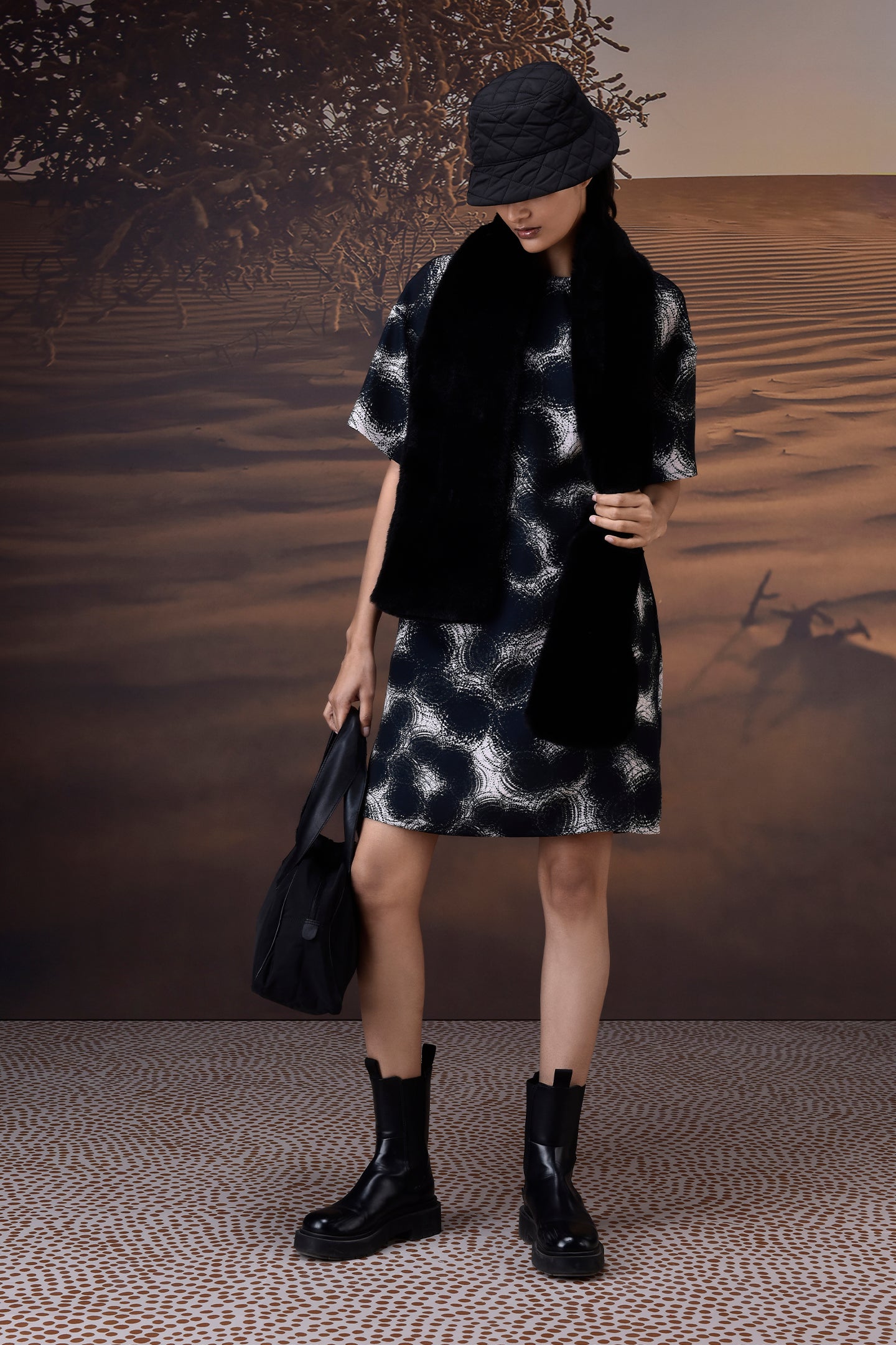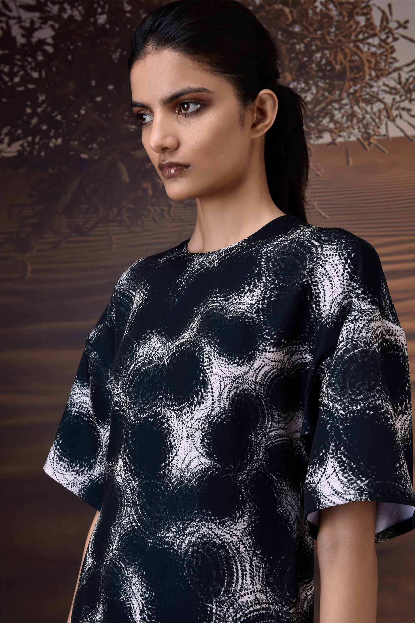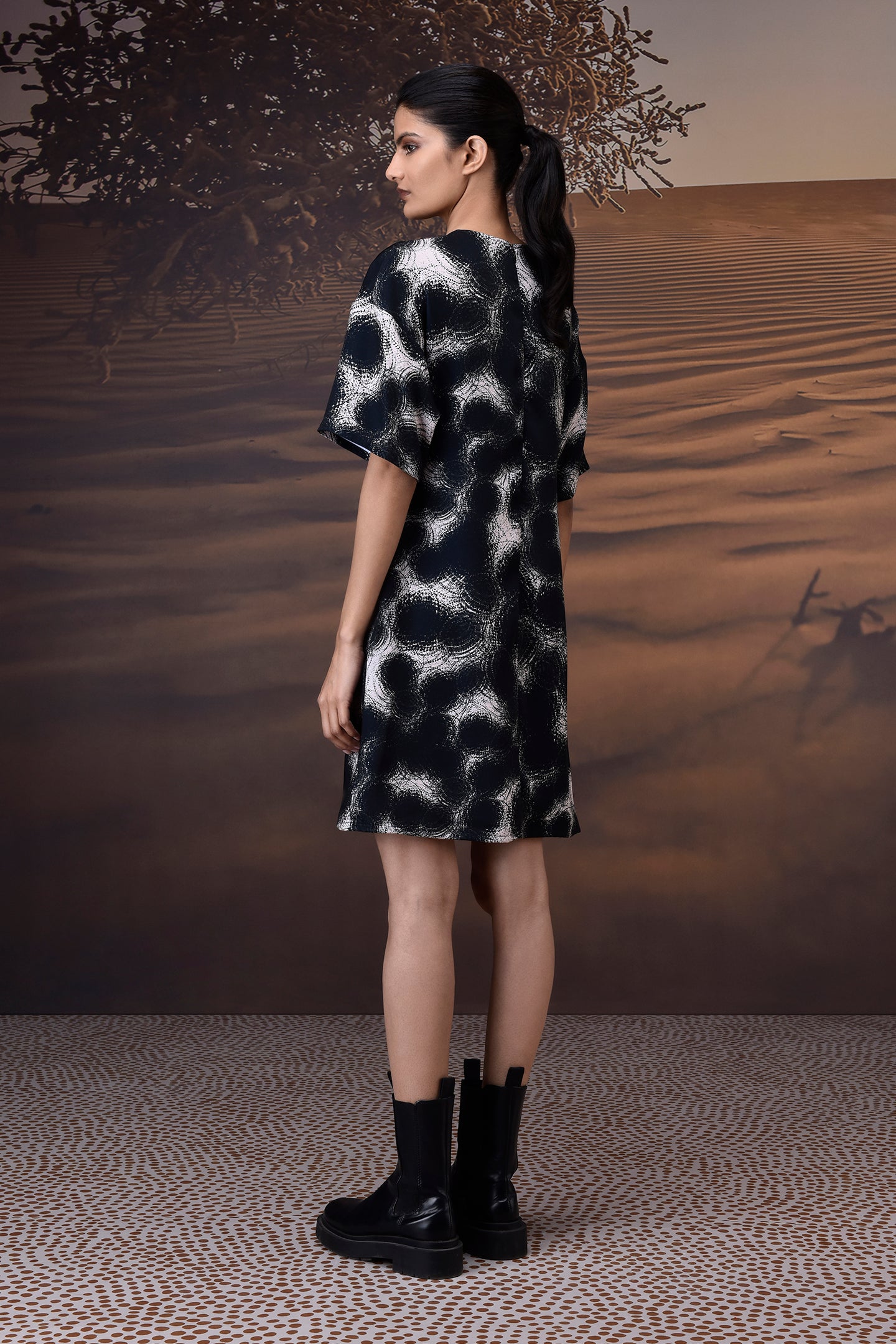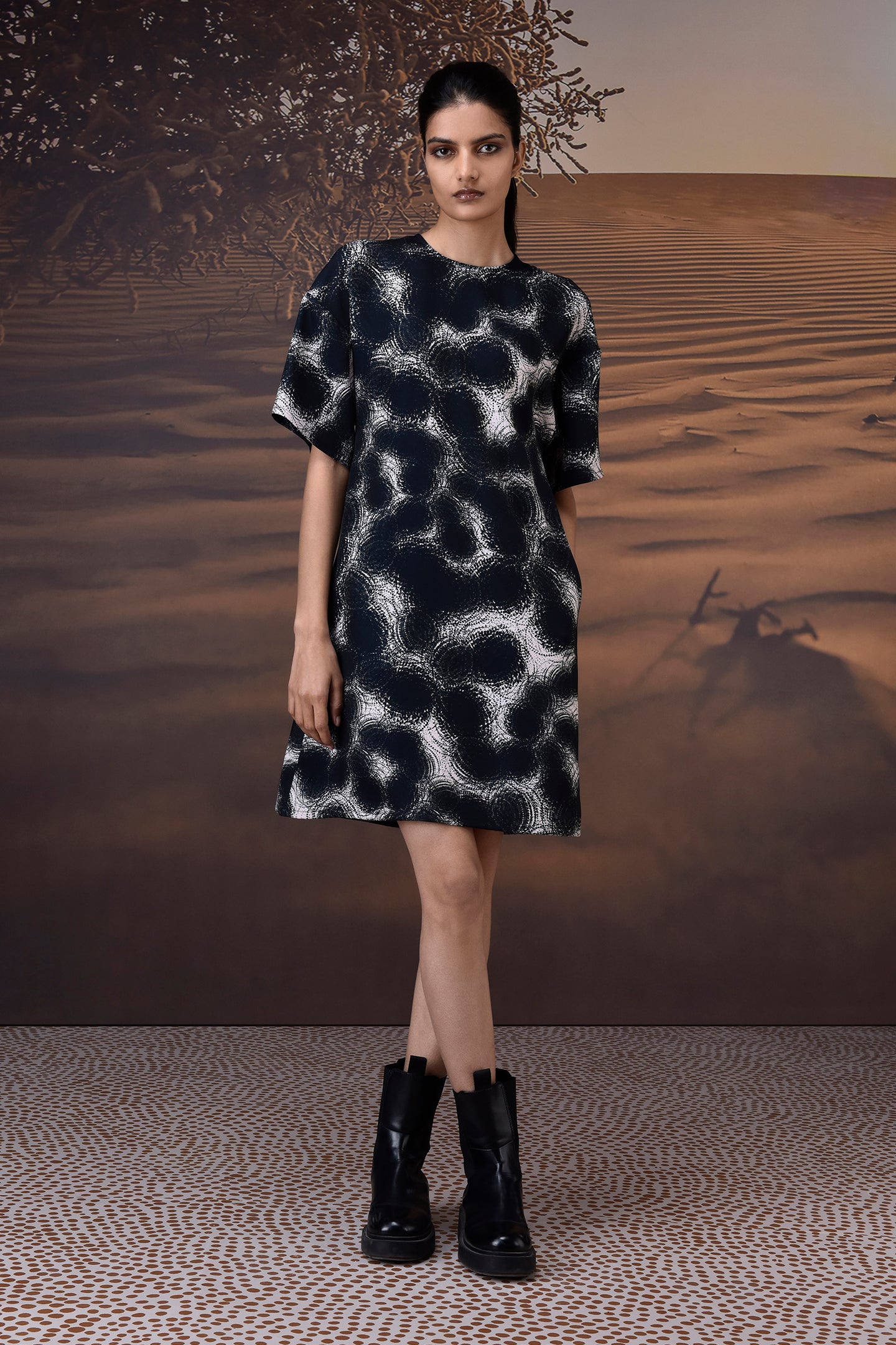 Crafted in fluid twill crepe, this dress features an abstract ripple print in deep midnight tones, creating a striking visual texture. The straight silhouette is complemented by a round neckline and relaxed short sleeves, offering effortless comfort with refined style. Its mid-thigh length makes it versatile for both casual and elevated occasions.