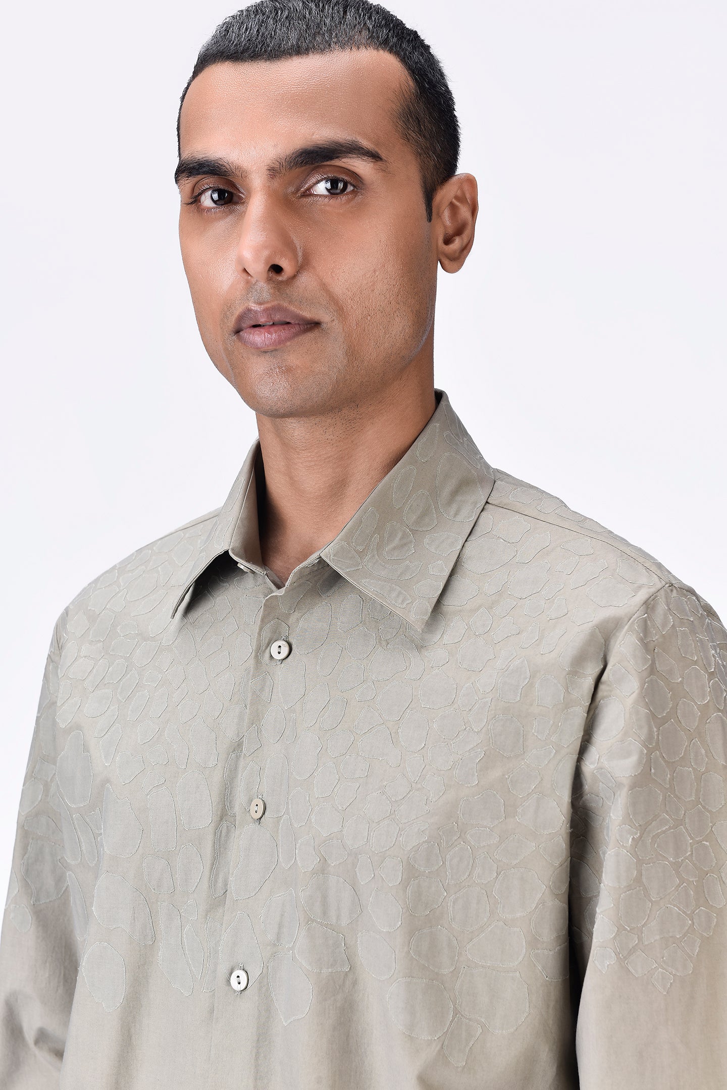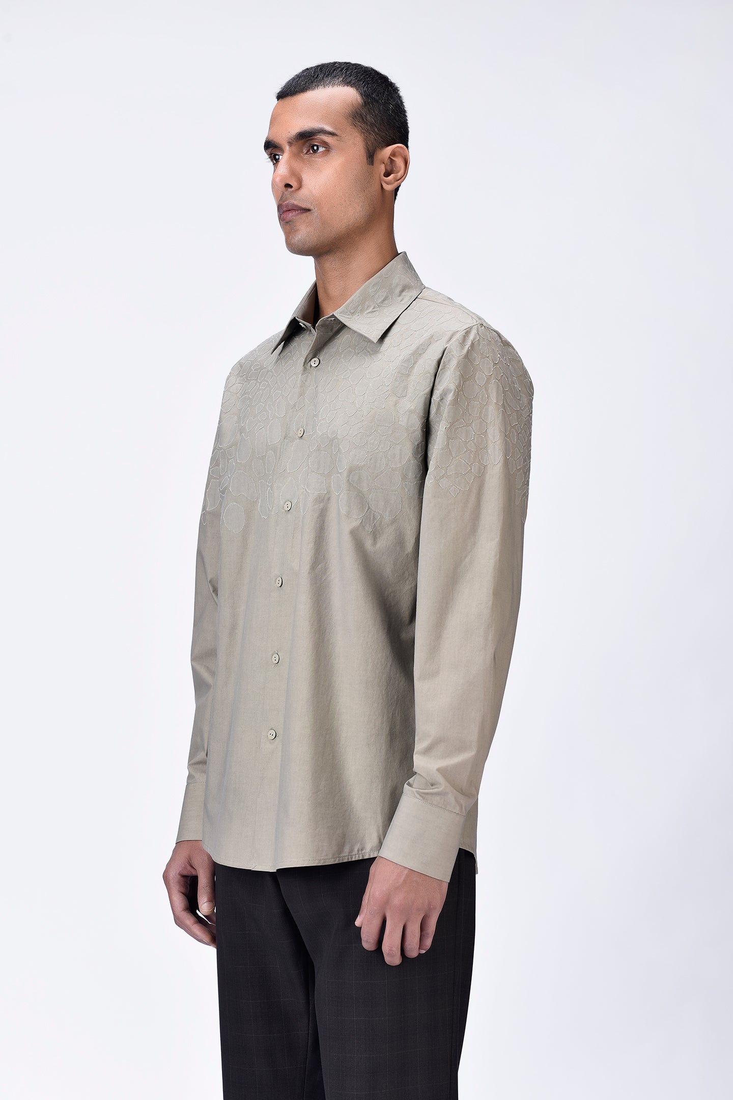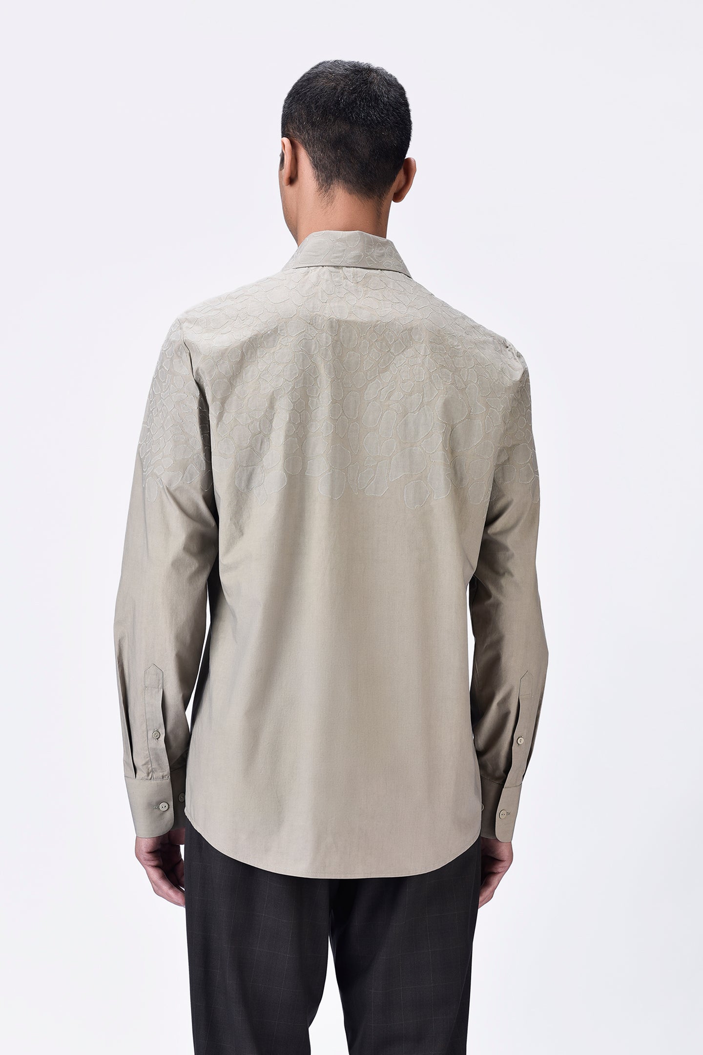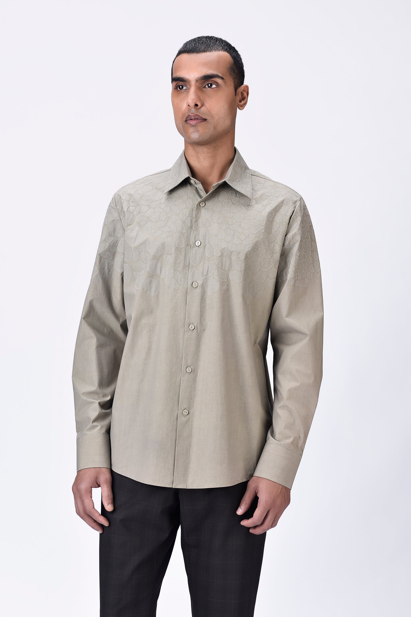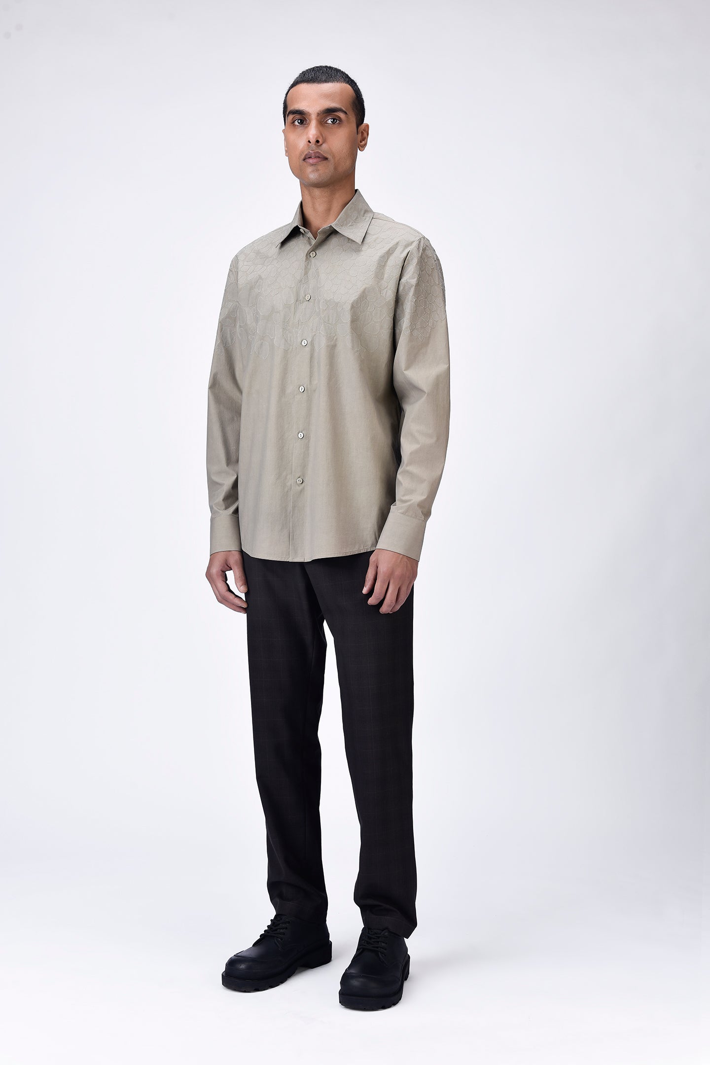 Giza Cotton Poplin Regular Fit Button-Up Shirt with Micro Cell Embroidery - Taupe