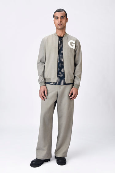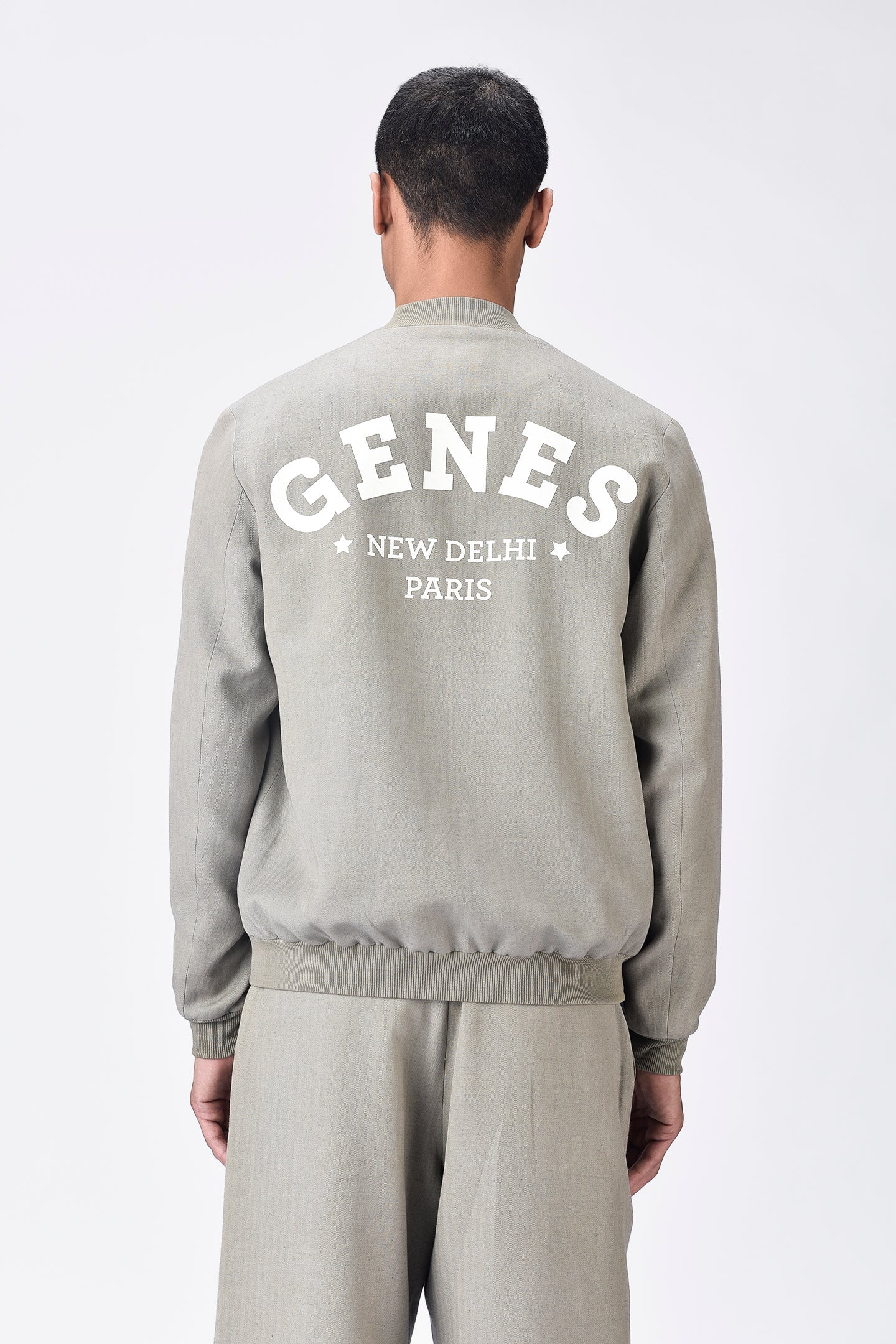 Featuring Genes' bomber jacket in taupe linen with a Genes text print. Modern and distinctive with a stylish design.