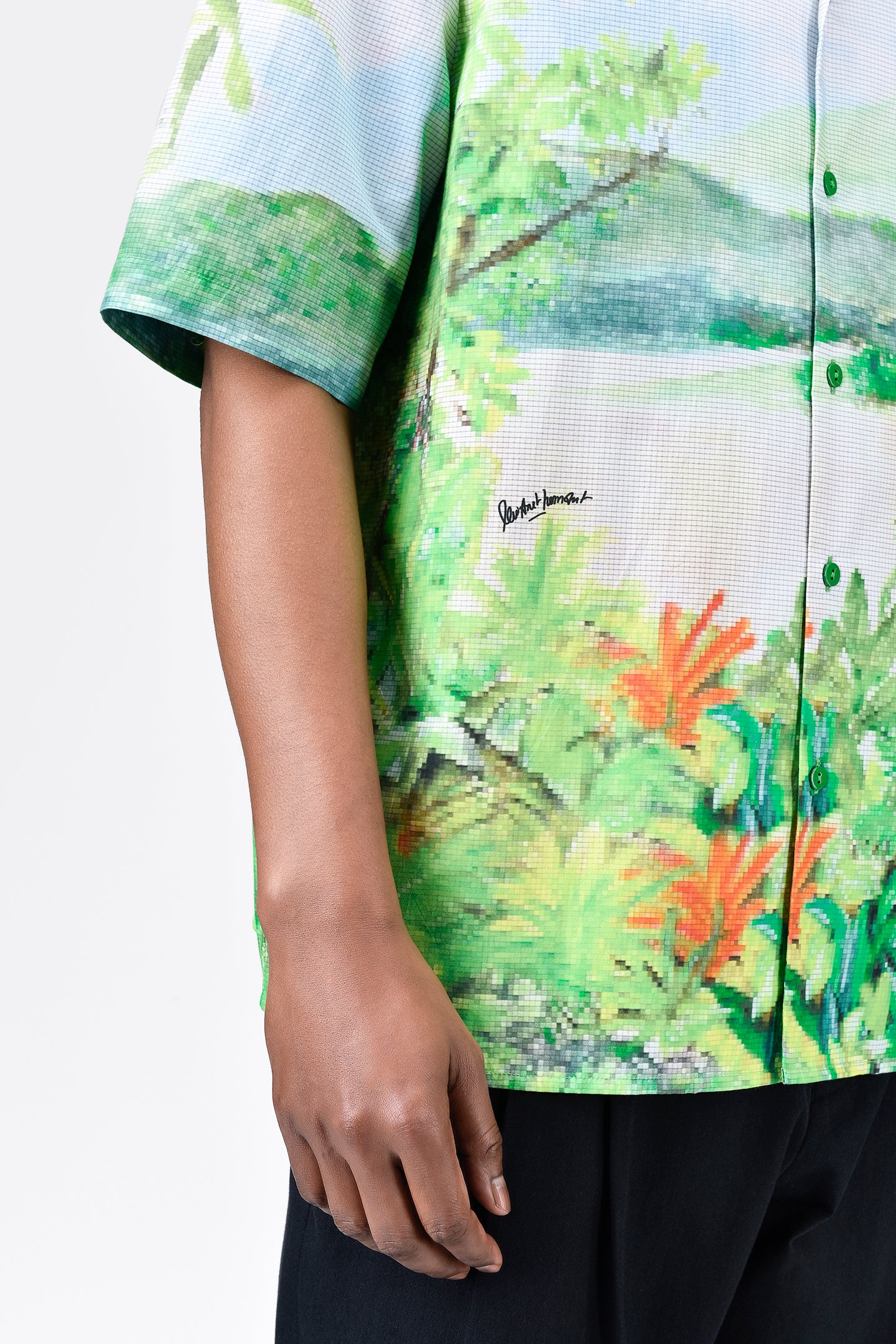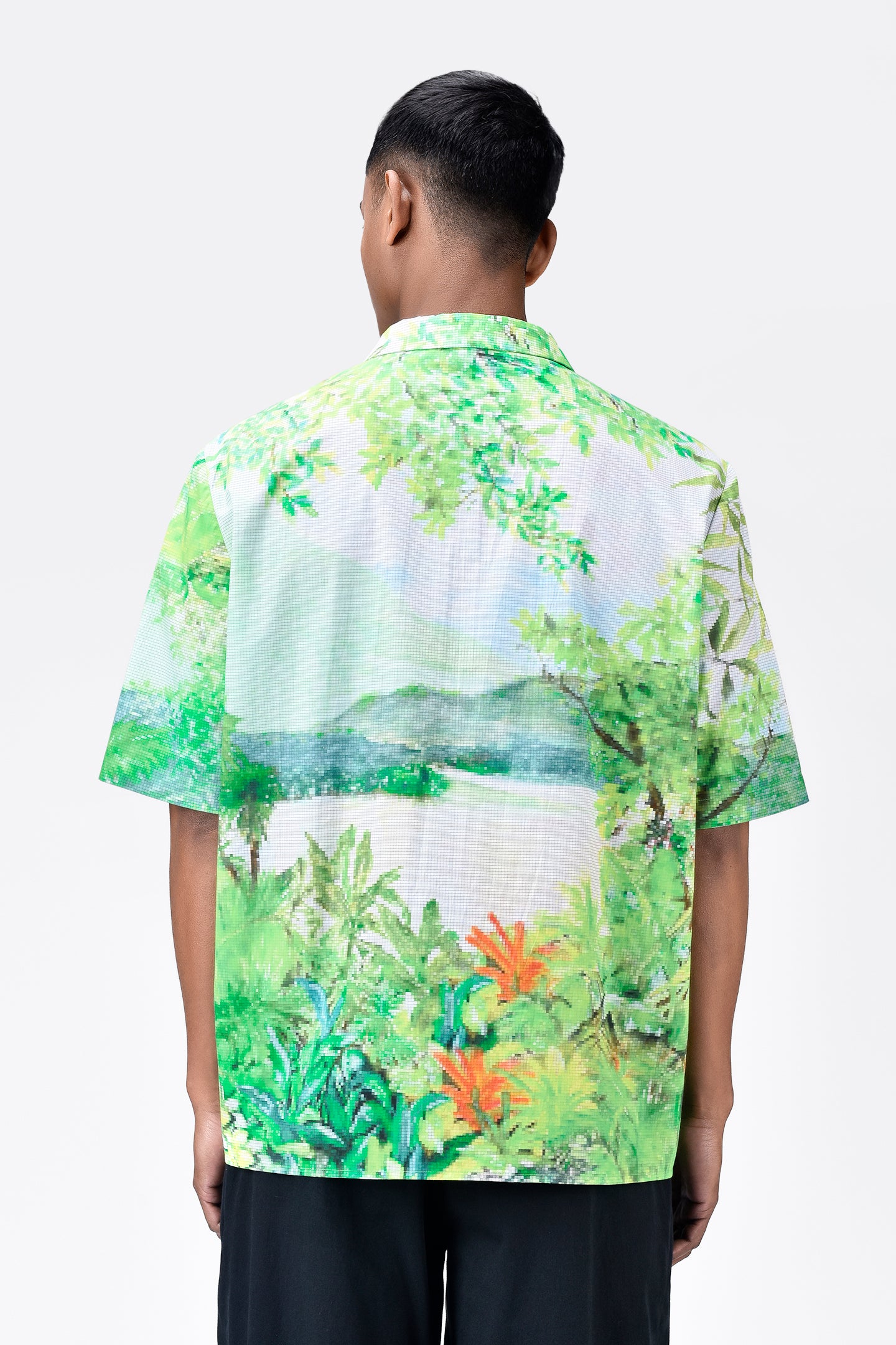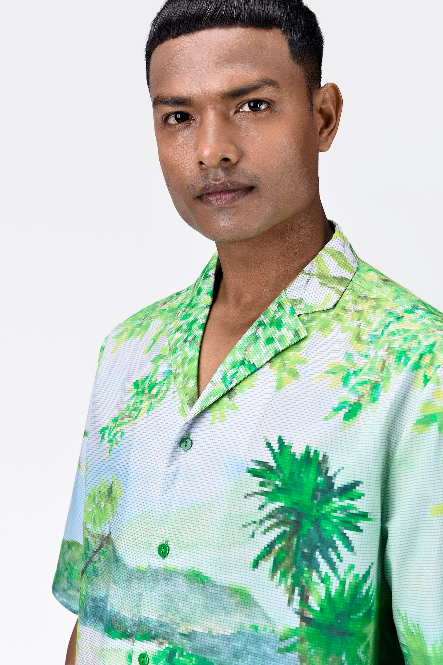 Dive into comfort and style with our Easy Fit Men's Shirt, featuring a unique Cuban/Sailor collar. Made from soft, breathable green cotton poplin, this half-sleeve shirt boasts a striking pixelated landscape print.