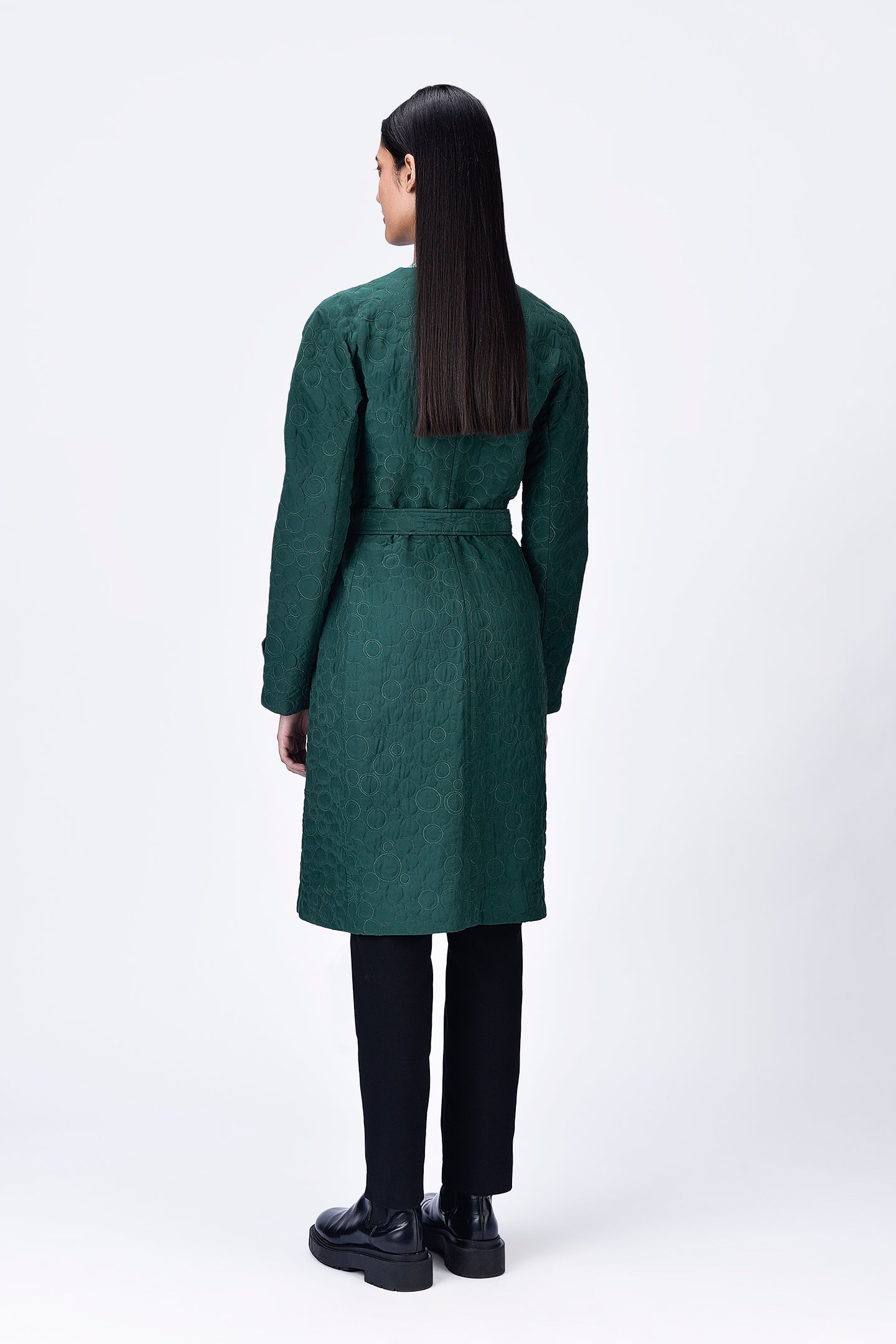 A semi-fitted trench coat in silk and cotton voile, featuring a tie-up waist belt and all-over micro cell quilting for a sleek and textured look.