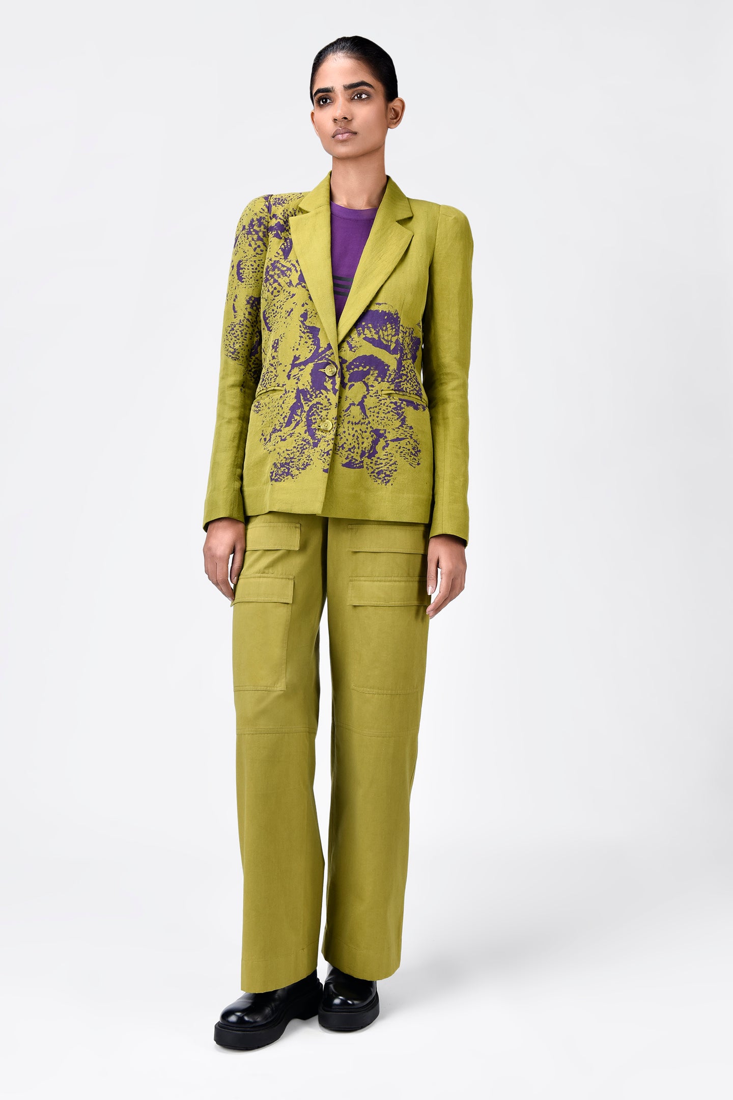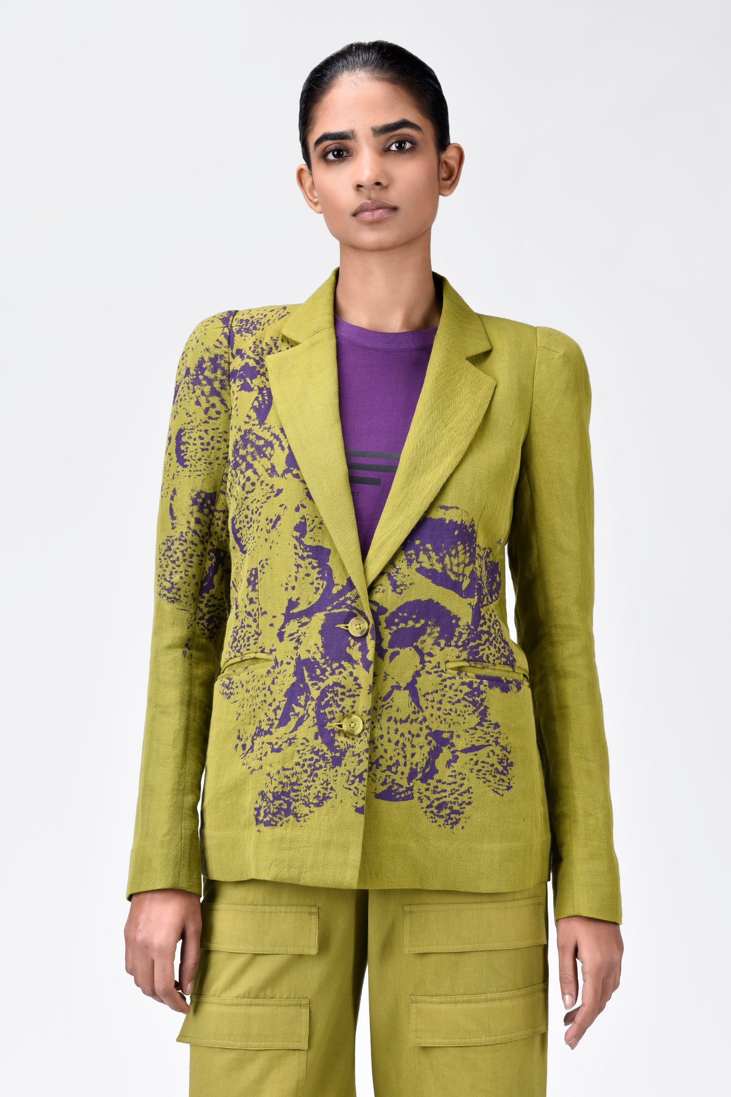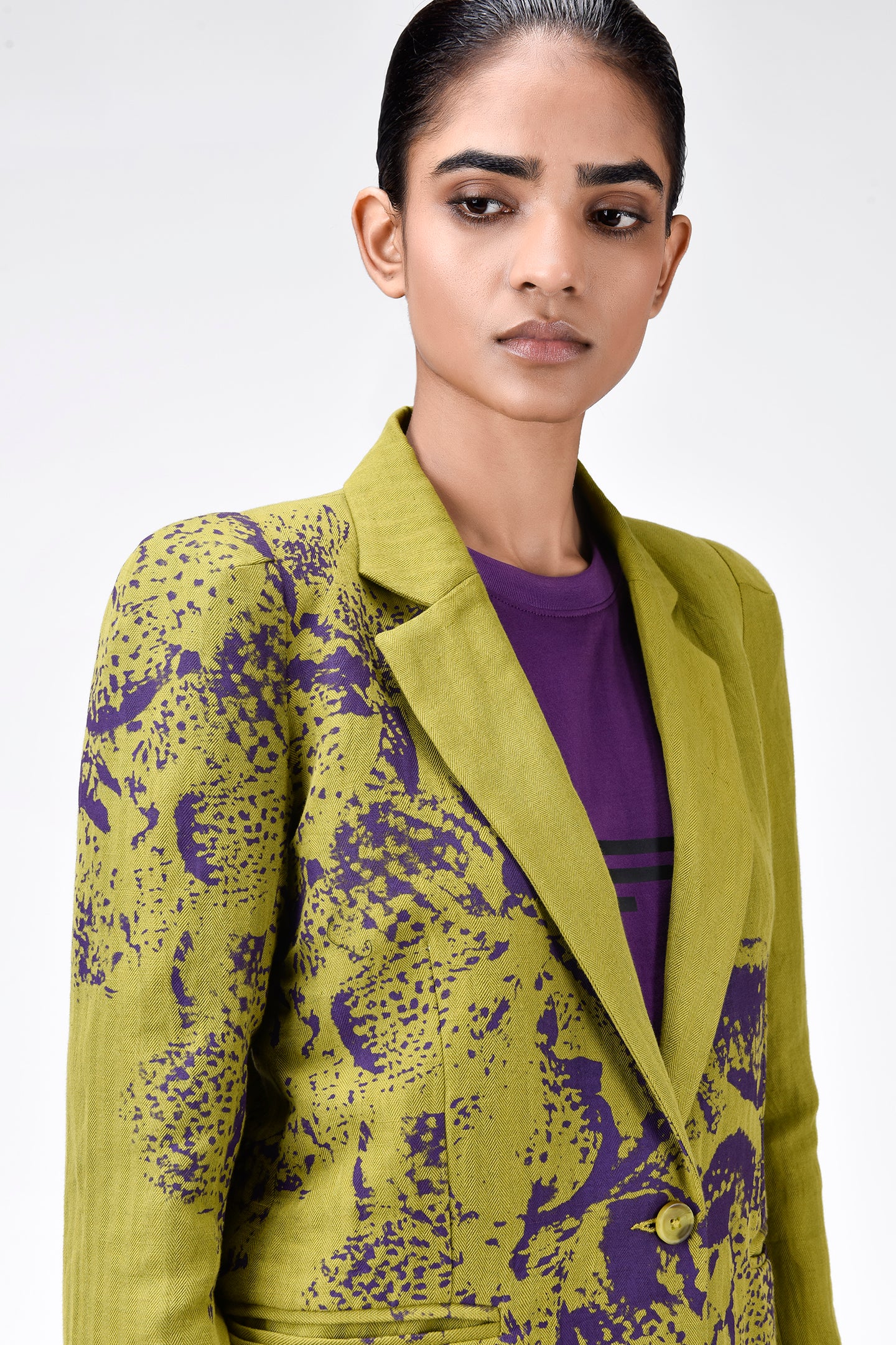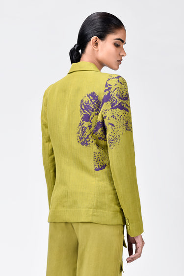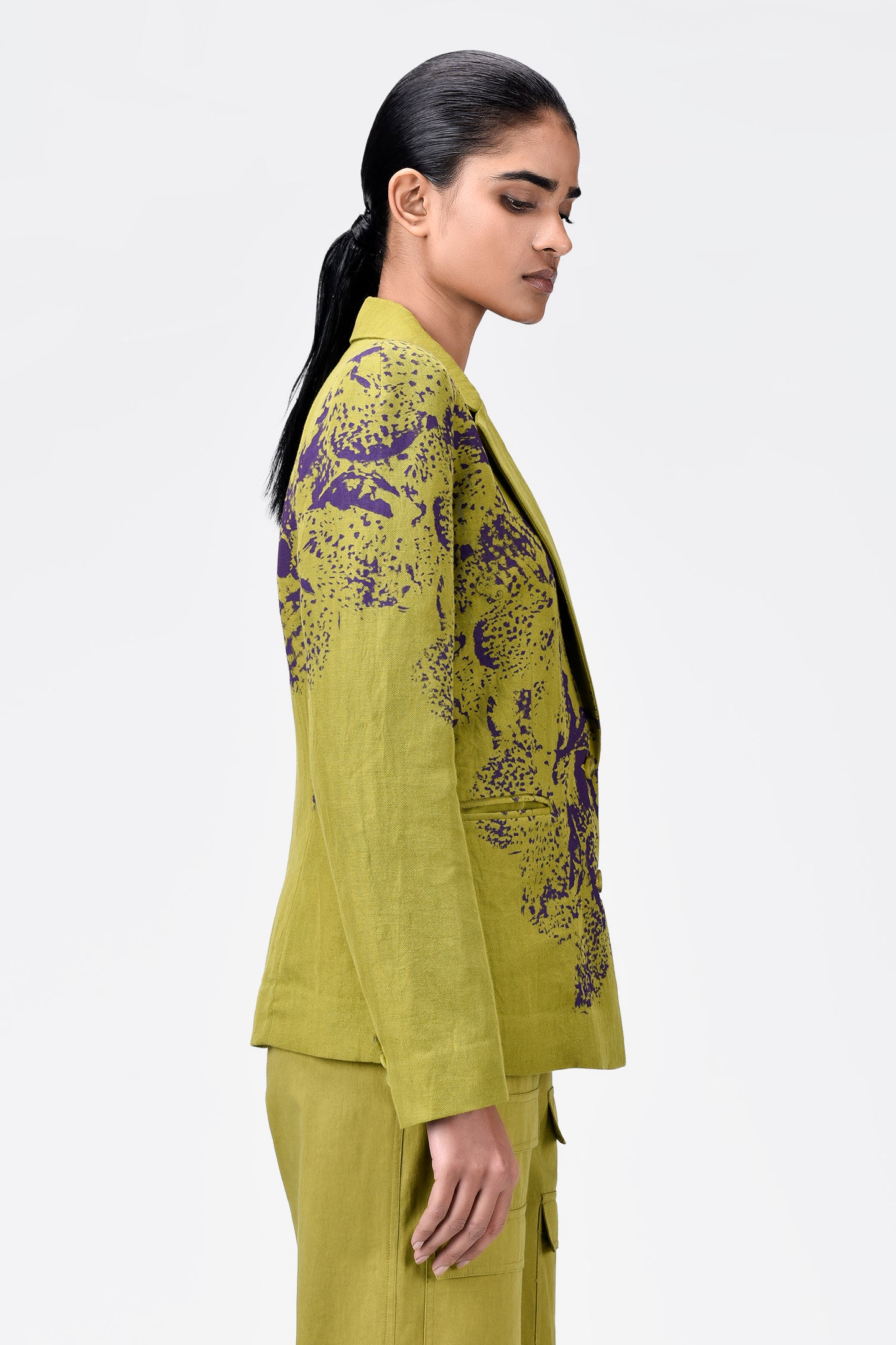 Slim Fit Linen Herringbone Jacket with Orchid Print Bright Olive