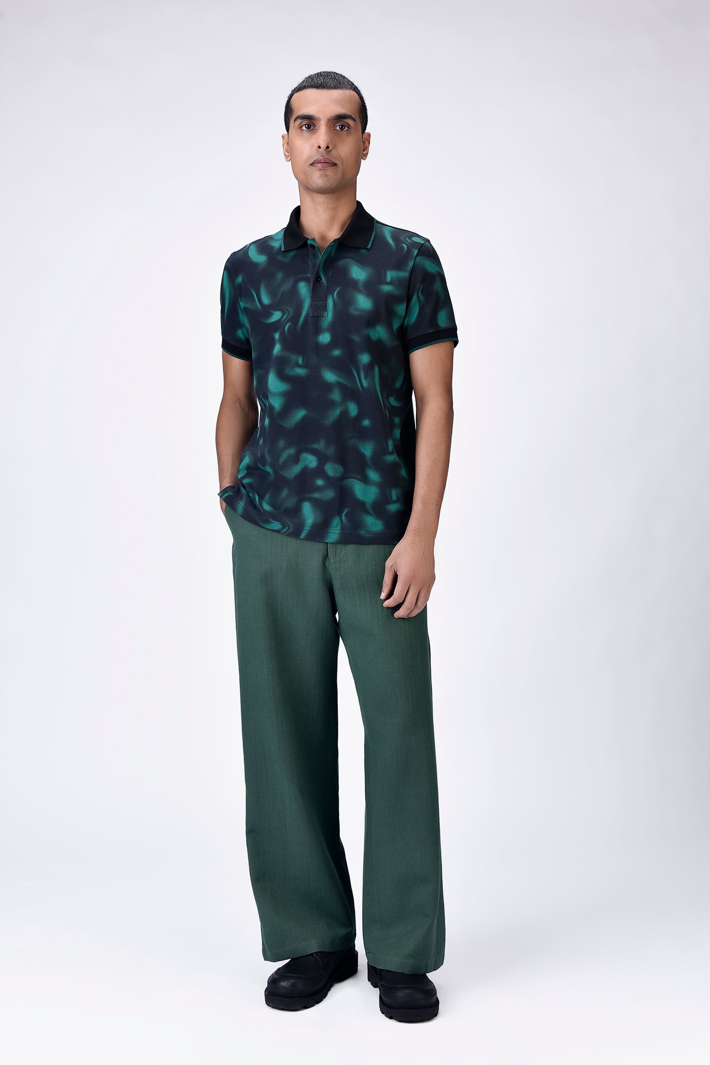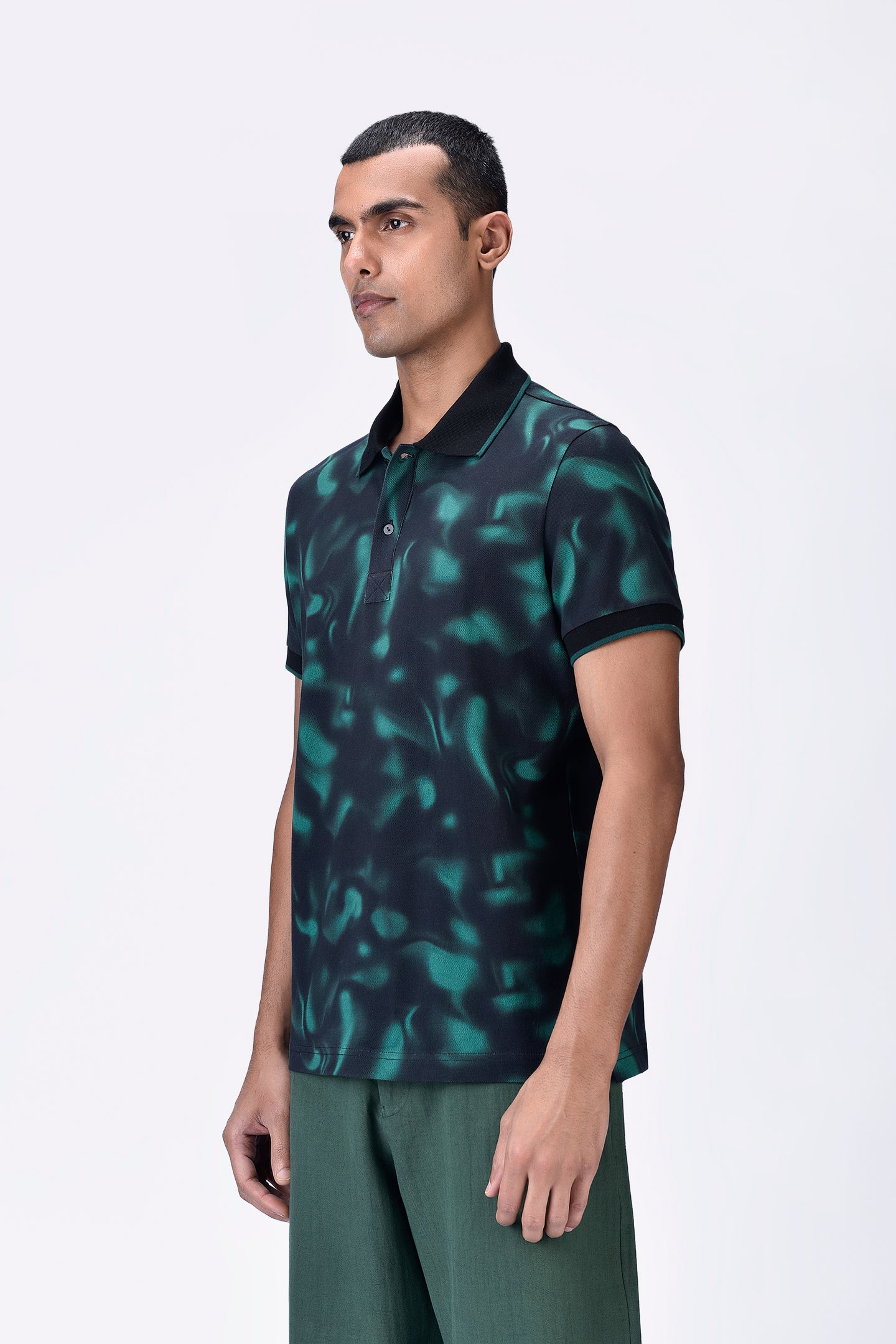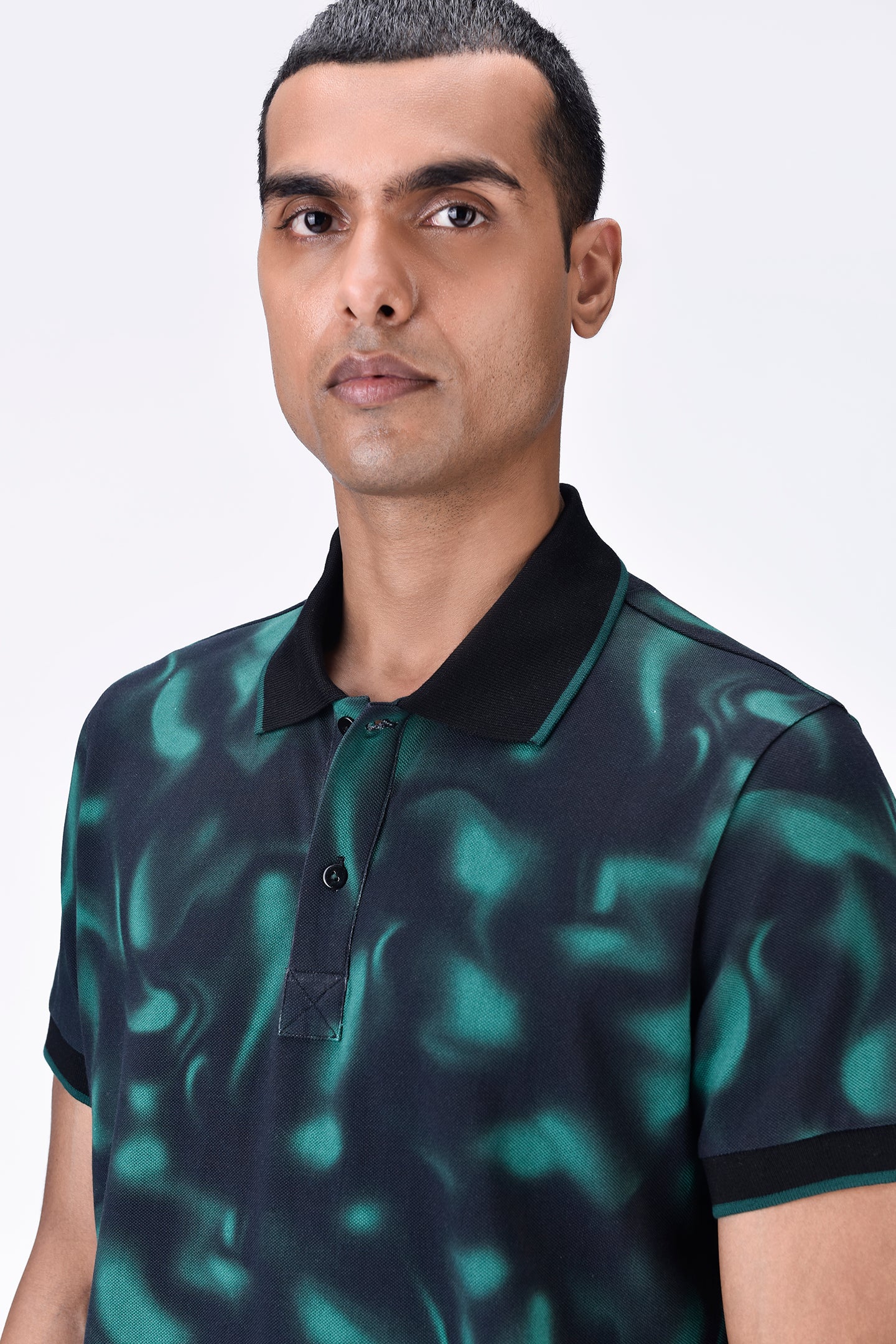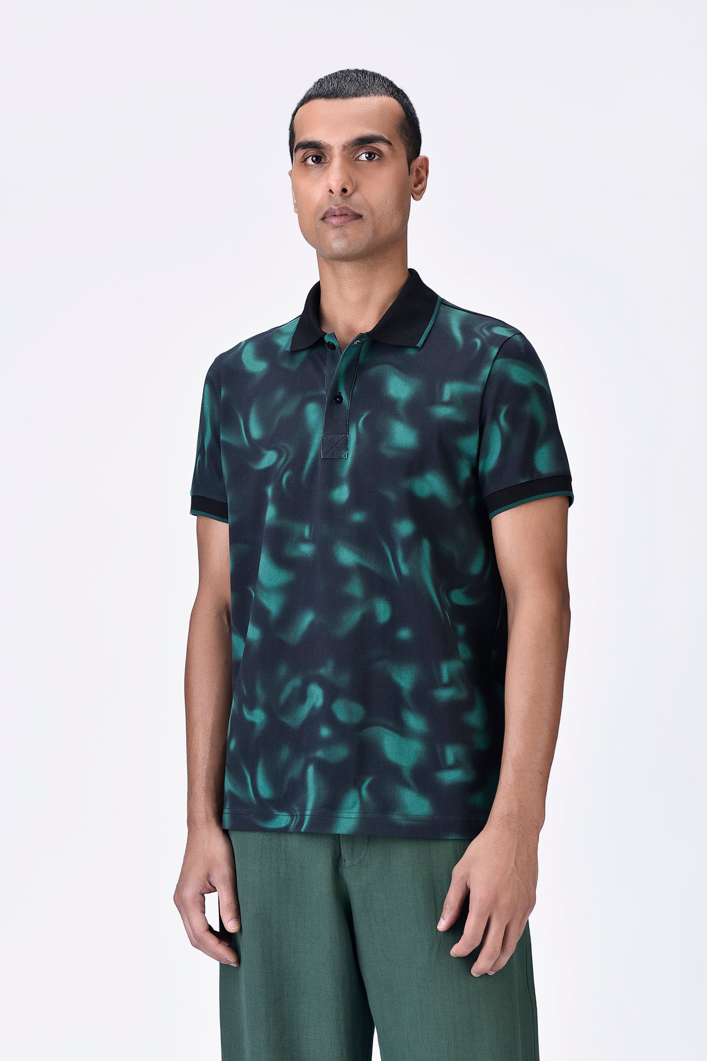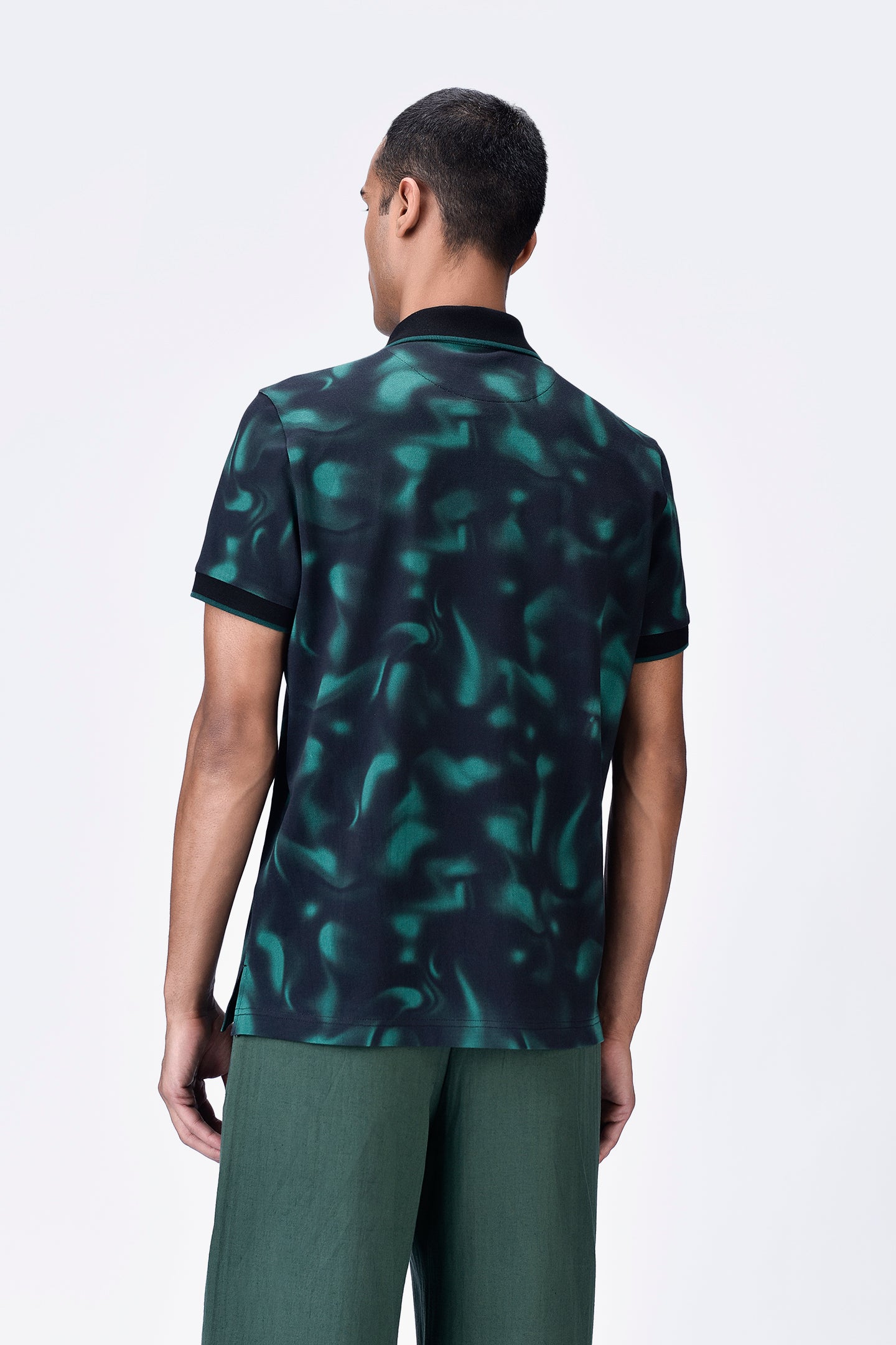 Classic black-green polo in cotton pique with a regular fit, featuring a vibrant aurora print and contrast collar and cuff tipping for a stylish touch.