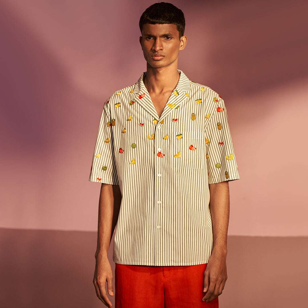 Easy-Fit Striped Button-Up Shirt with Mixed Fruit Embroidery