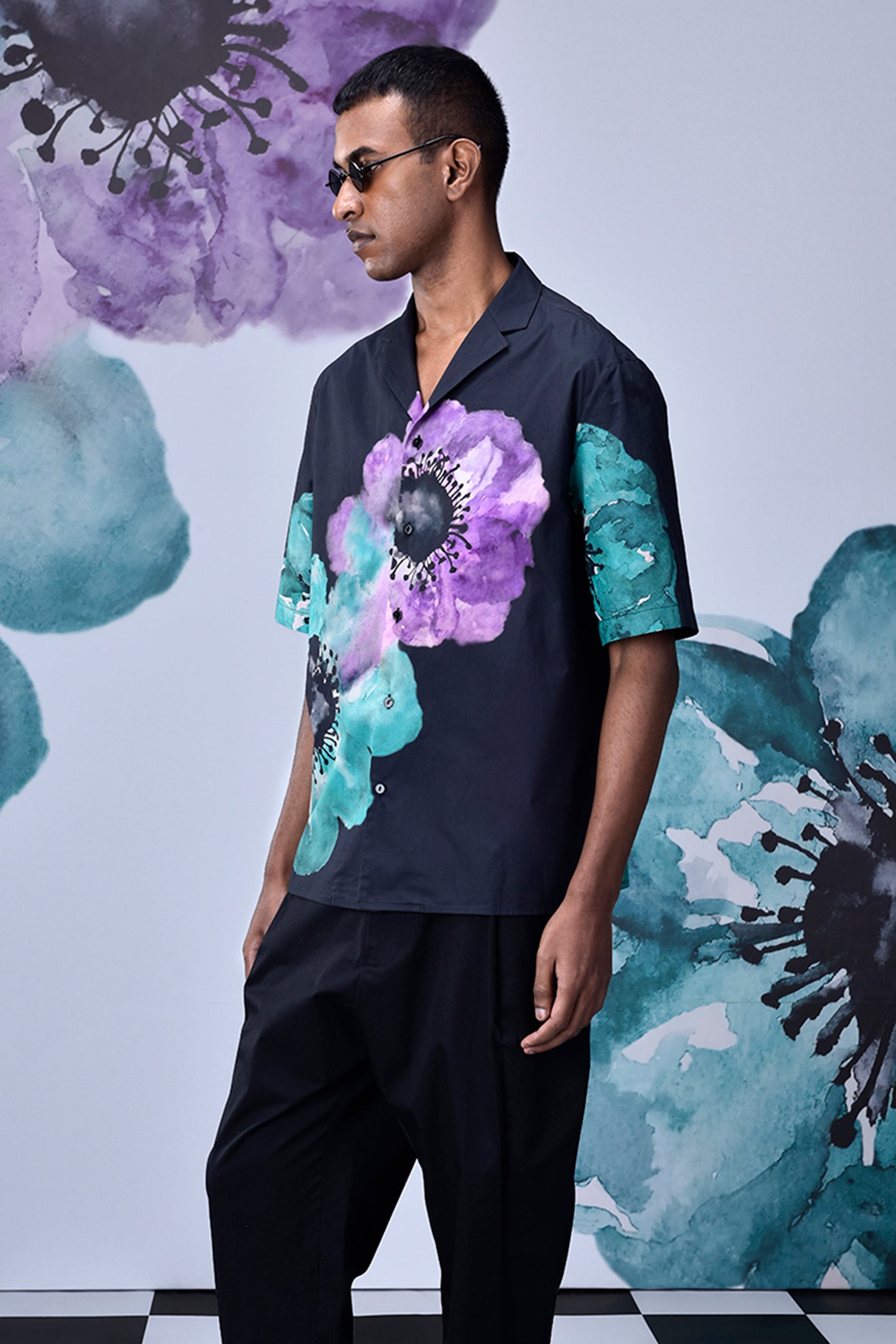 Anemone Flower Relax Fit Cuban Shirt- Green