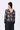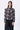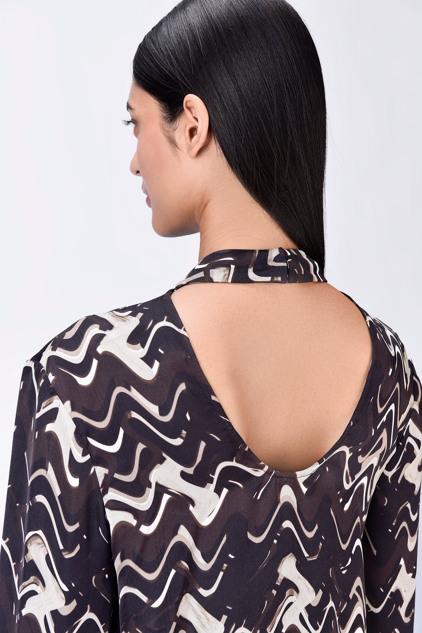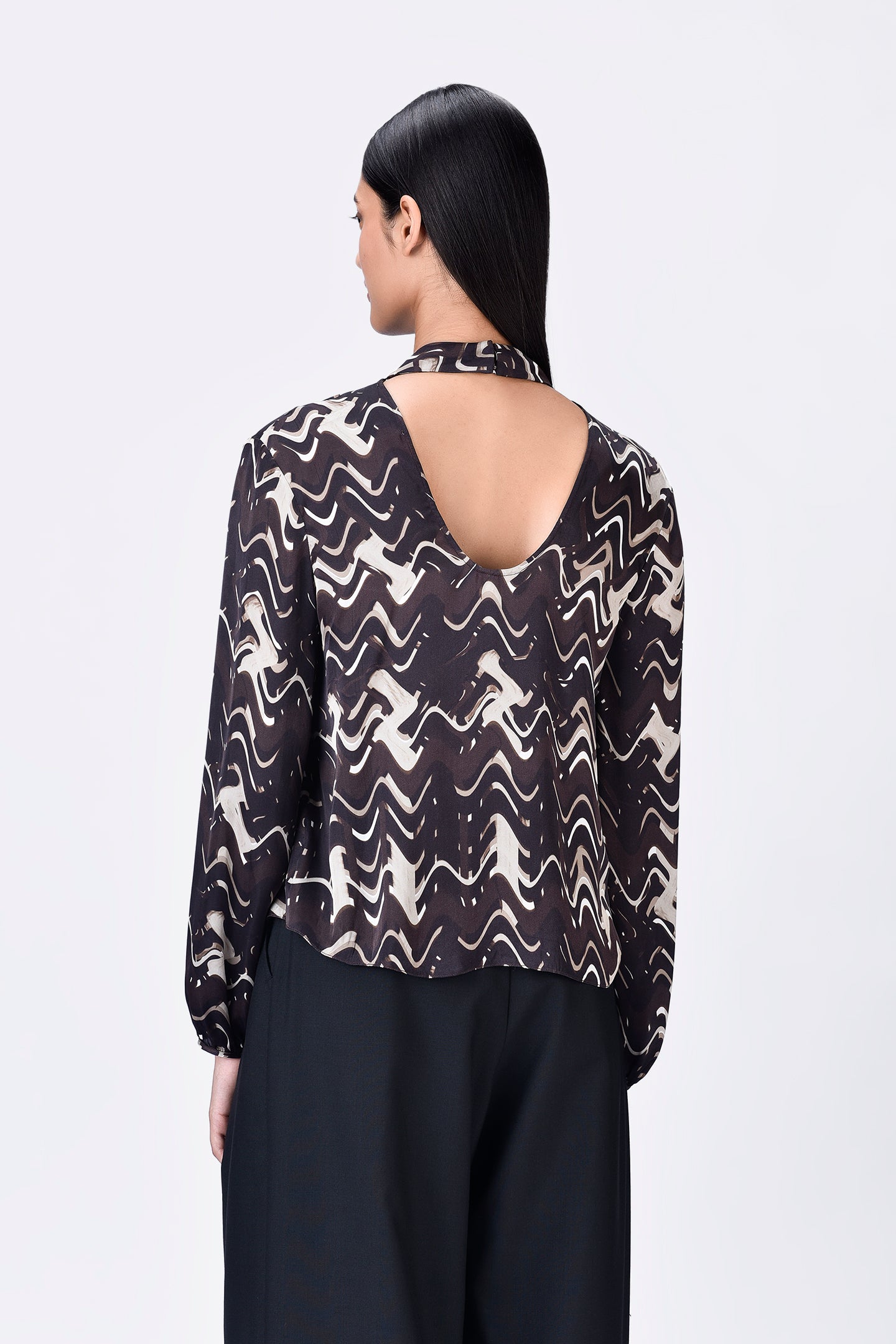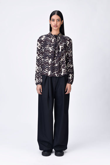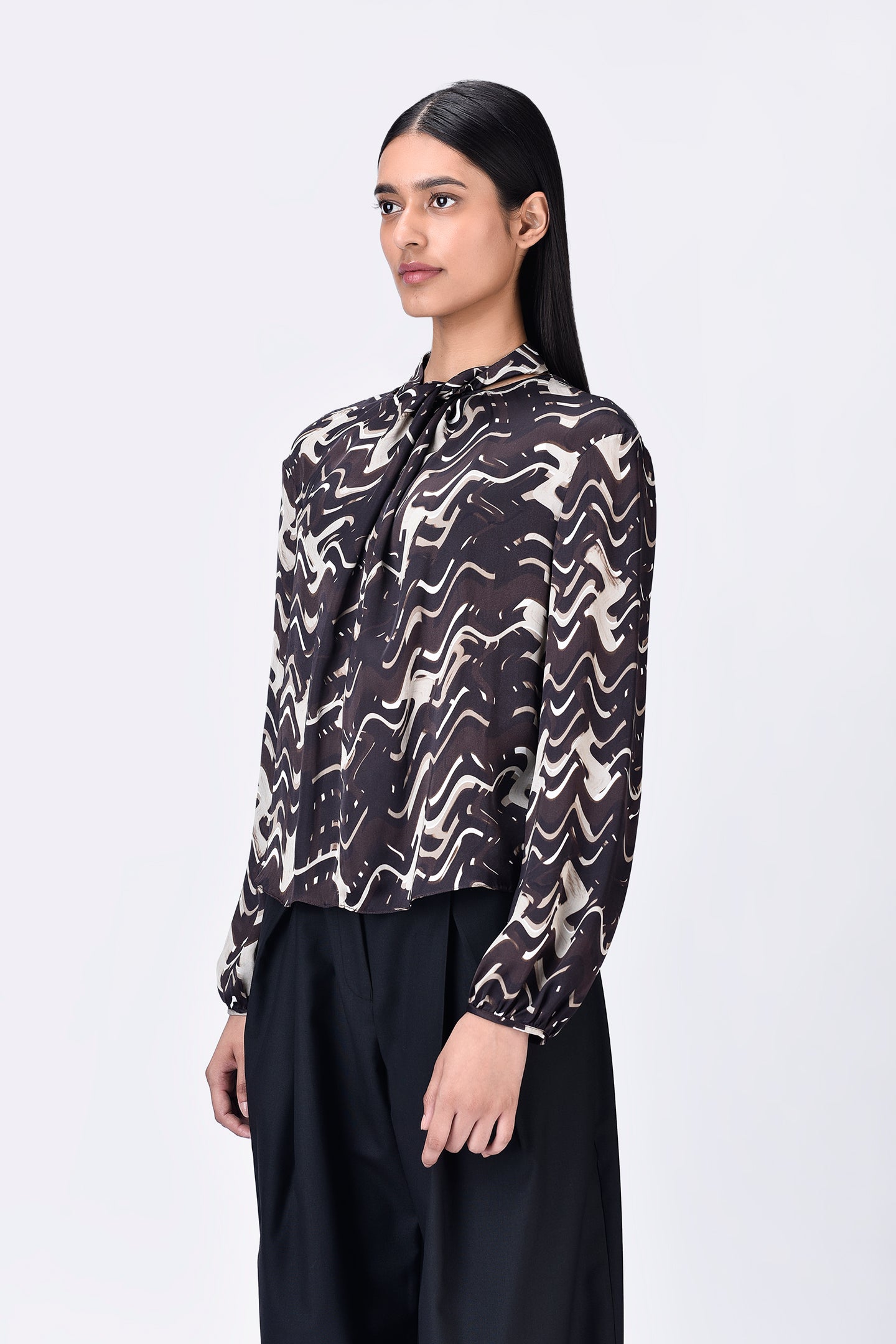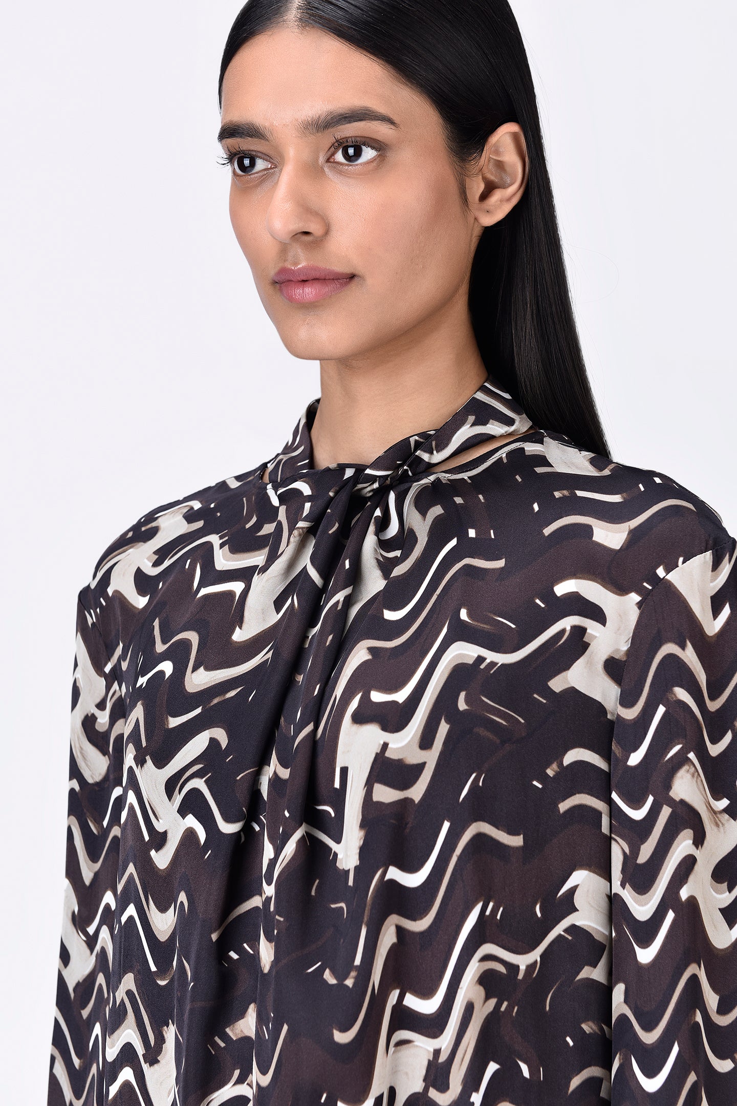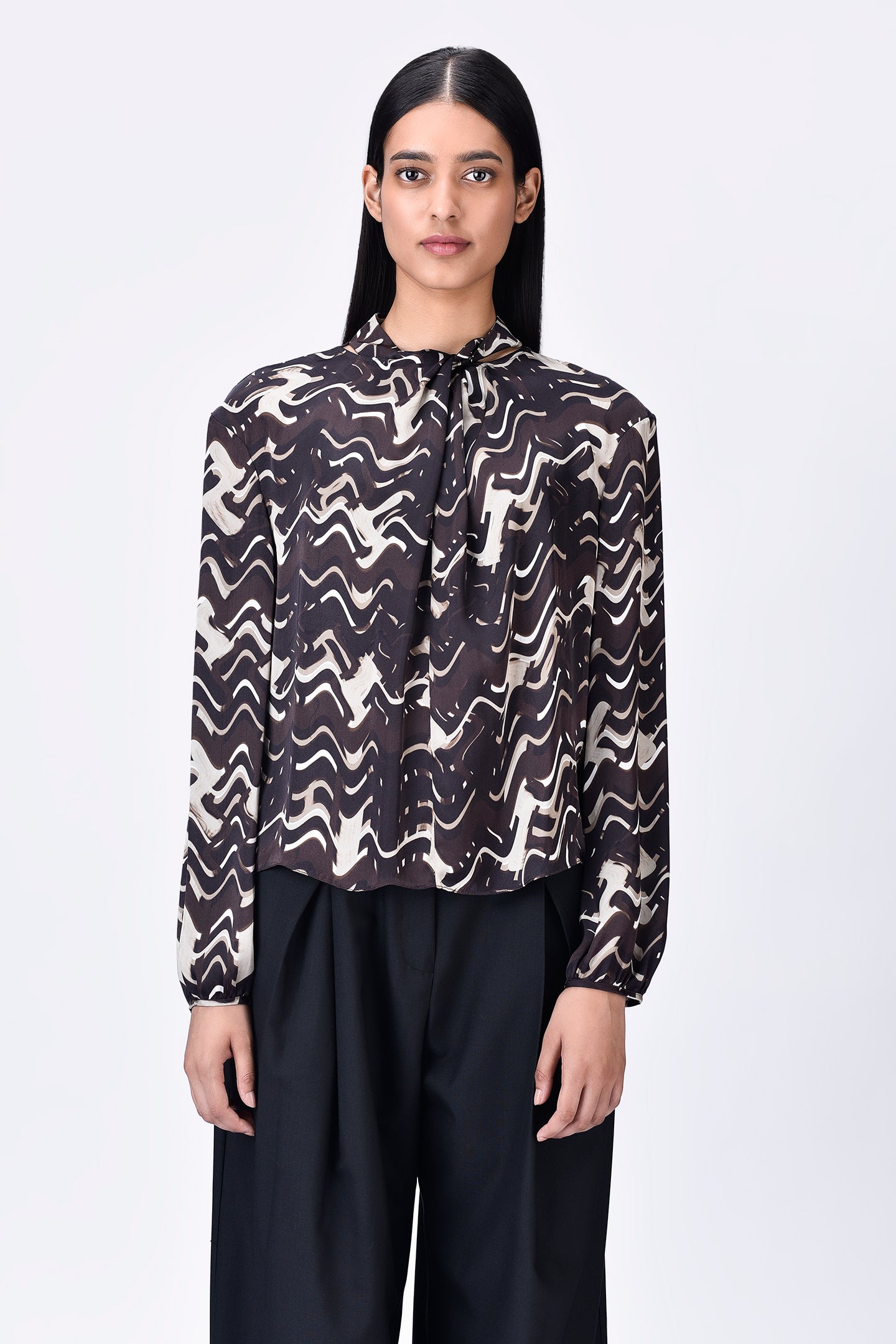 Regular fit viscose satin top in chocolate brown, featuring a draped silhouette, band collar, and gathered sleeve hems in a unique solar wave check print.