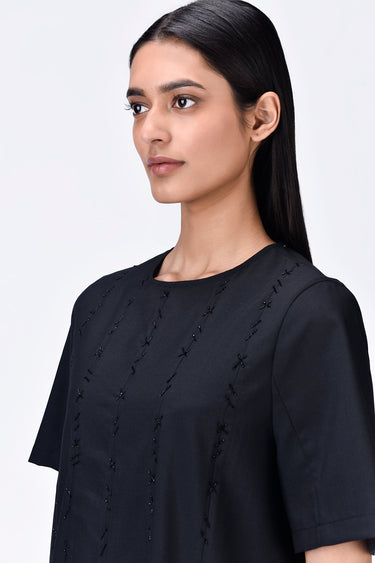 Clay Poly Wool Straight Fit Paneled Dress with Beads Embroidery