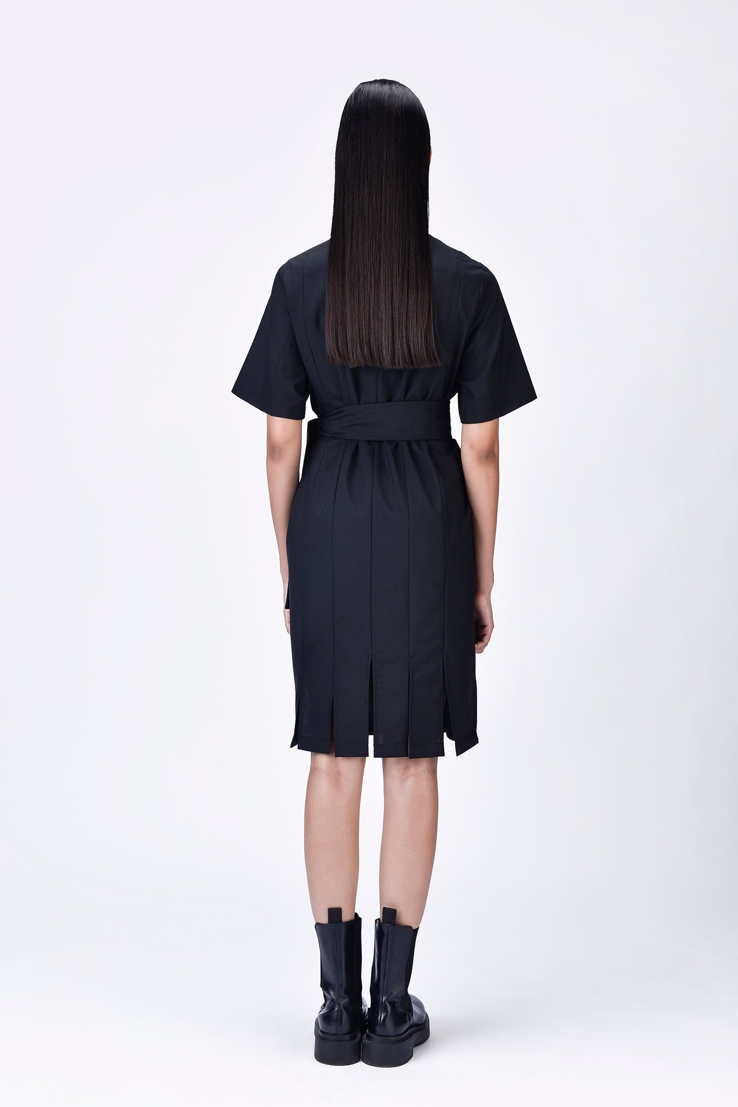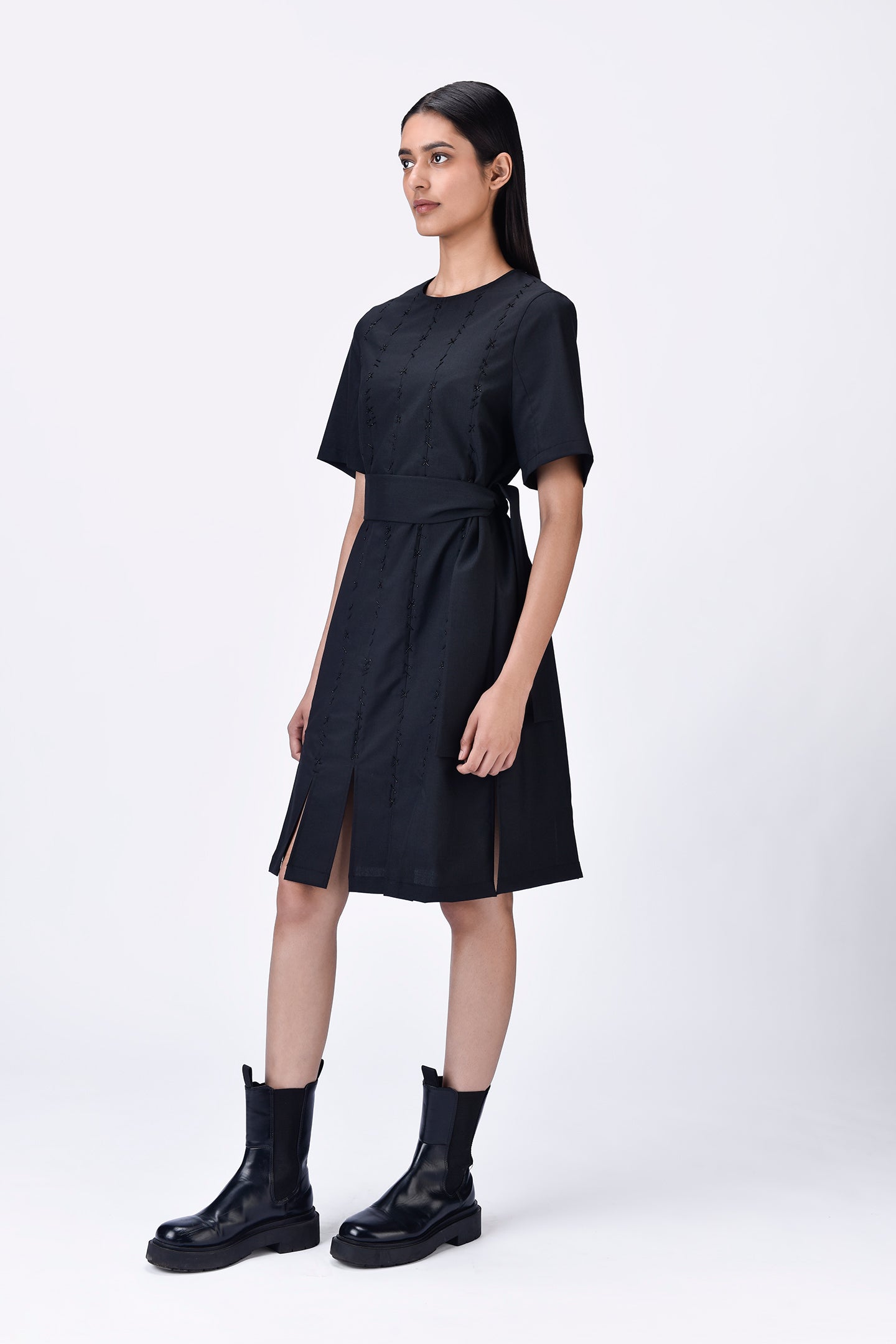 Straight fit clay poly wool dress, featuring panel details, a tie-up waist, and beads embroidery highlights on the seams.