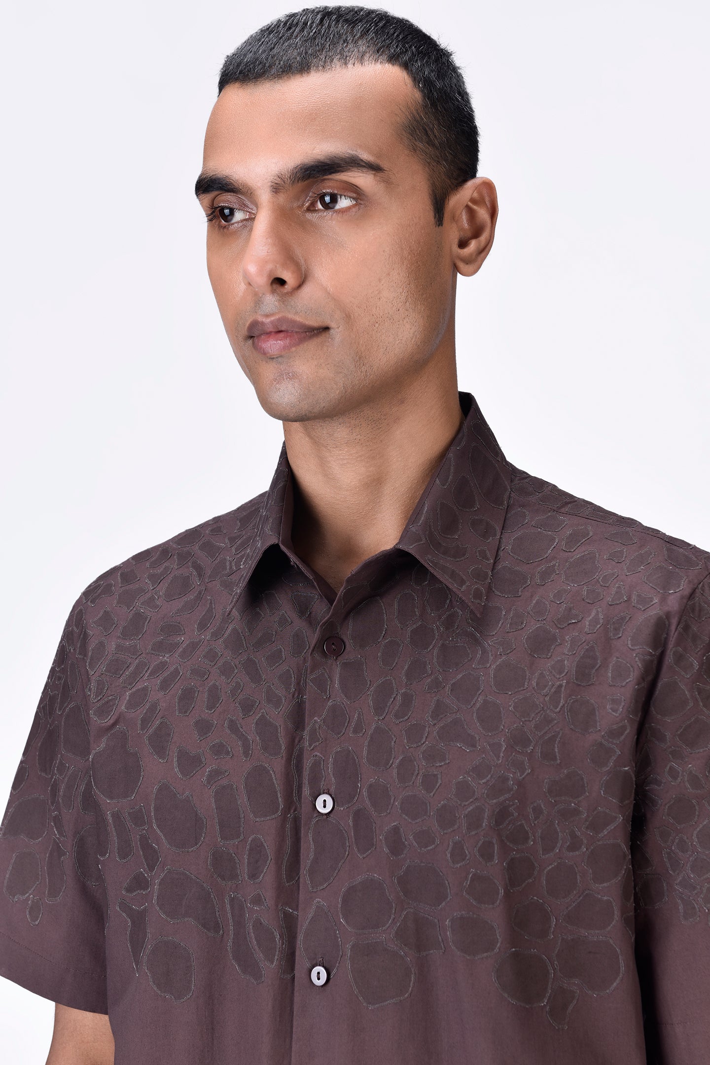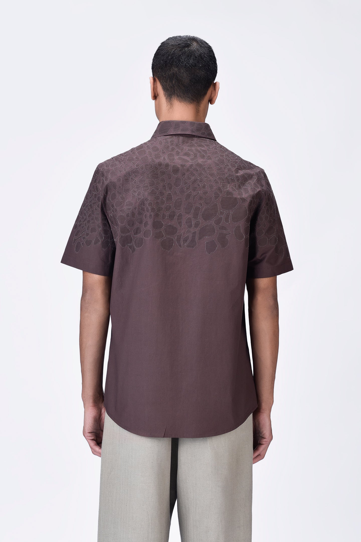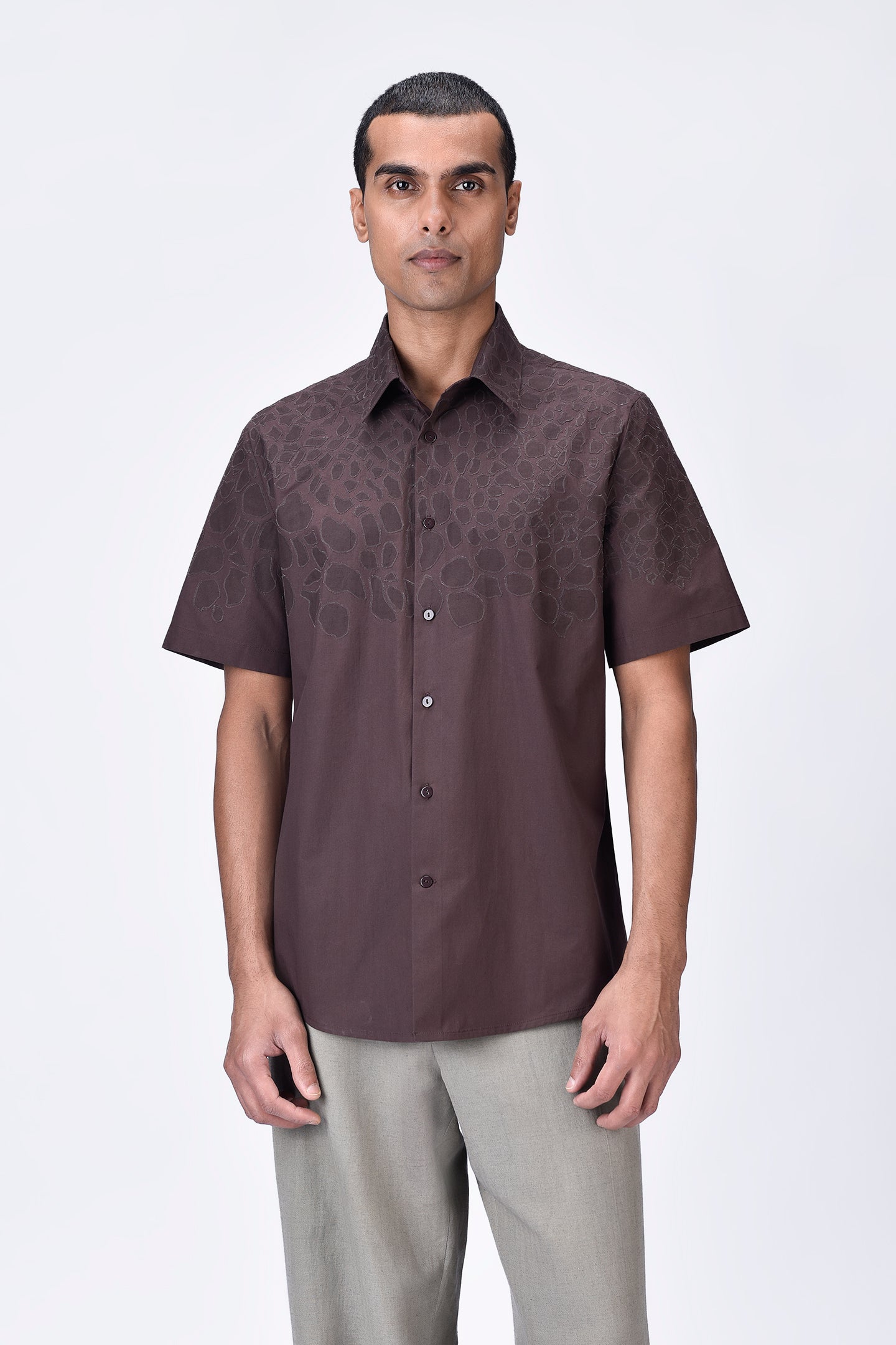 Regular-fit button-down half sleeve shirt in Giza cotton poplin, featuring tonal micro cell applique embroidery placement for a subtle yet refined look.